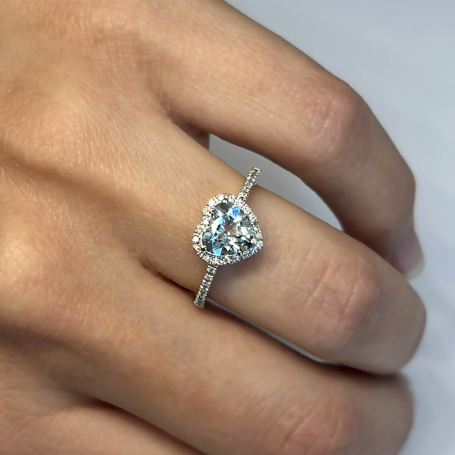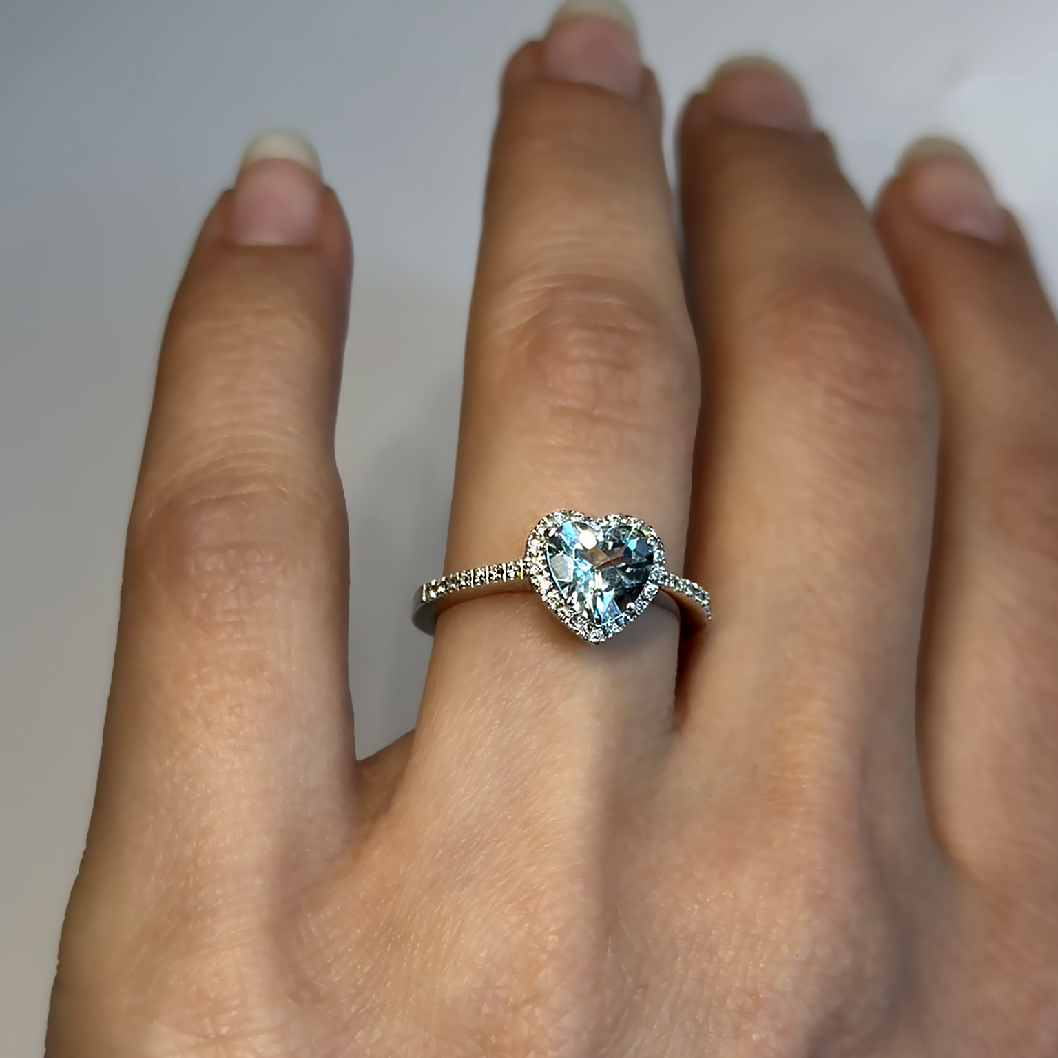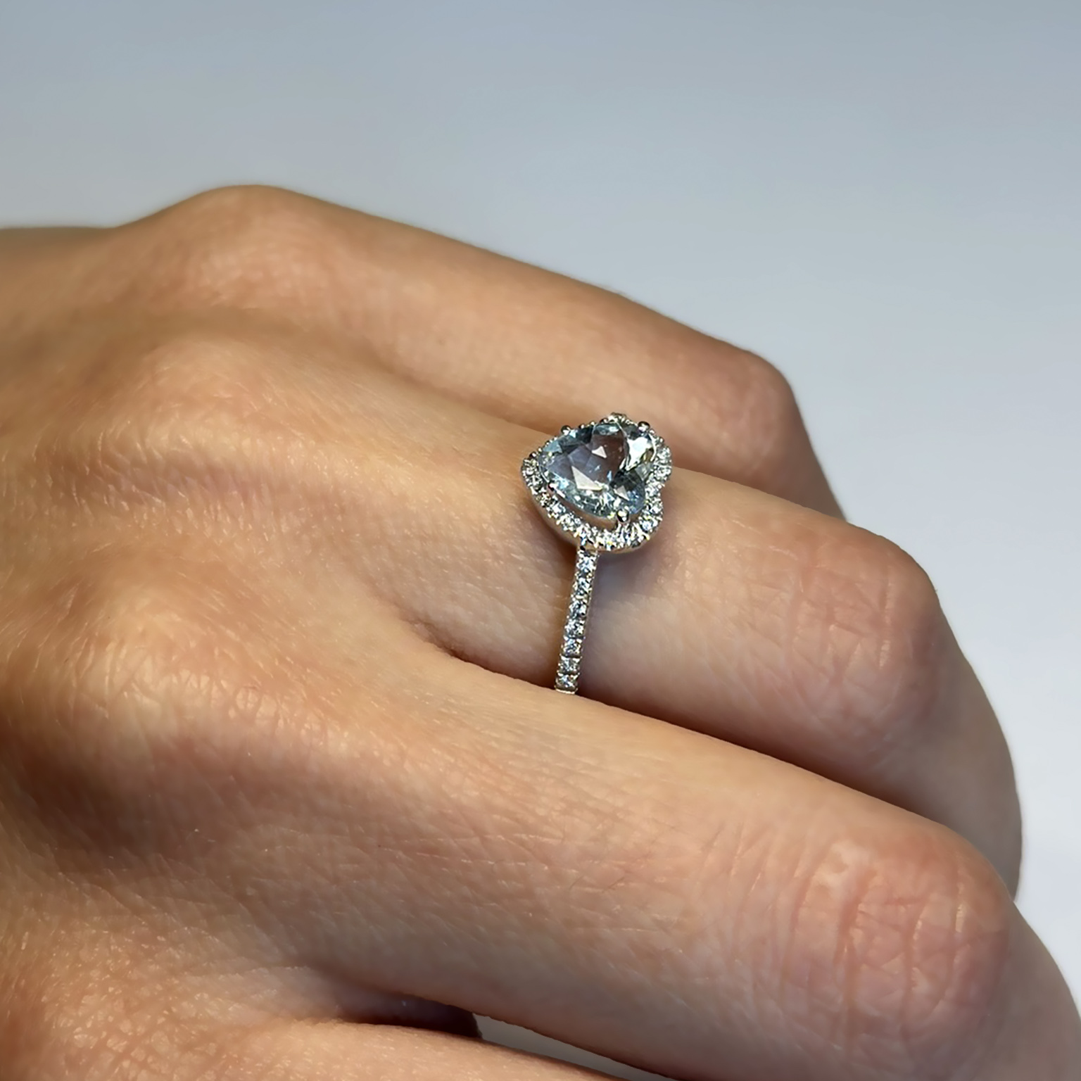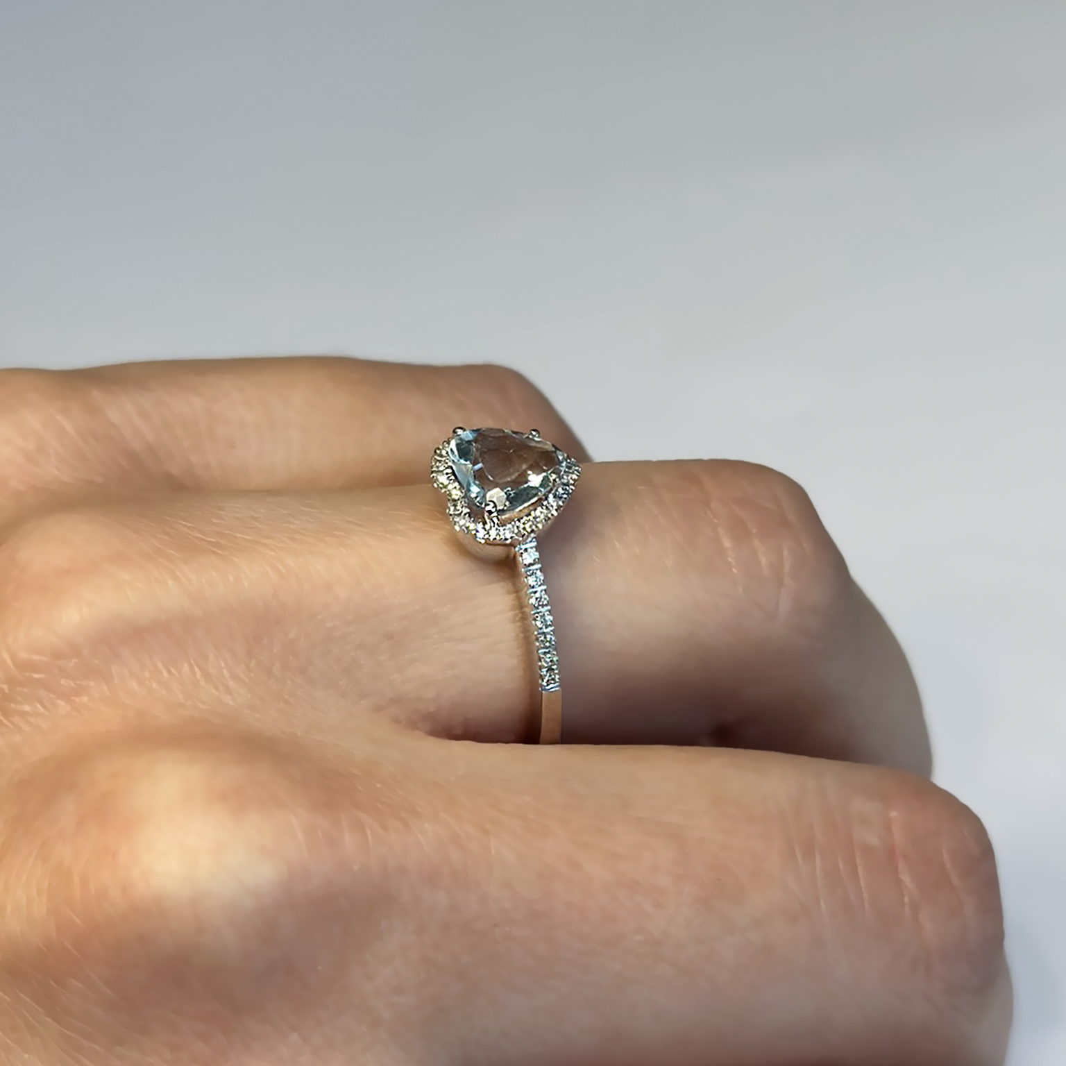 Anello in oro bianco 18kt con acquamarina taglio cuore ct 0.96 e diamanti taglio brillante totale ct 0.14 G SI