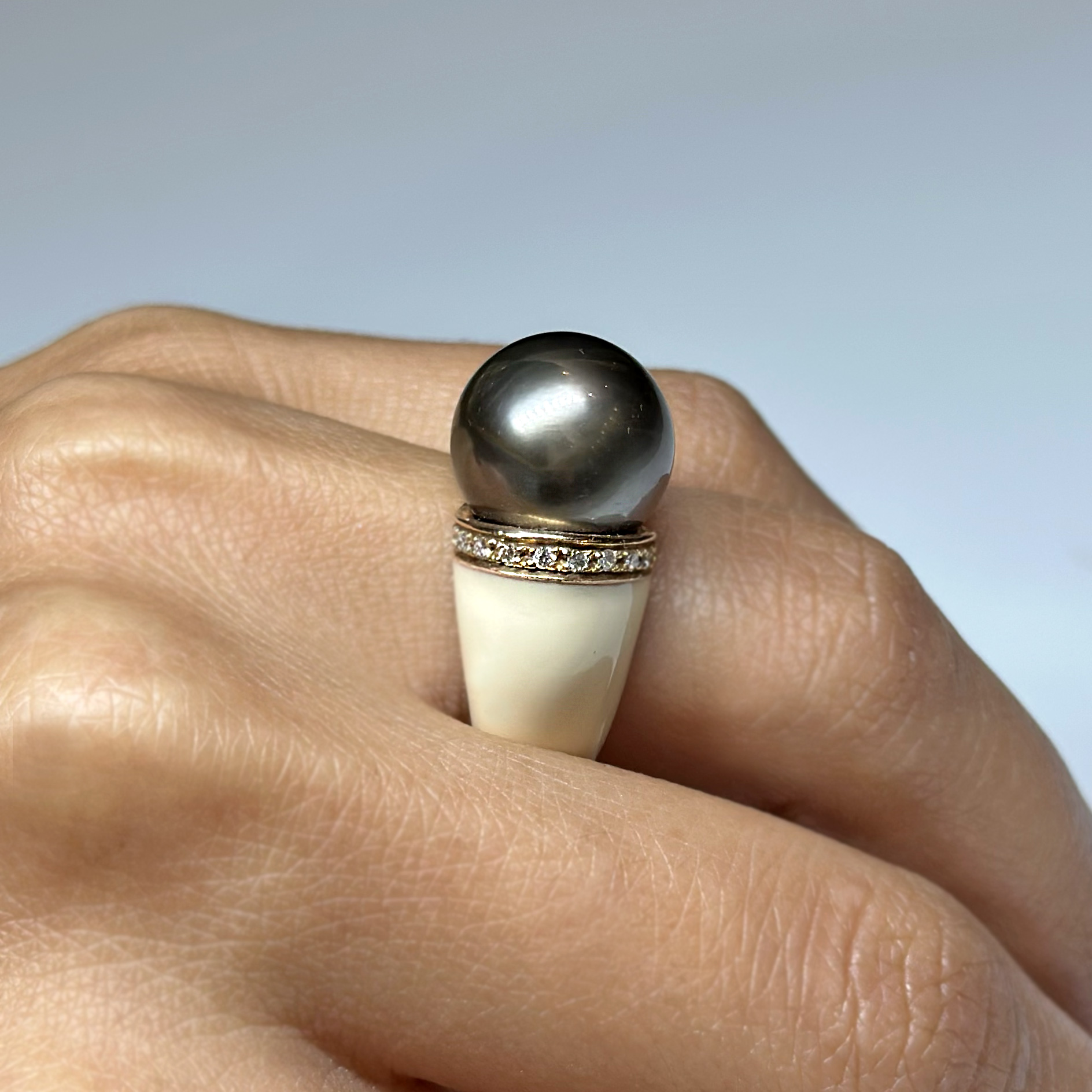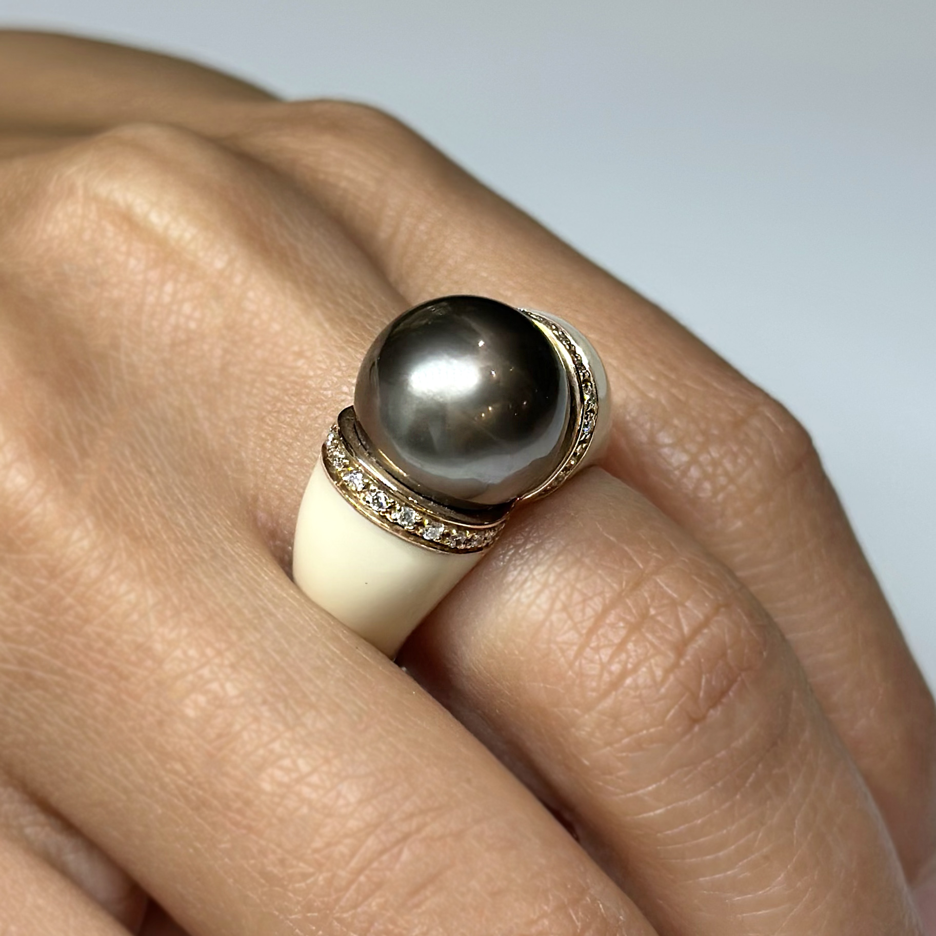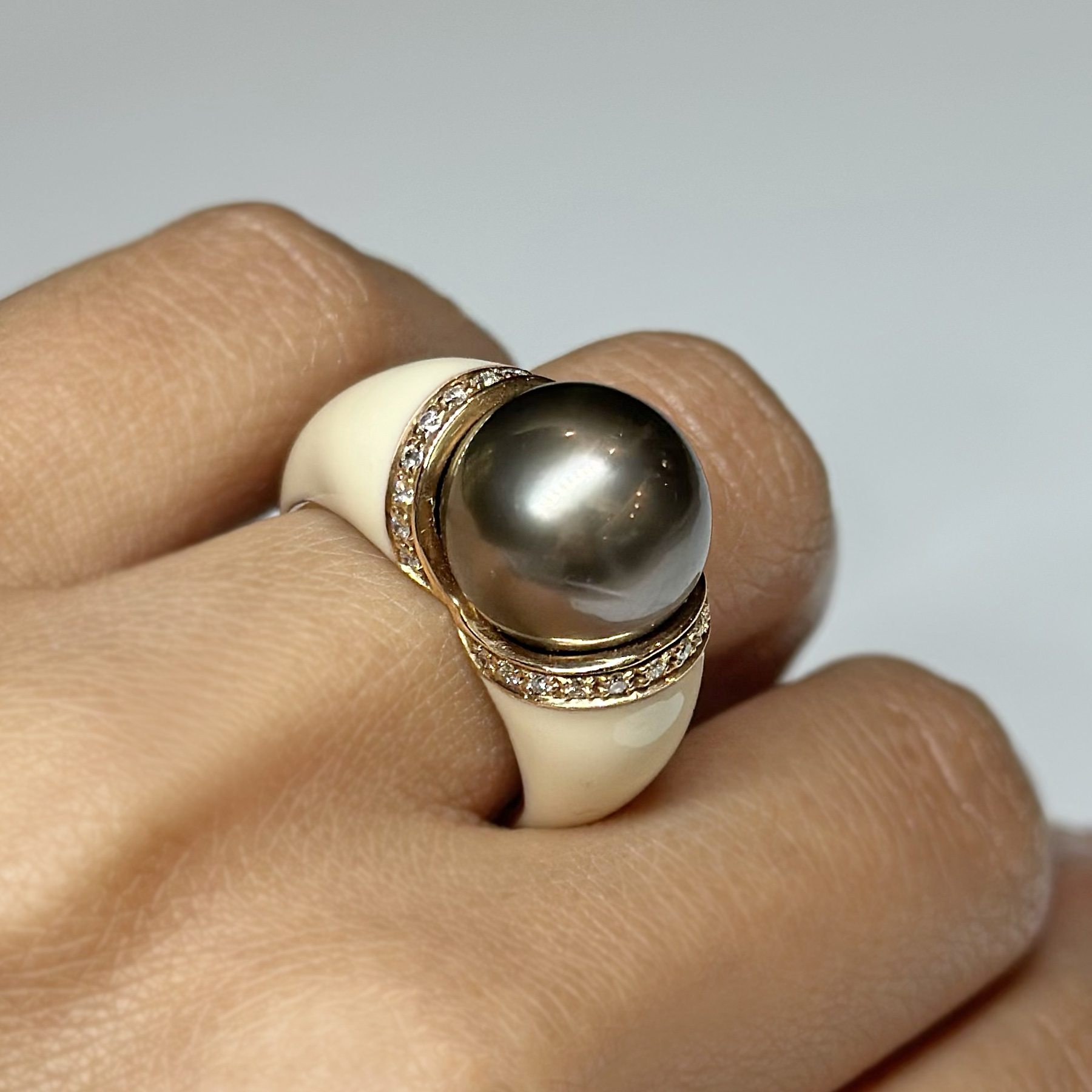 Anello Oro 18k Perla Tahiti, Diamanti e Smalto