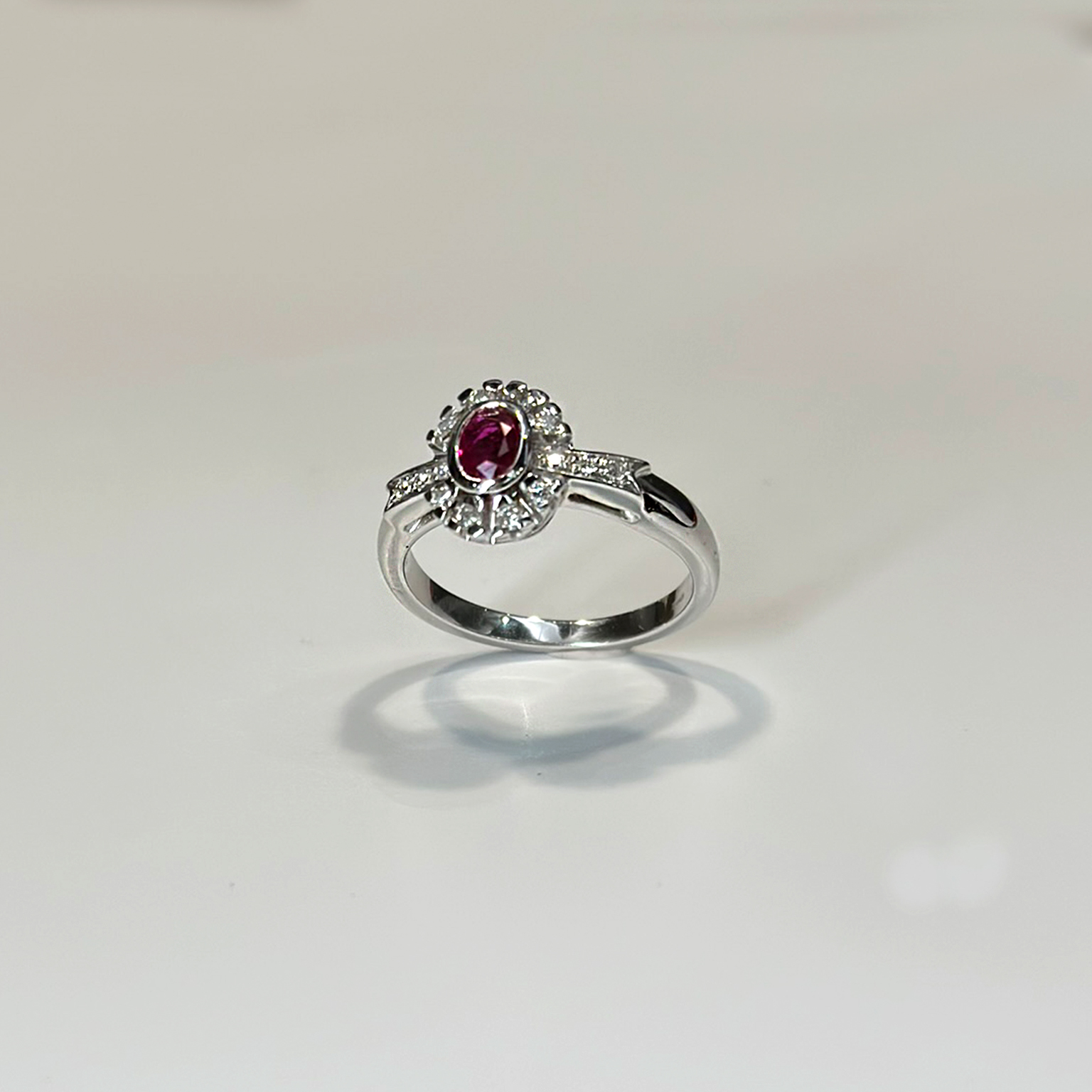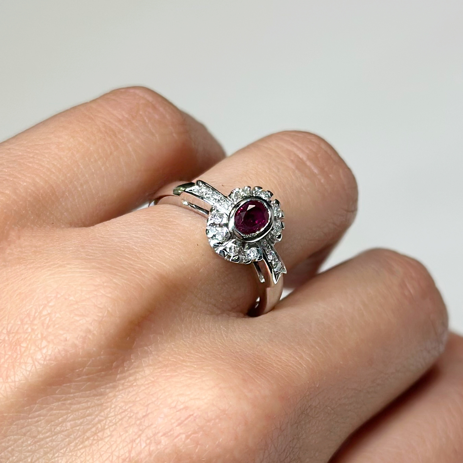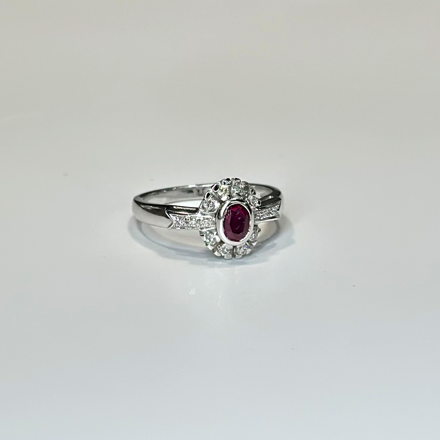Anello in oro bianco 18kt con rubino ct 0.48 e diamanti taglio brillante totale ct 0.10