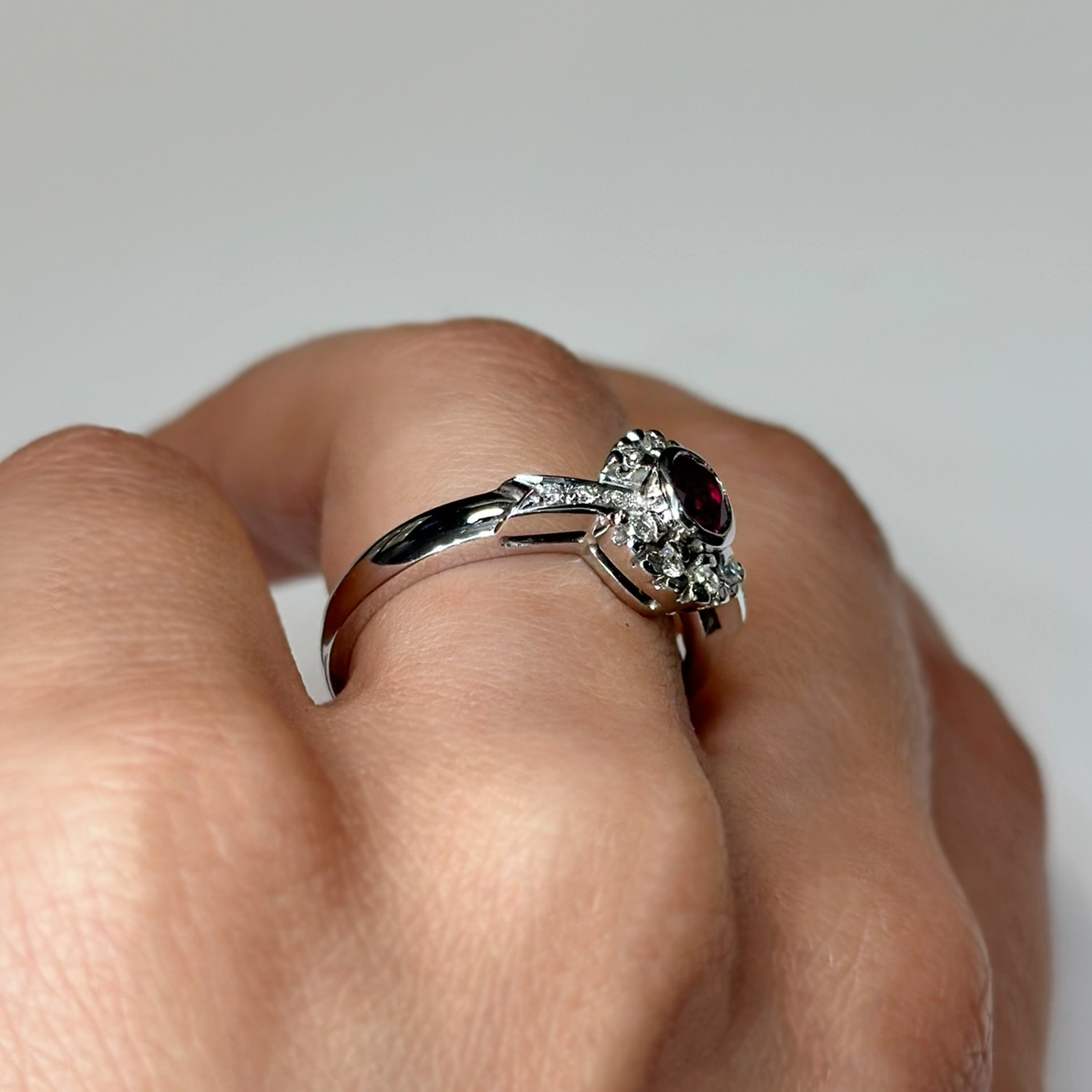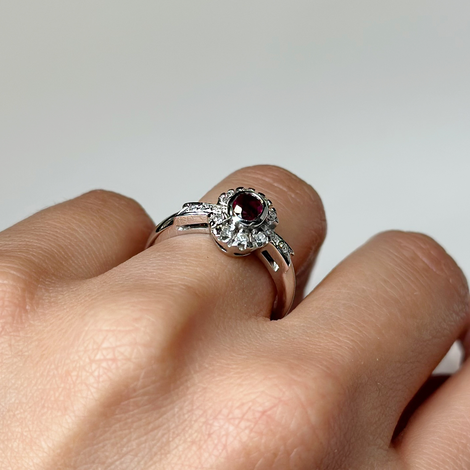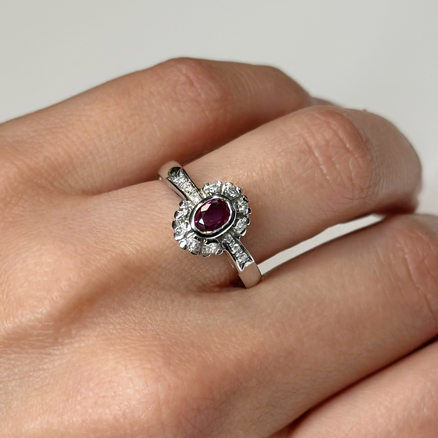 Anello in oro bianco 18kt con rubino ct 0.48 e diamanti taglio brillante totale ct 0.10