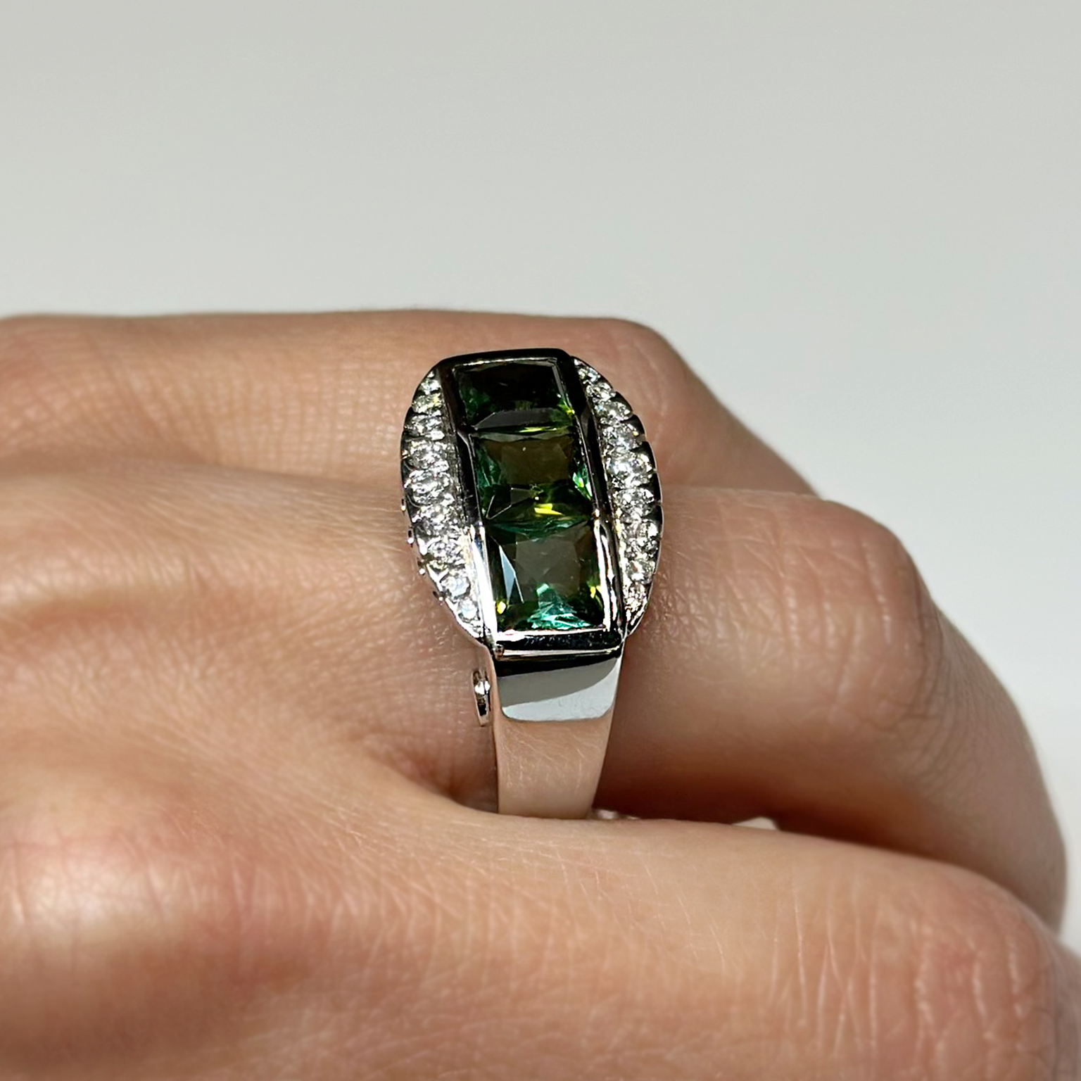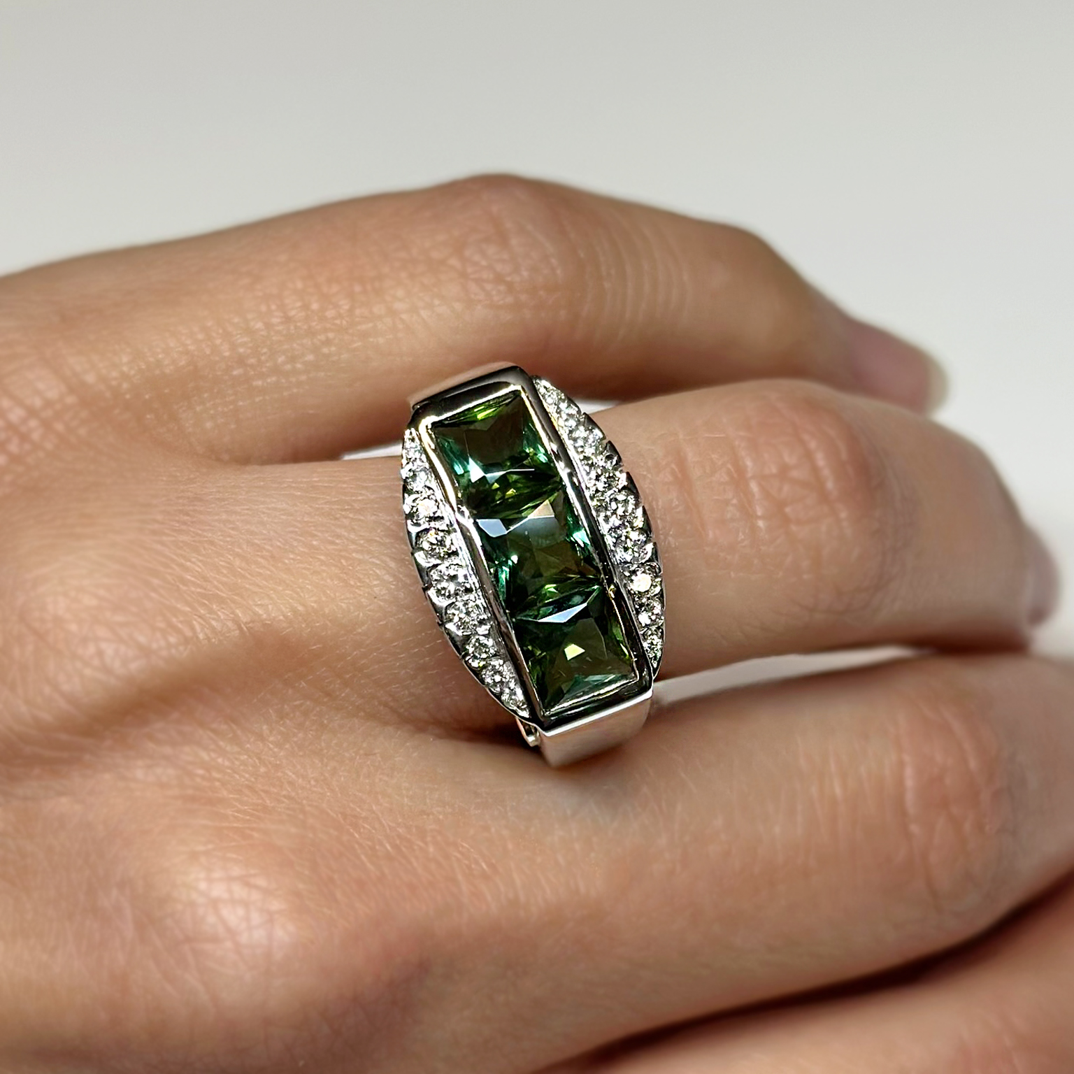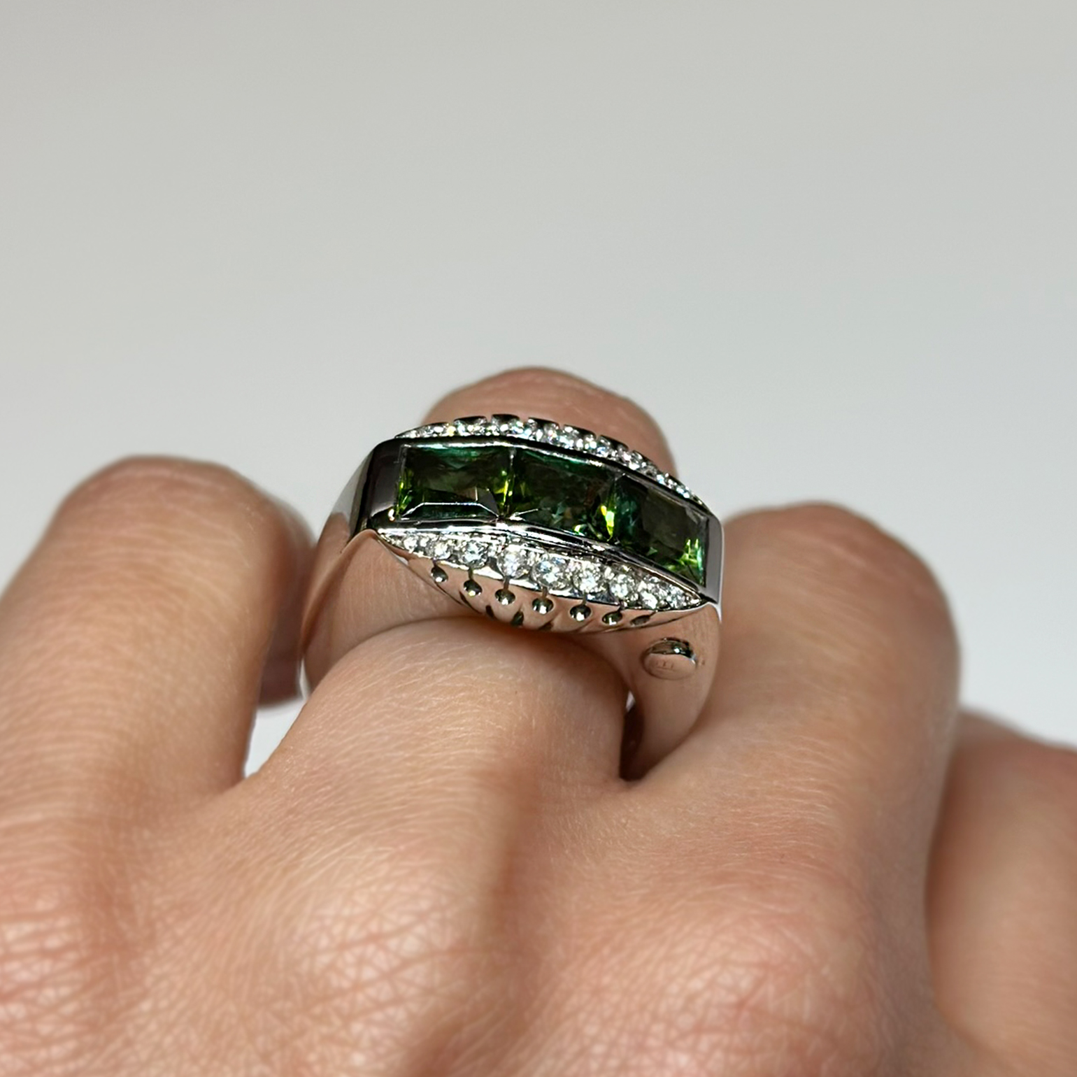 Anello Ponte Vecchio Gioielli in oro bianco 18kt con tormaline verdi taglio carrè totale ct 3.30 e diamanti taglio brillante totale ct 0.32