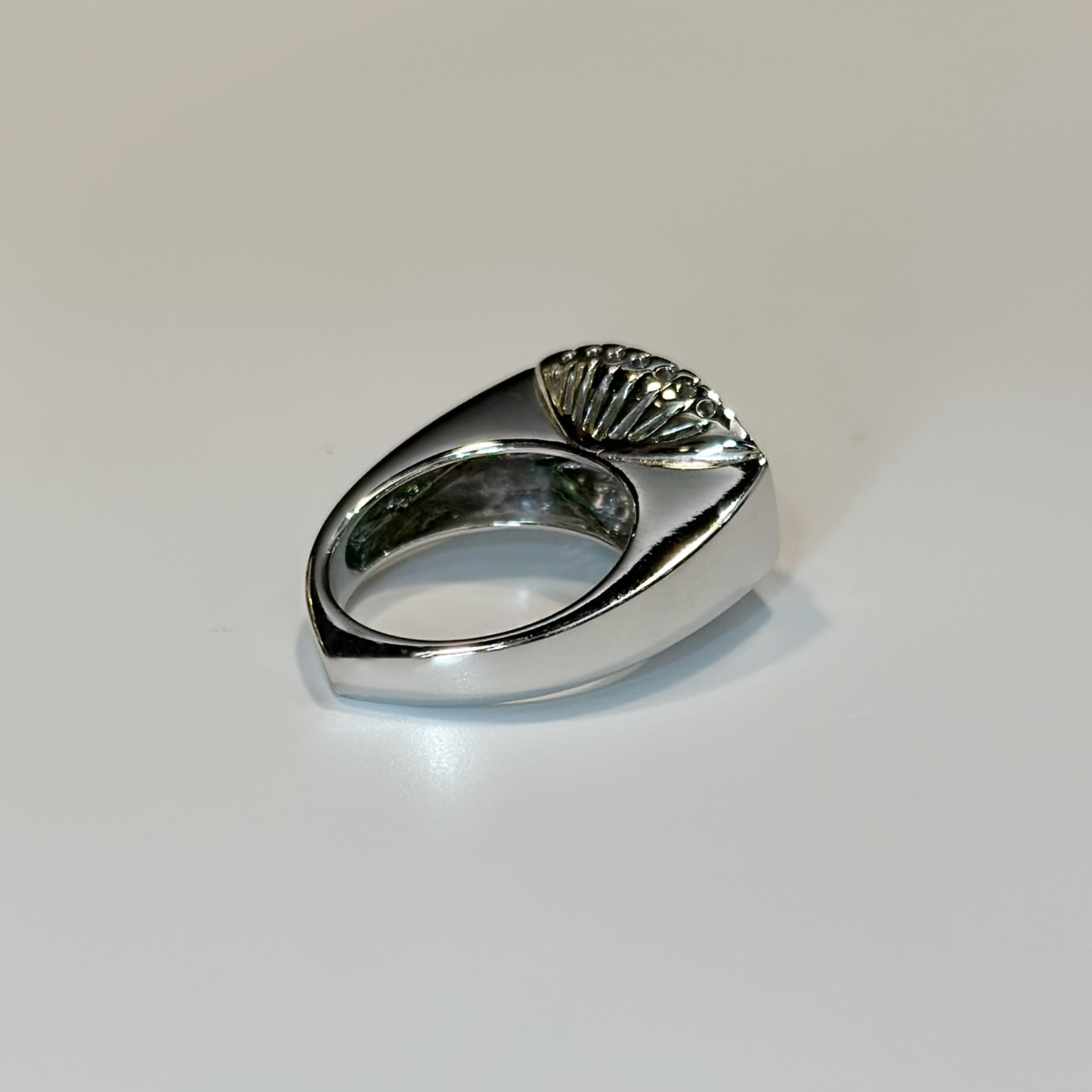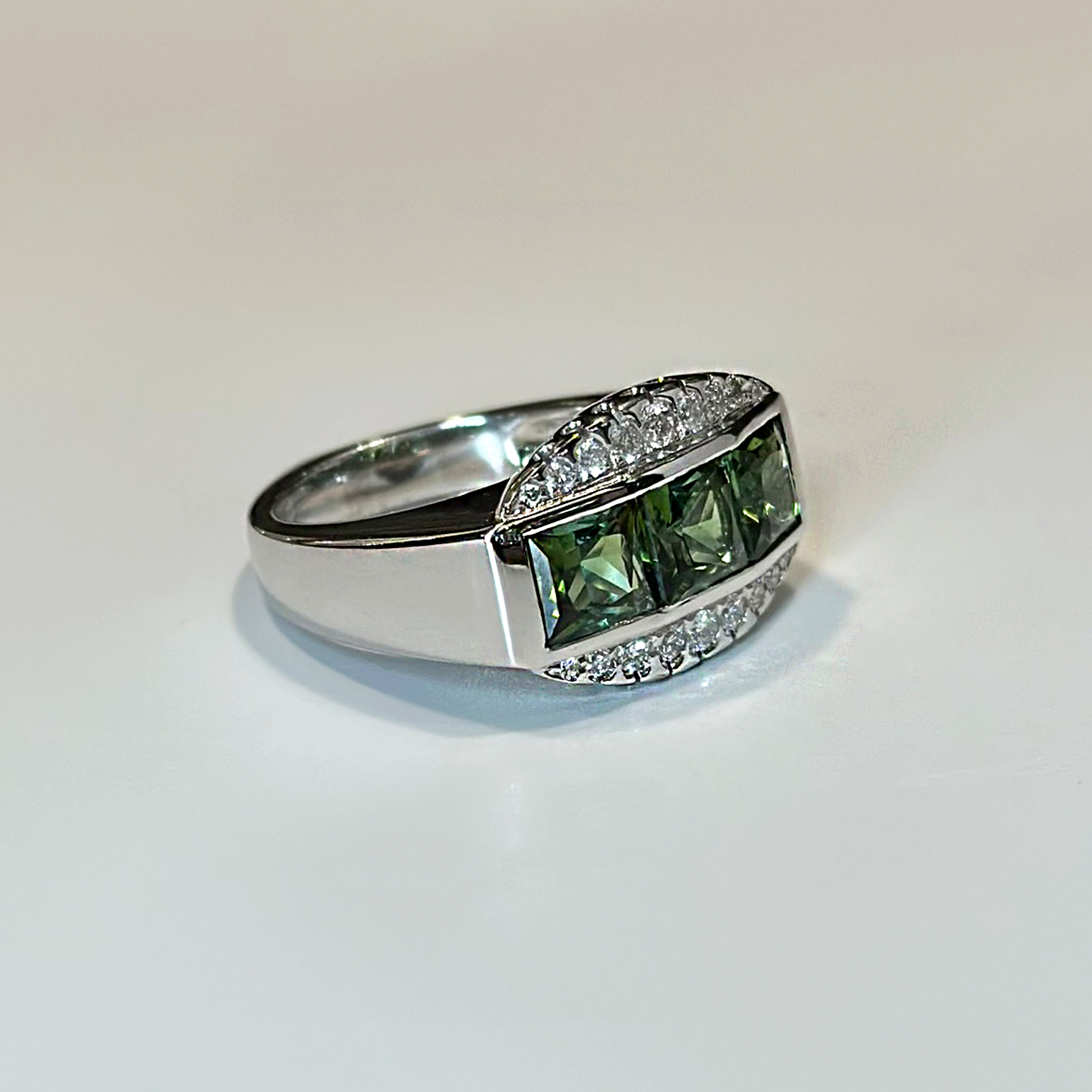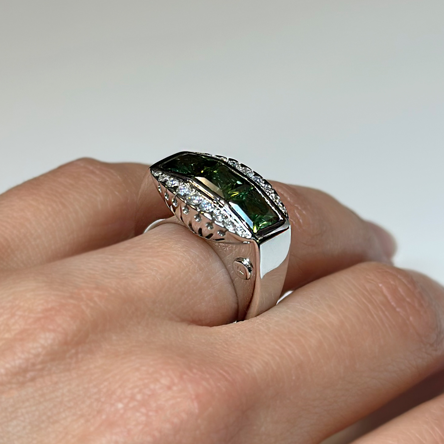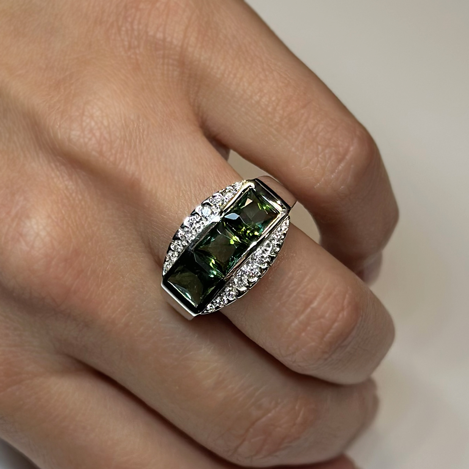Anello Ponte Vecchio Gioielli in oro bianco 18kt con tormaline verdi taglio carrè totale ct 3.30 e diamanti taglio brillante totale ct 0.32