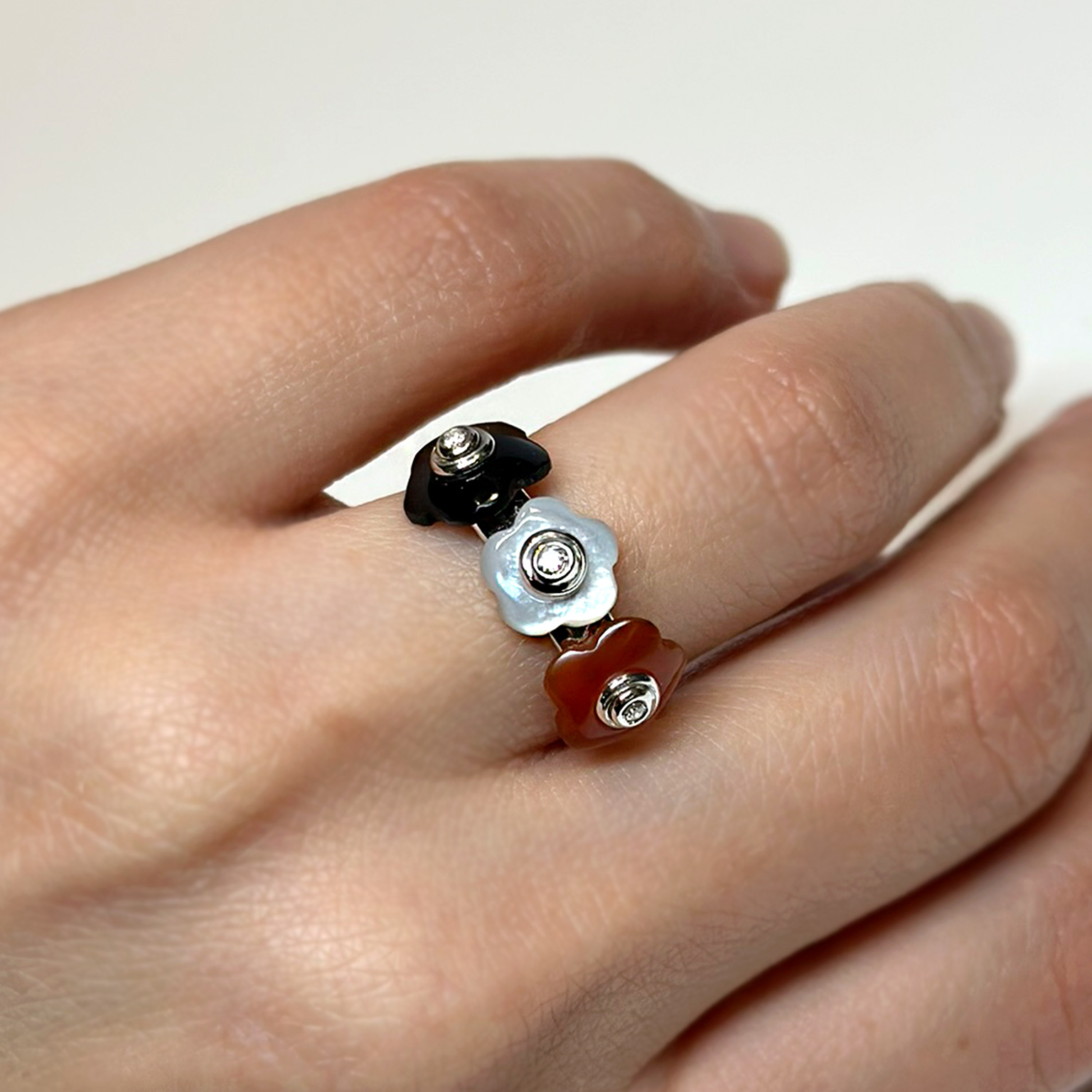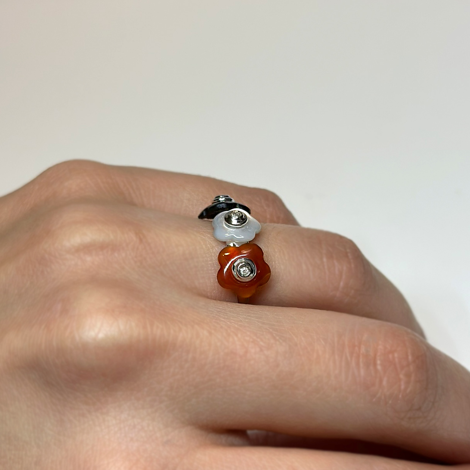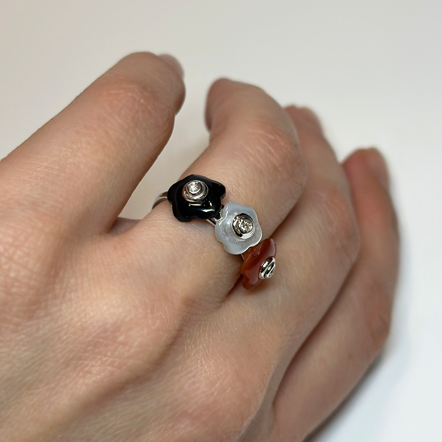 Anello Flavioro in oro bianco 18kt con tre fiori in onice, madreperla, corniola e diamanti taglio brillante.