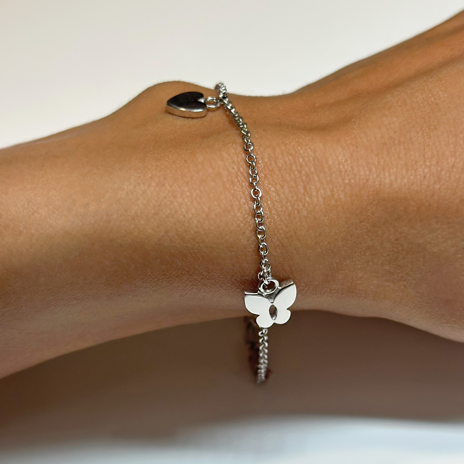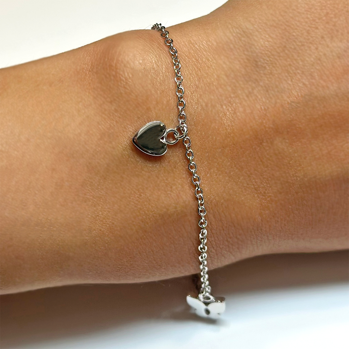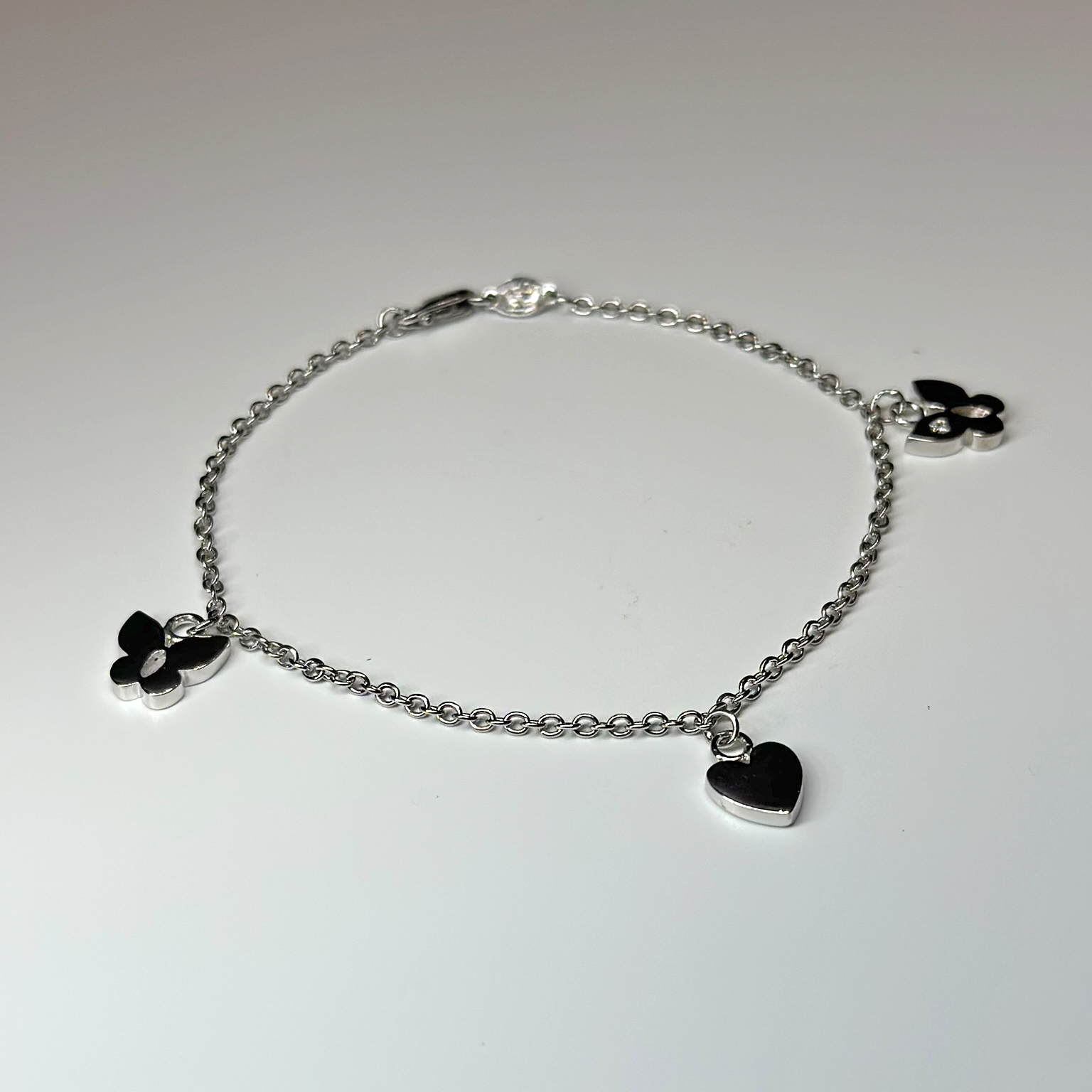 Bracciale in oro bianco 18kt con un ciondolo centrale a forma di cuore e due ciondoli laterali a forma di farfalle.