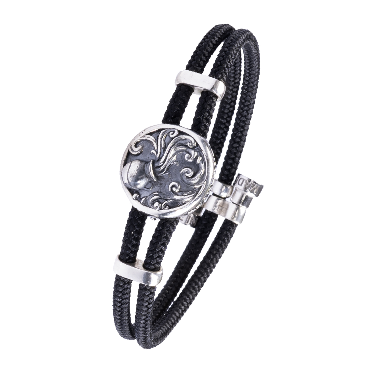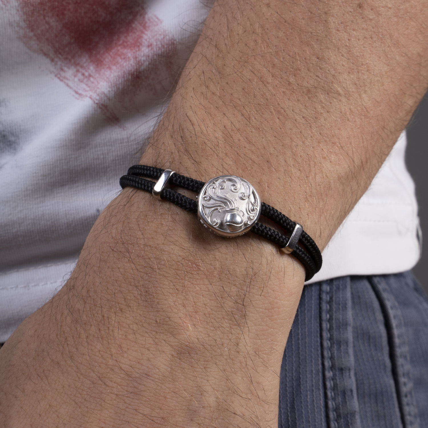 Bracciale unisex in argento brunito con sagola nera regolabile