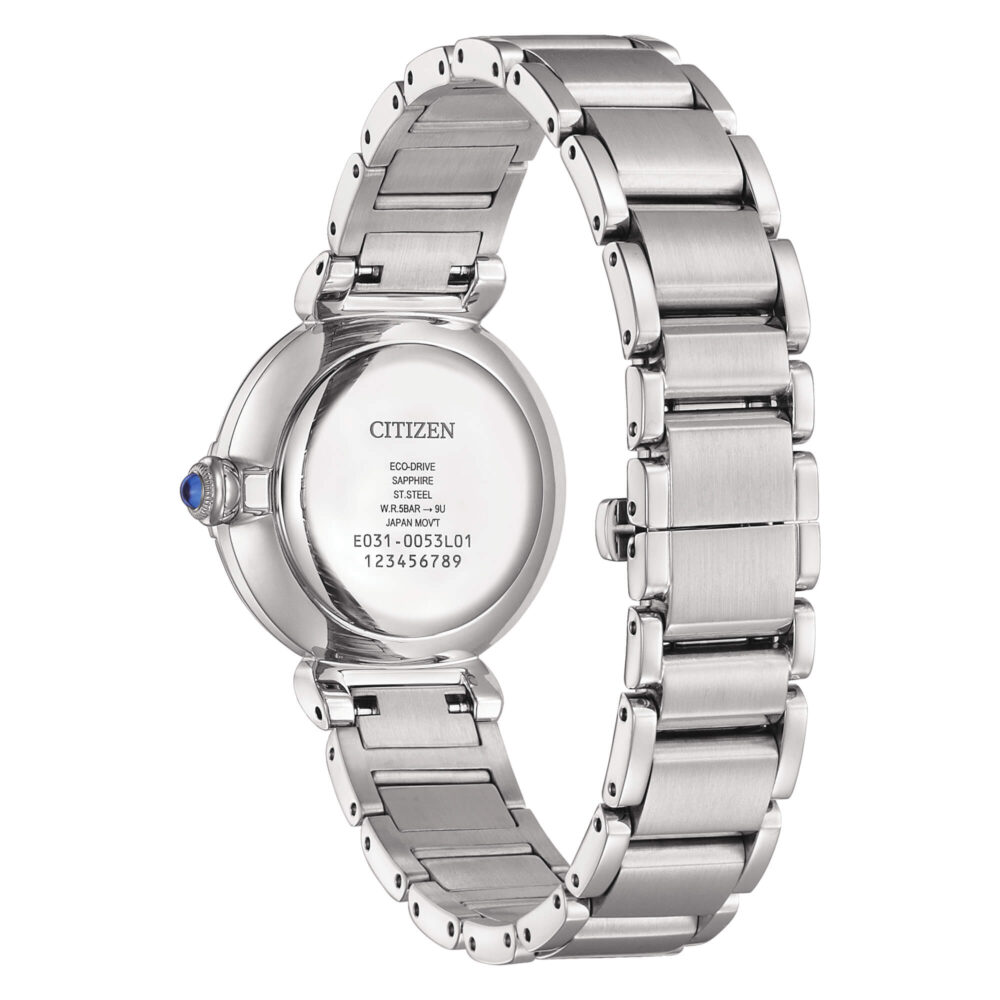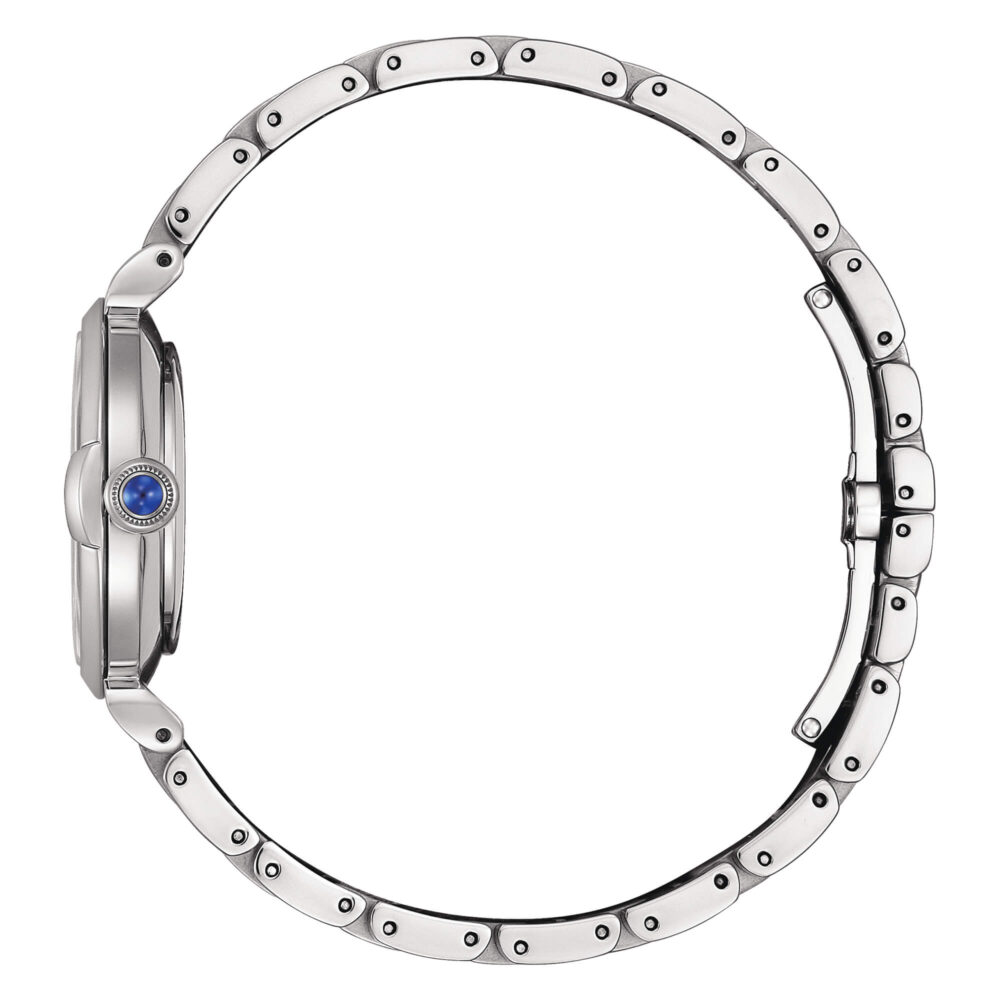 Cassa e bracciale in acciaio. Diamante sul quadrante ad ore 8. Corona decorata da cabochon. Vetro zaffiro convesso. WR 5 bar.