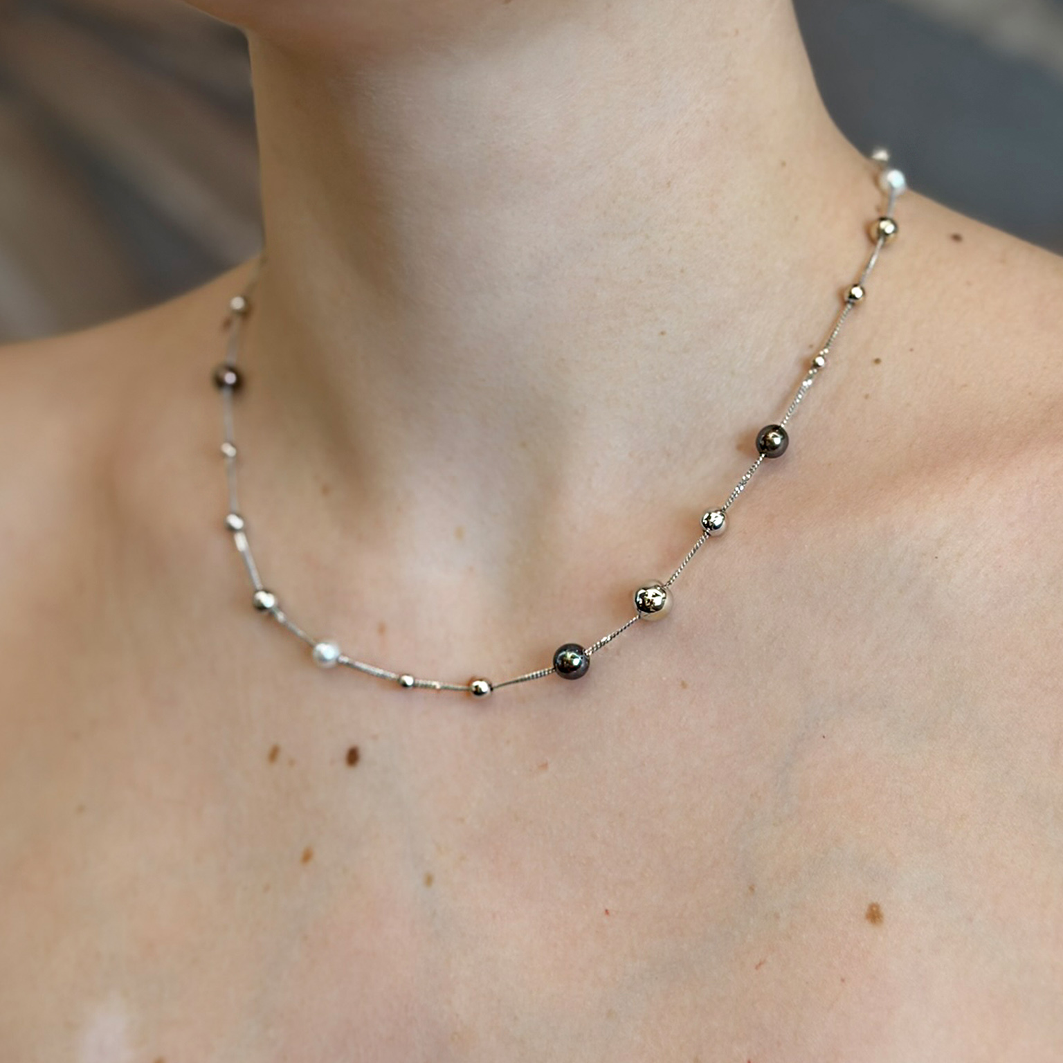 Collana in oro bianco 18kt con sfere oro di diverse dimensioni e perle di acqua dolce