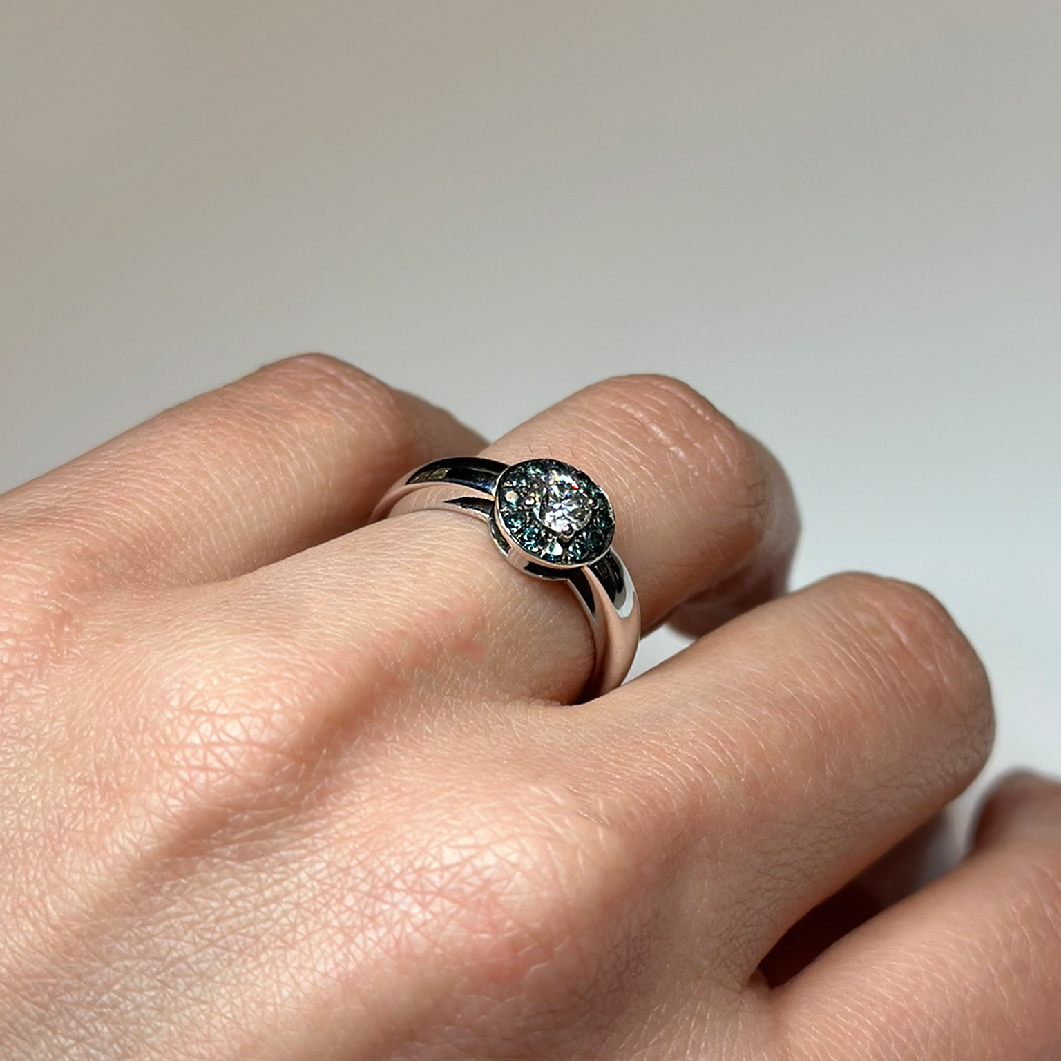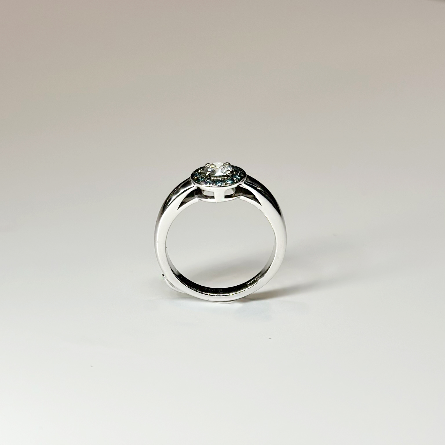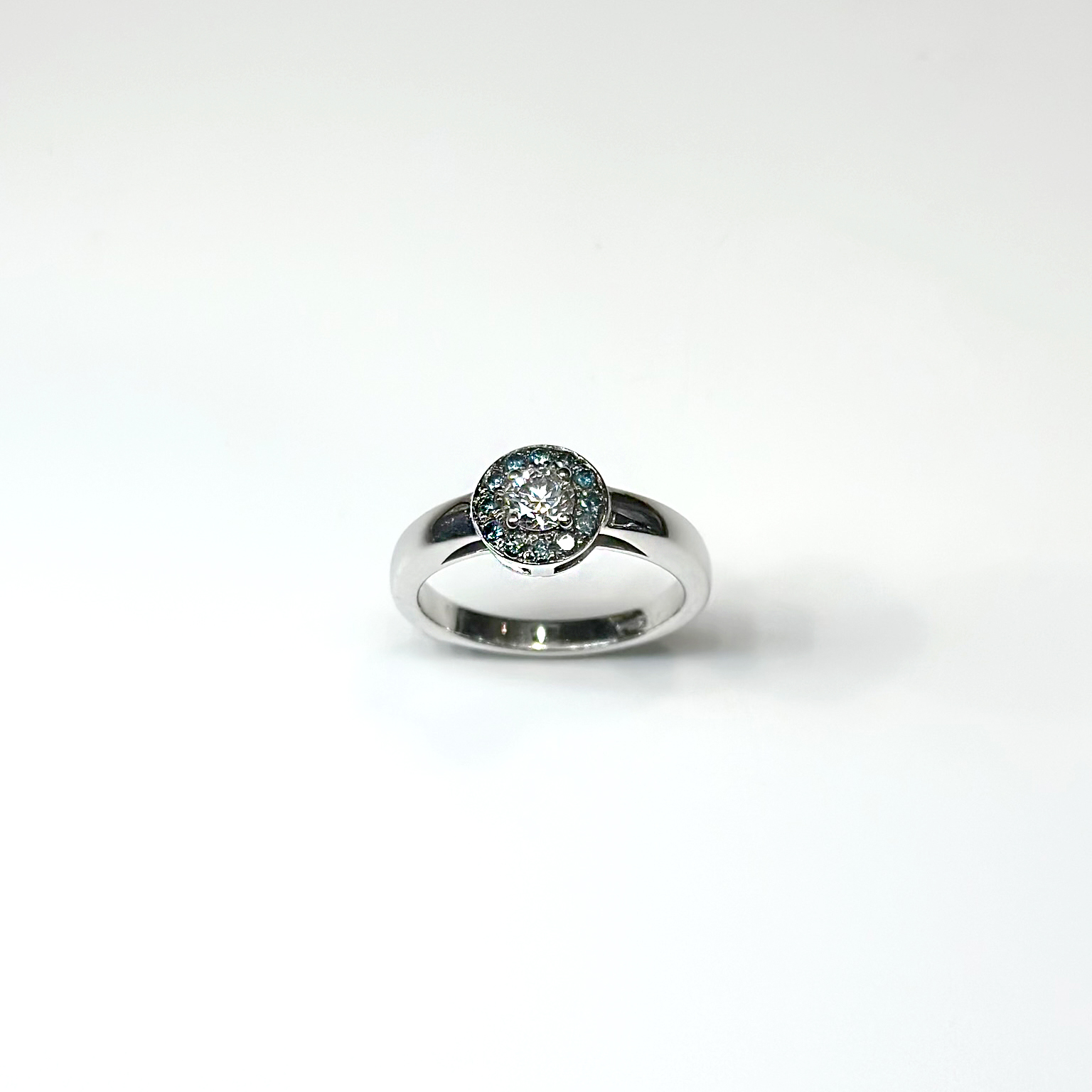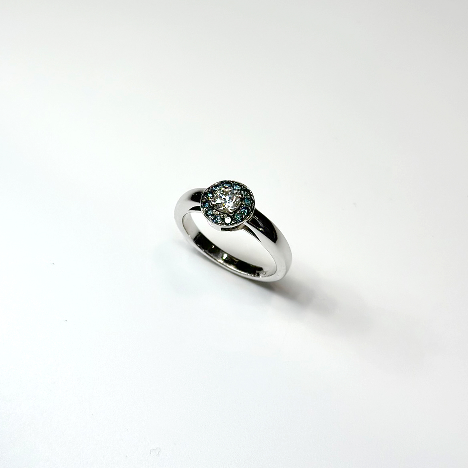 Anello Flavioro in oro bianco 18kt con diamante centrale taglio brillante ct 0.31 Colore: G Purezza: VS e diamanti naturali trattati blu