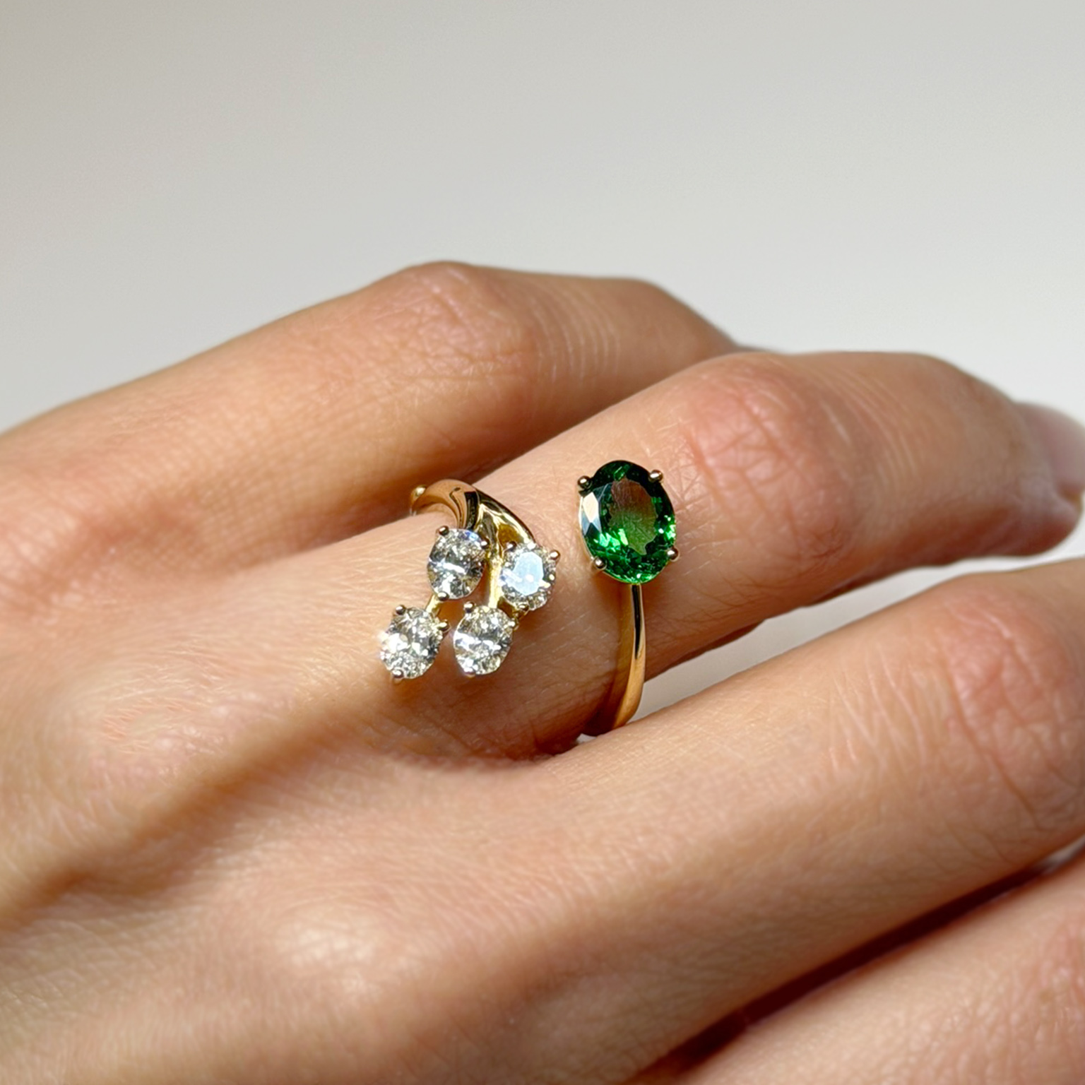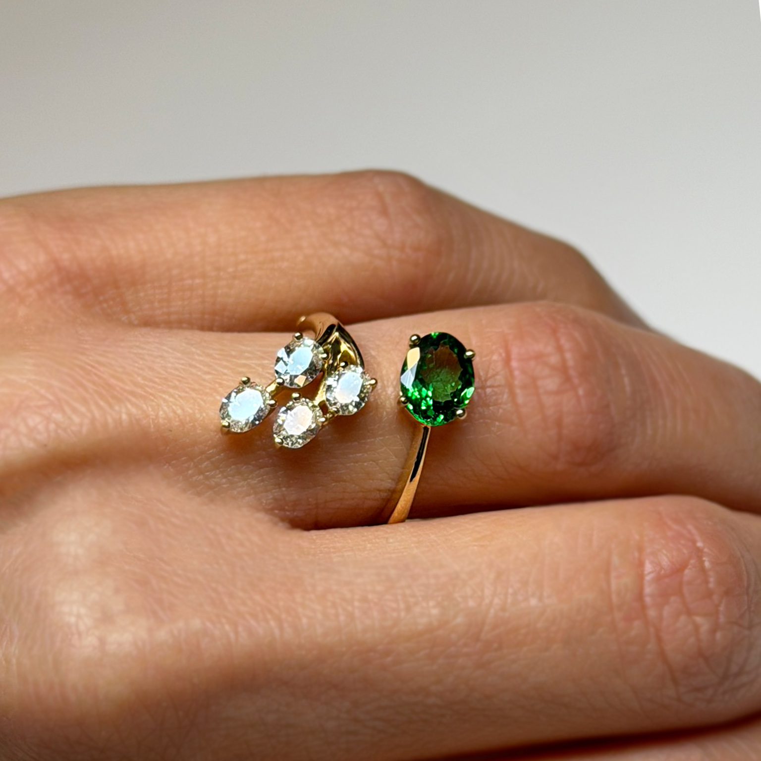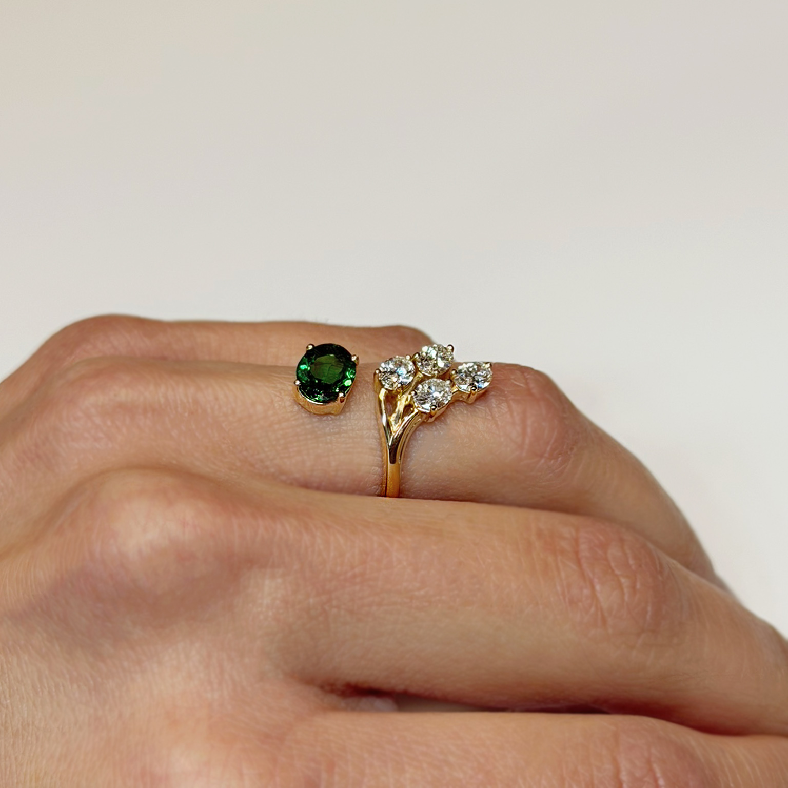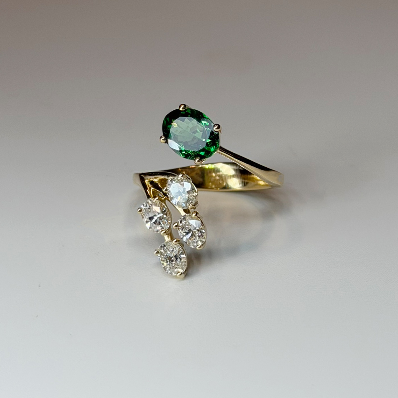 Anello Flavioro modello contrariè in oro giallo 18kt con tsavorite taglio ovale ct 1.11 e diamanti taglio ovale totale ct 0.82