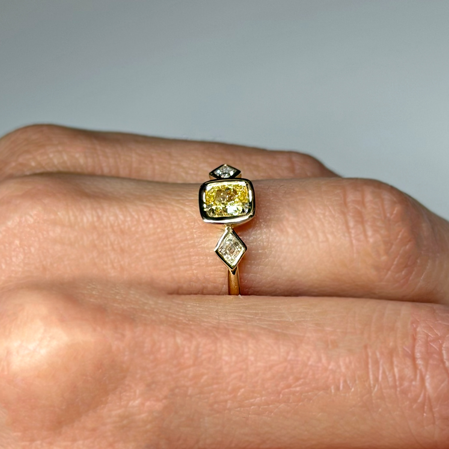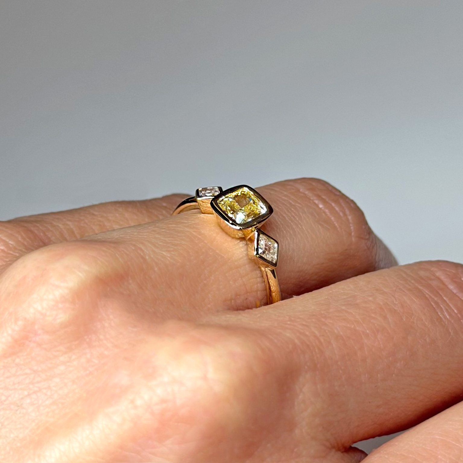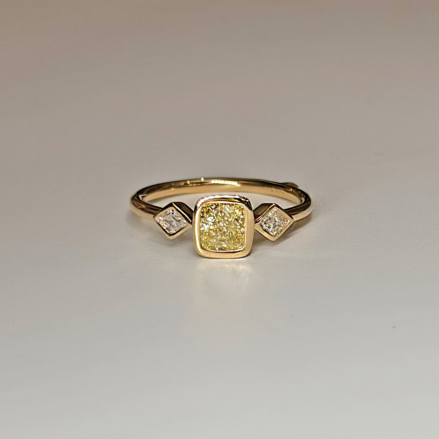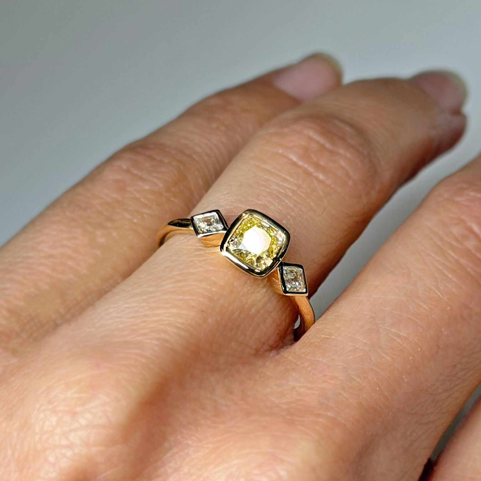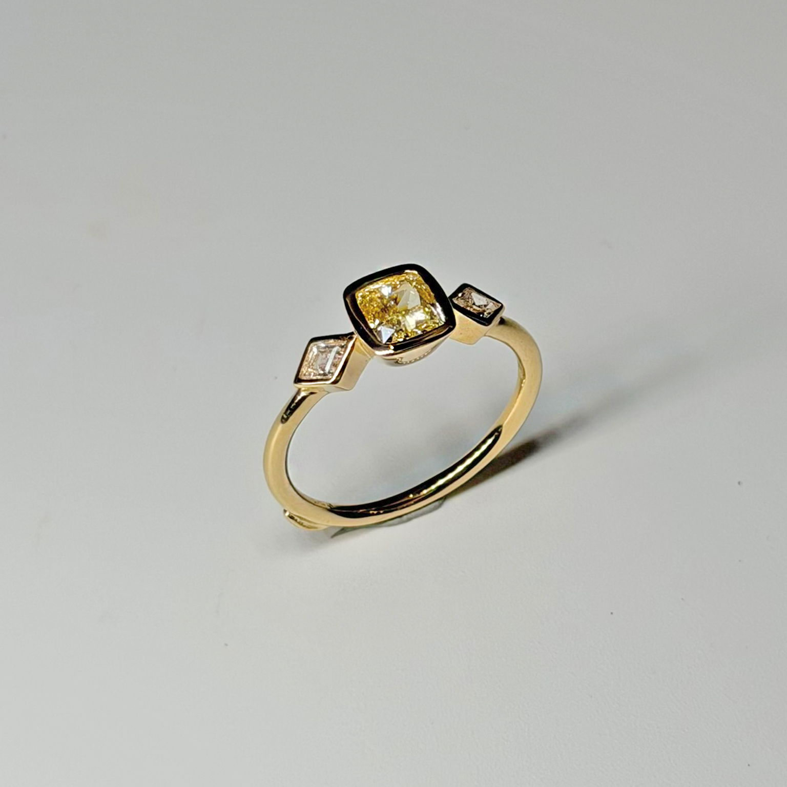 Anello Flavioro in oro giallo 18kt con diamante centrale Fancy Light Yellow certificato certificato GIA taglio cuscino ct 0.73 Purezza IF e diamanti laterali taglio rombo totale ct 0.18 Colore G Purezza VS