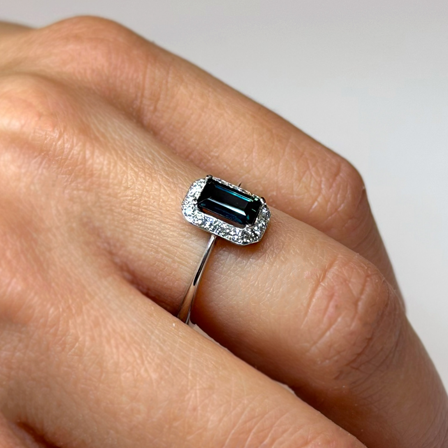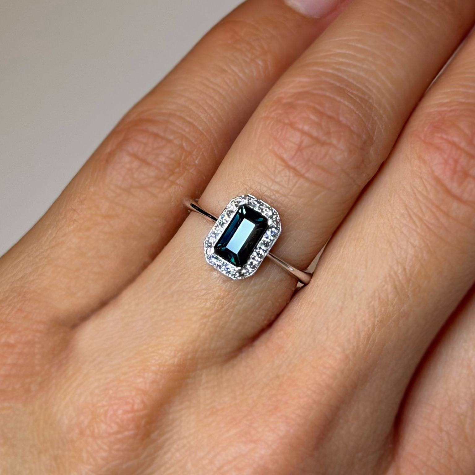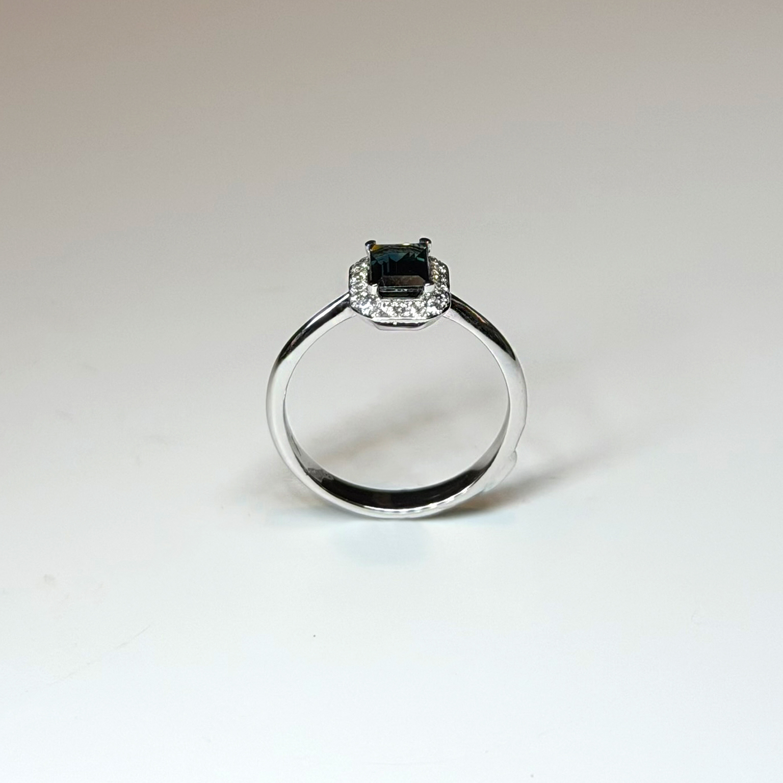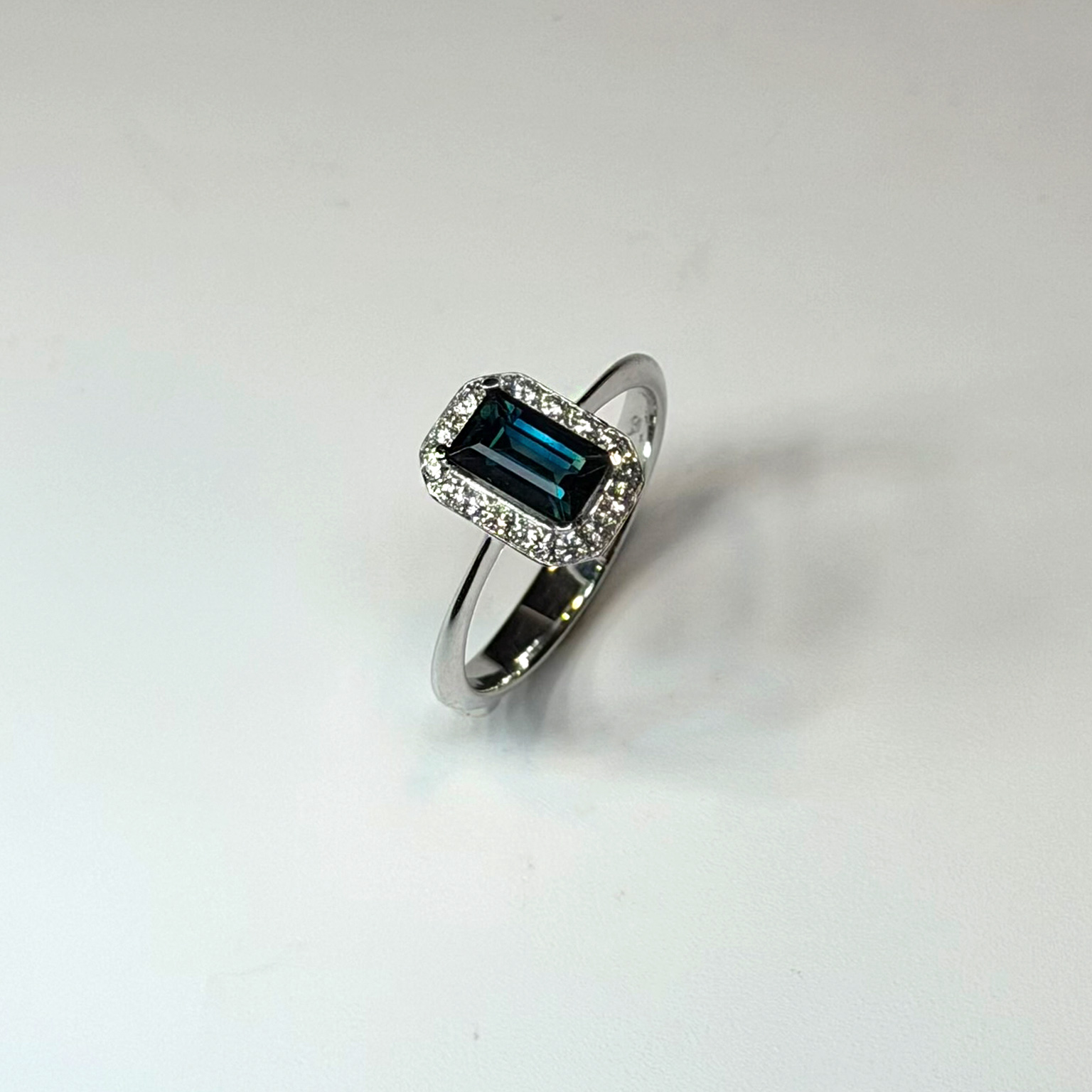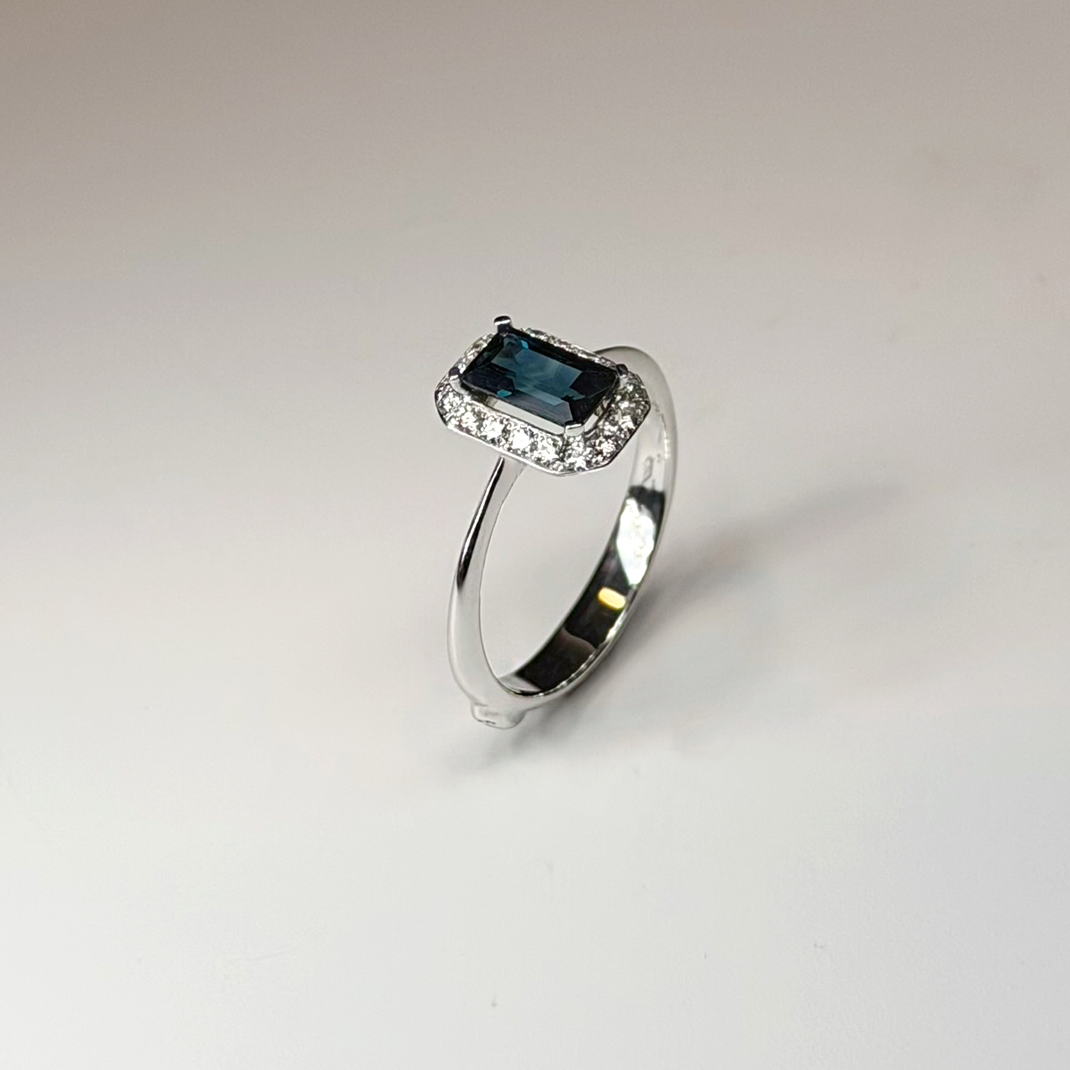 Anello Flavioro in oro bianco 18kt con zaffiro taglio smeraldo ct 0.97 e diamanti taglio brillante totale ct 0.17 Colore G Purezza VS
