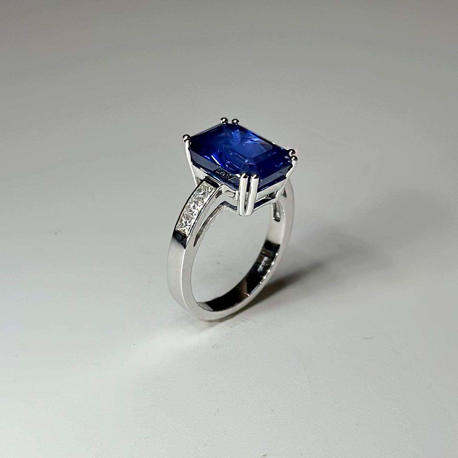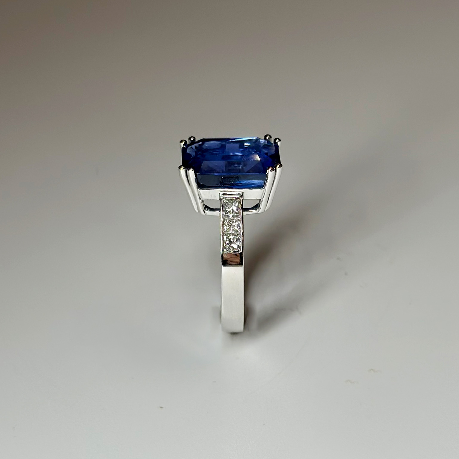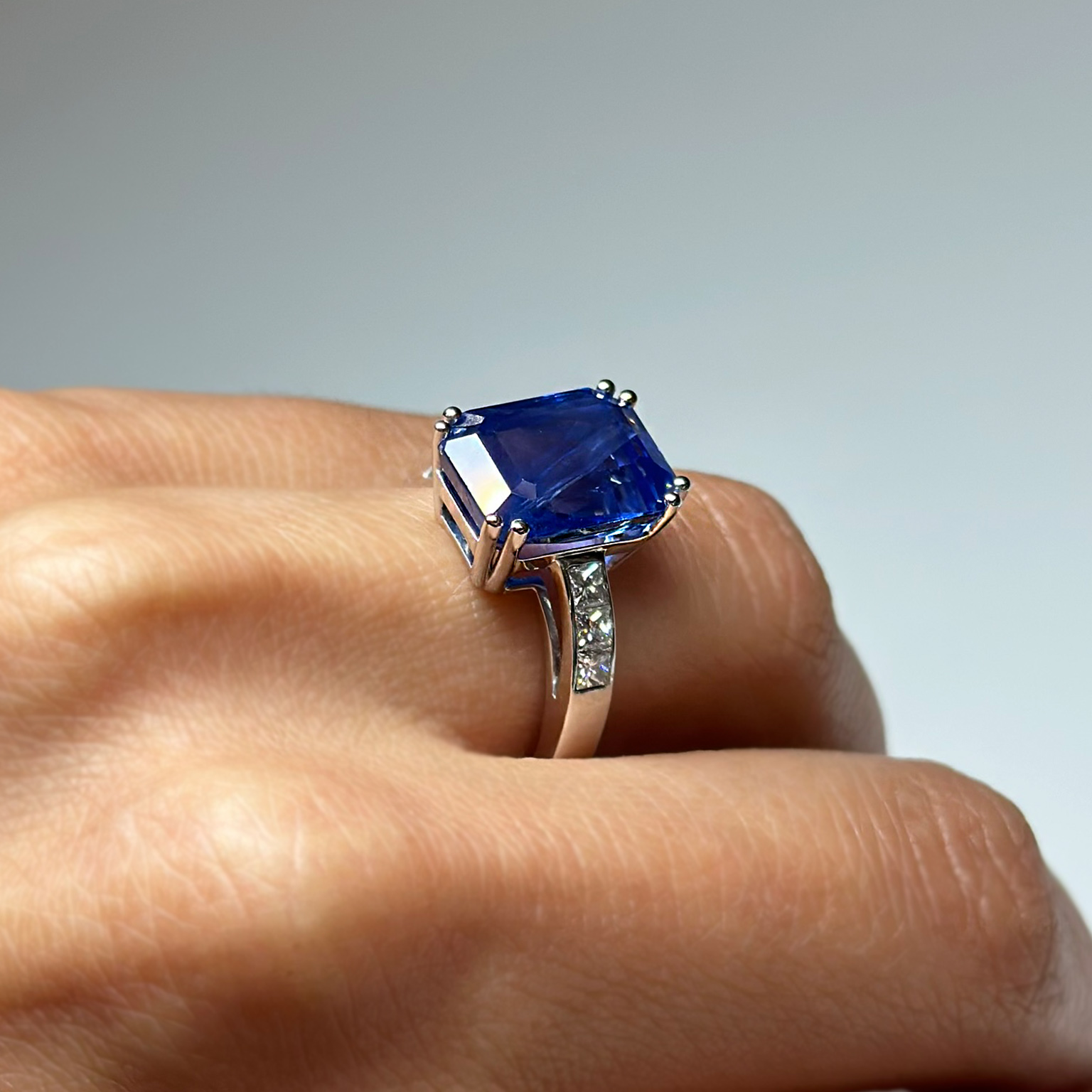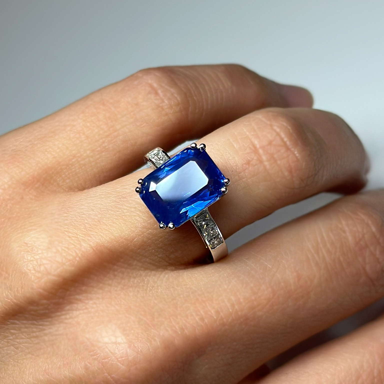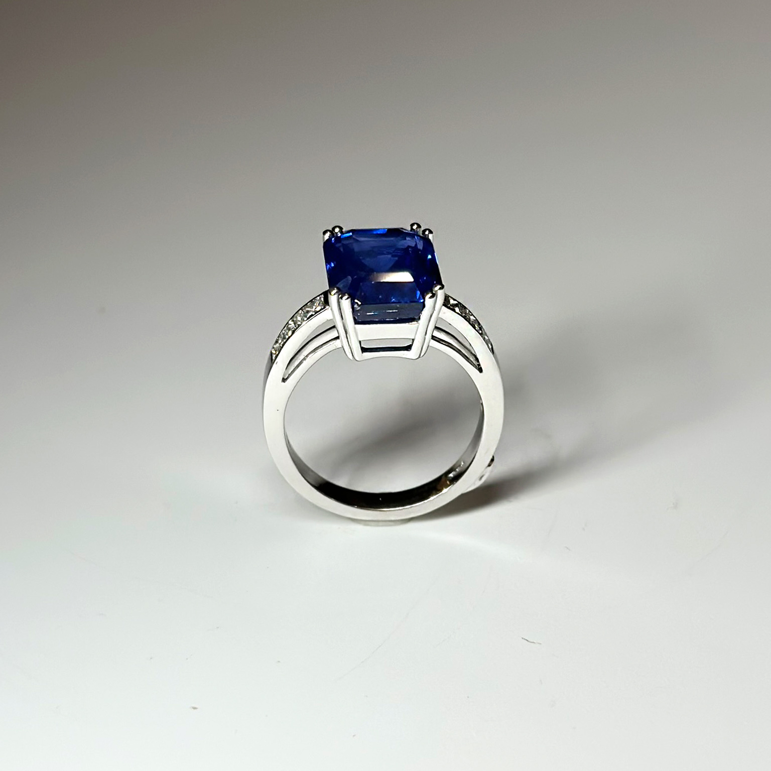 Anello Flavioro in oro bianco 18kt con zaffiro ct 9.03 e diamanti taglio carrè totale ct 0.42 Colore F Purezza VS