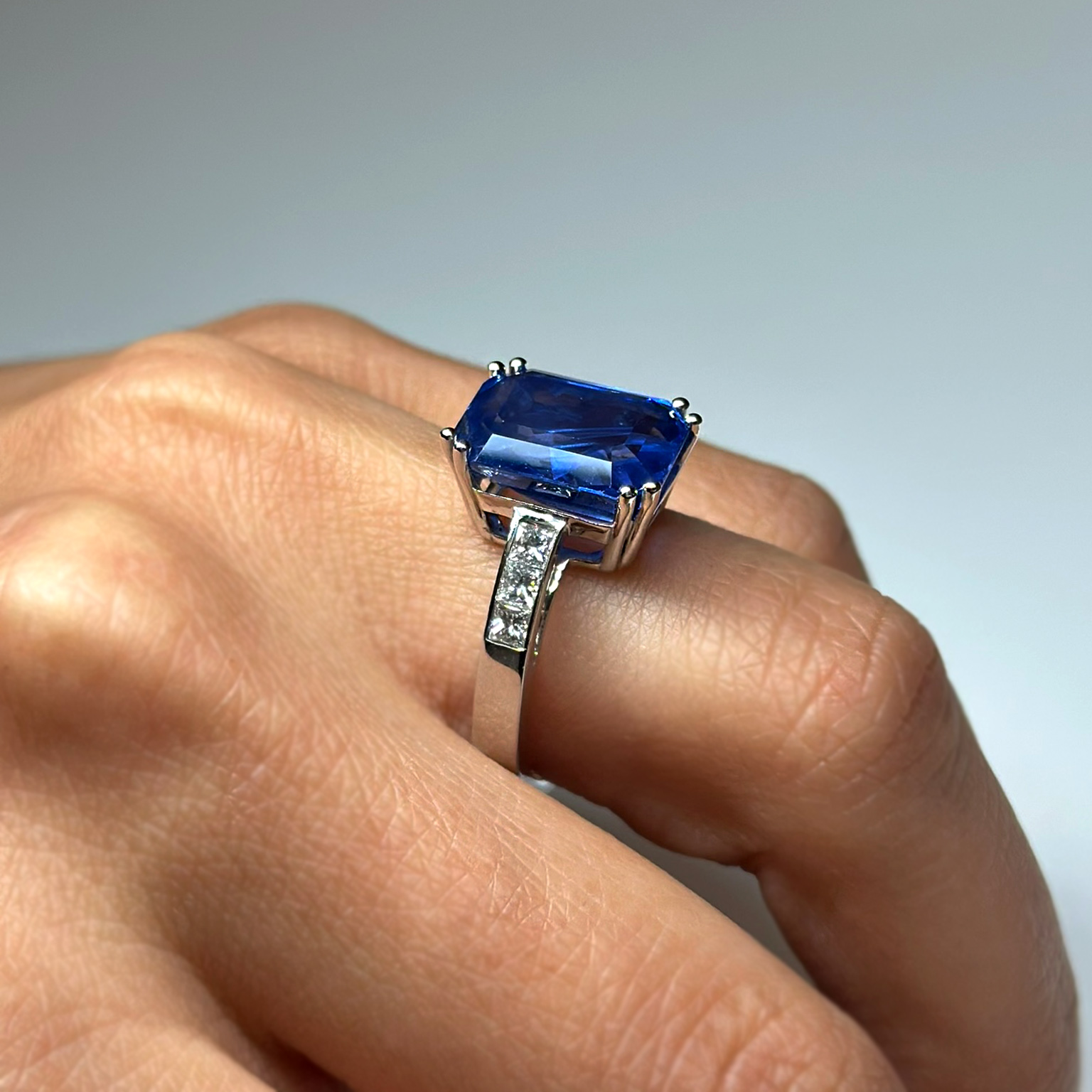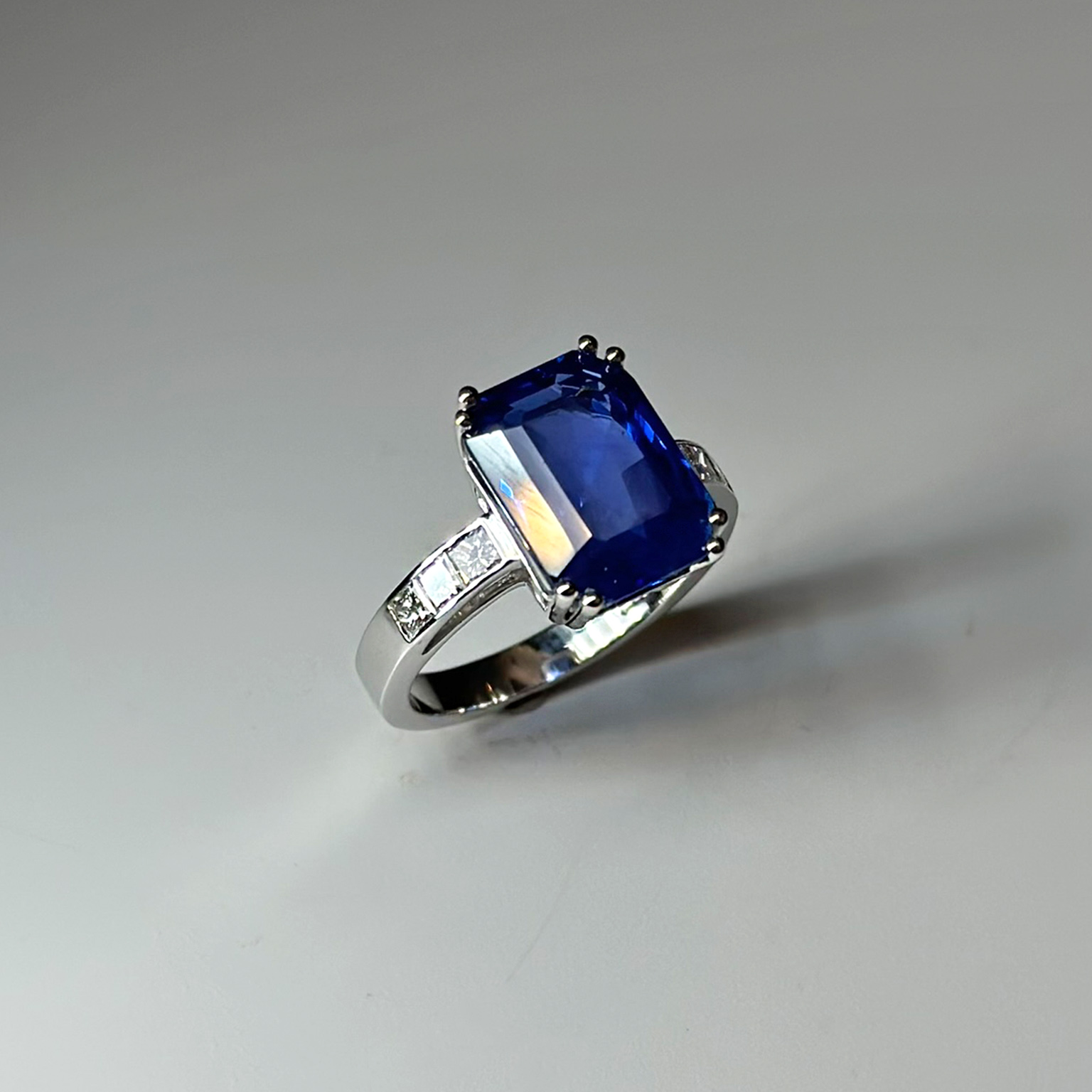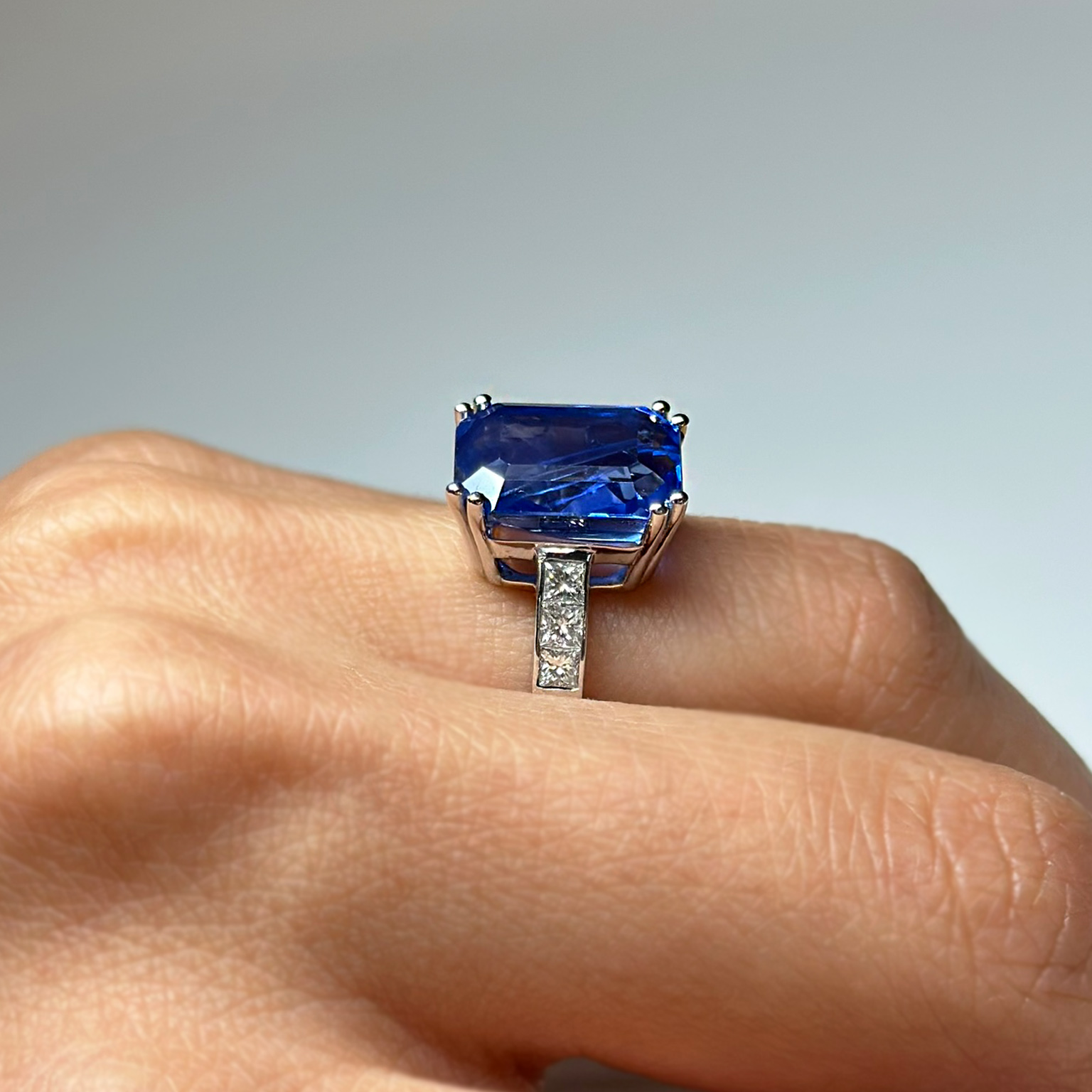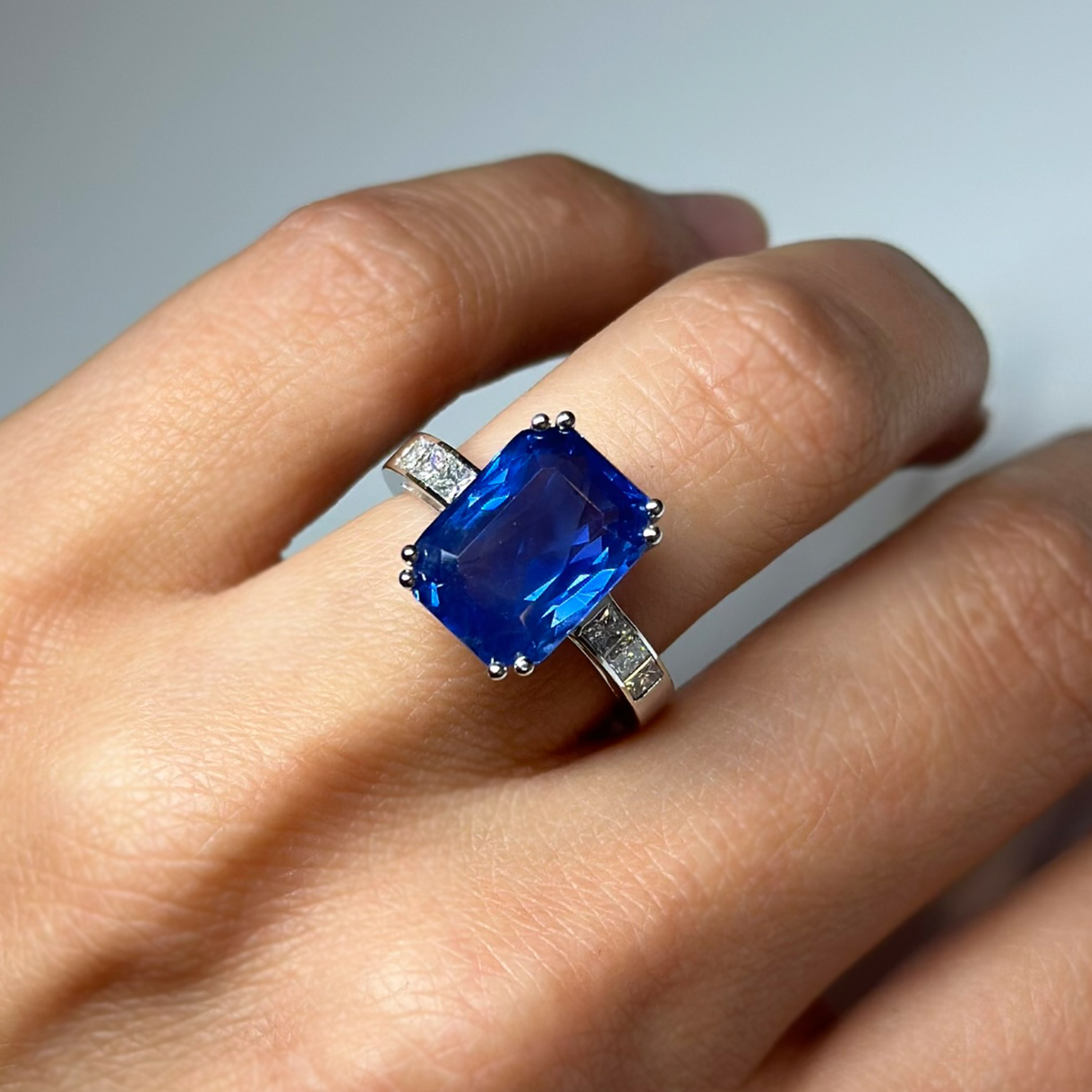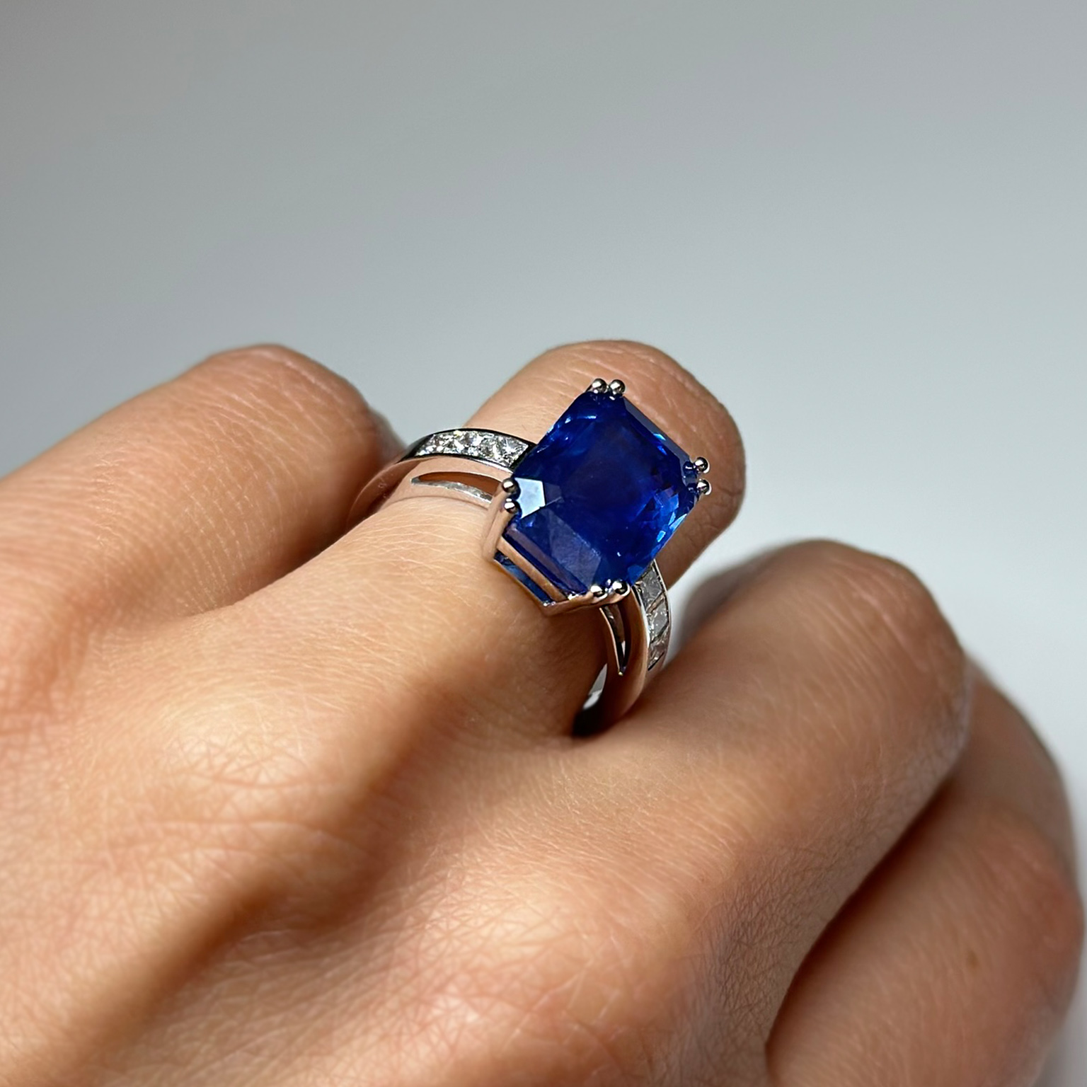 Anello Flavioro in oro bianco 18kt con zaffiro ct 9.03 e diamanti taglio carrè totale ct 0.42 Colore F Purezza VS