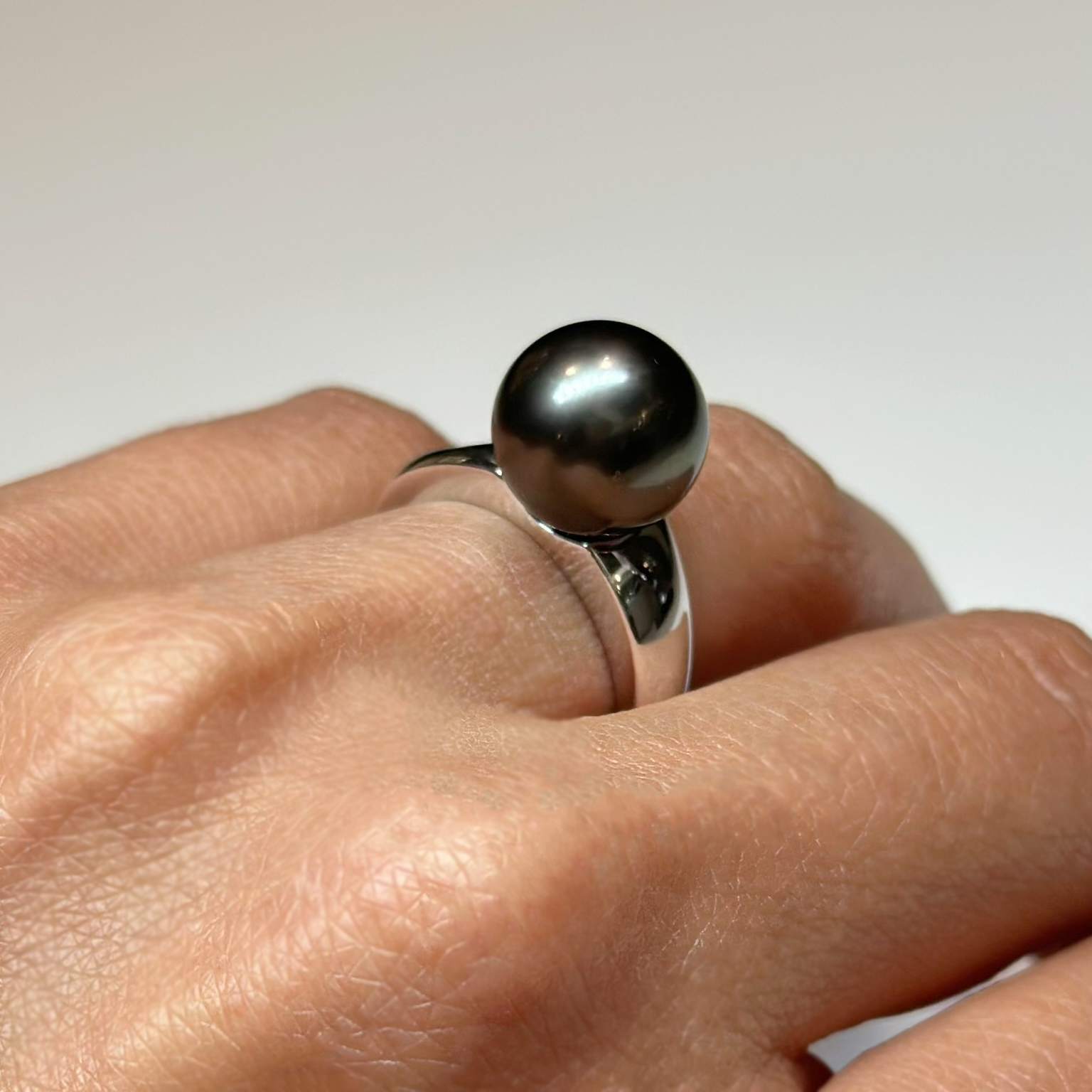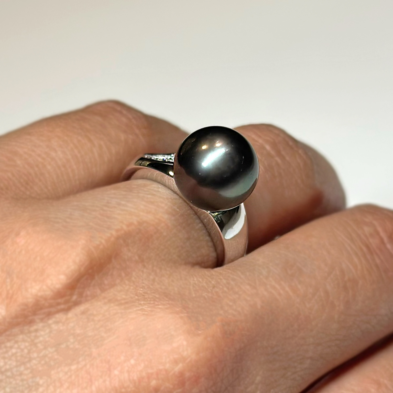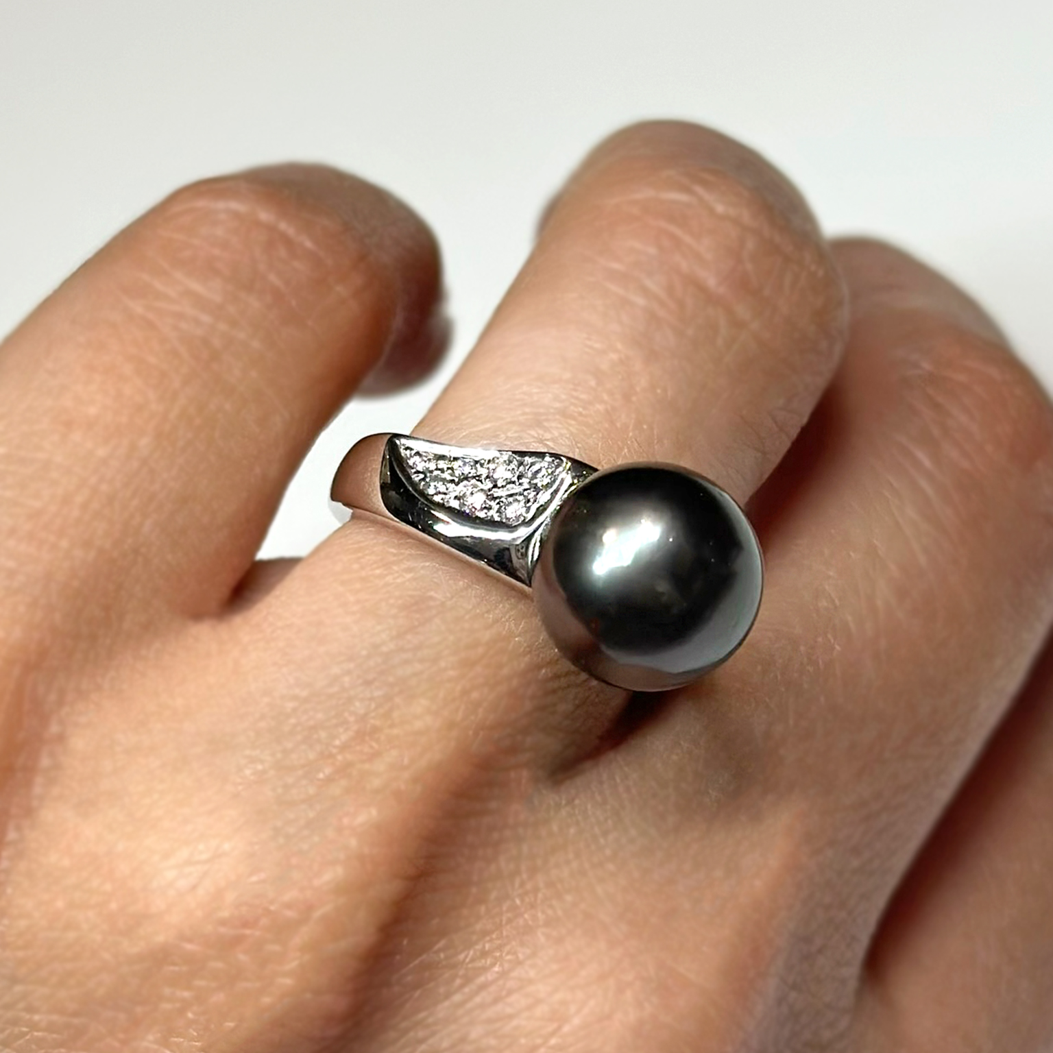 Anello Flavioro in oro bianco 18kt con perla Tahiti e diamanti taglio brillante totale ct 0.10 Colore: G Purezza: VS