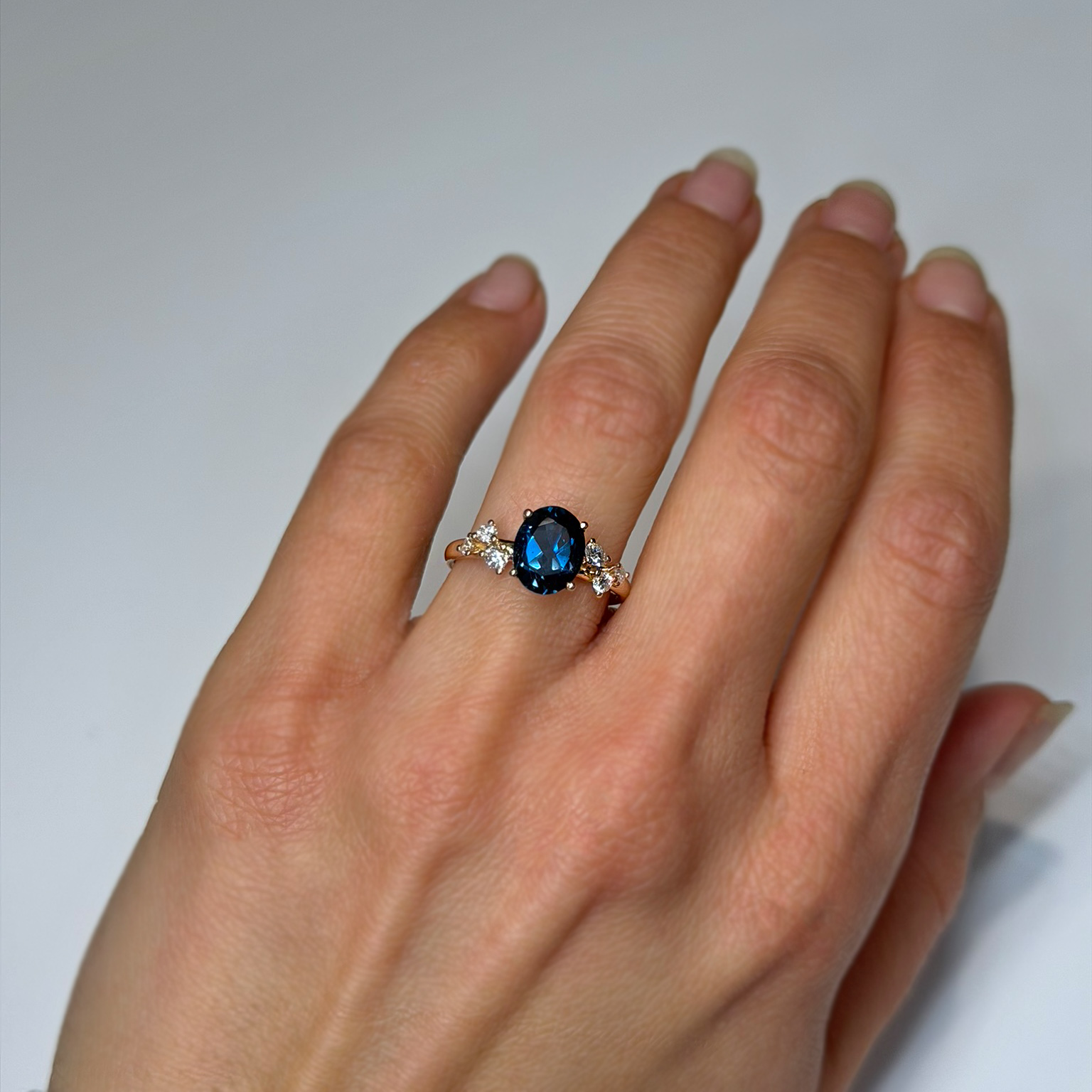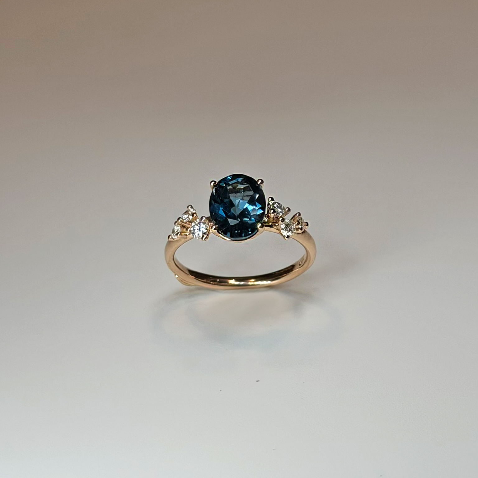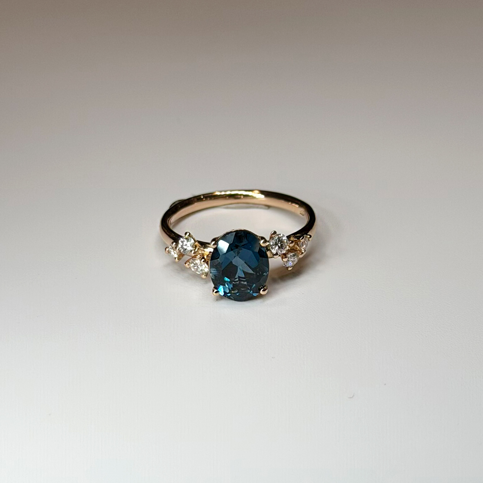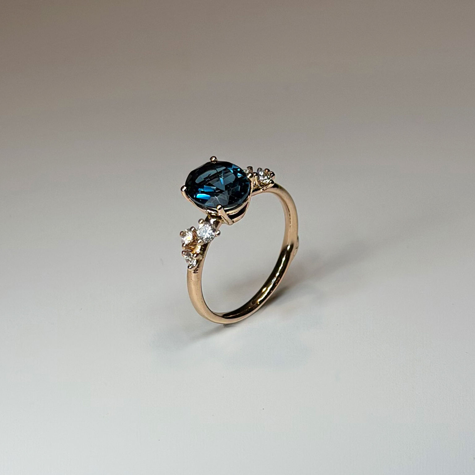Anello in oro rosa 18kt con Topazio Blu London taglio ovale ct 2.13 e diamanti naturali laterali taglio brillante totale ct  0.26 G VS