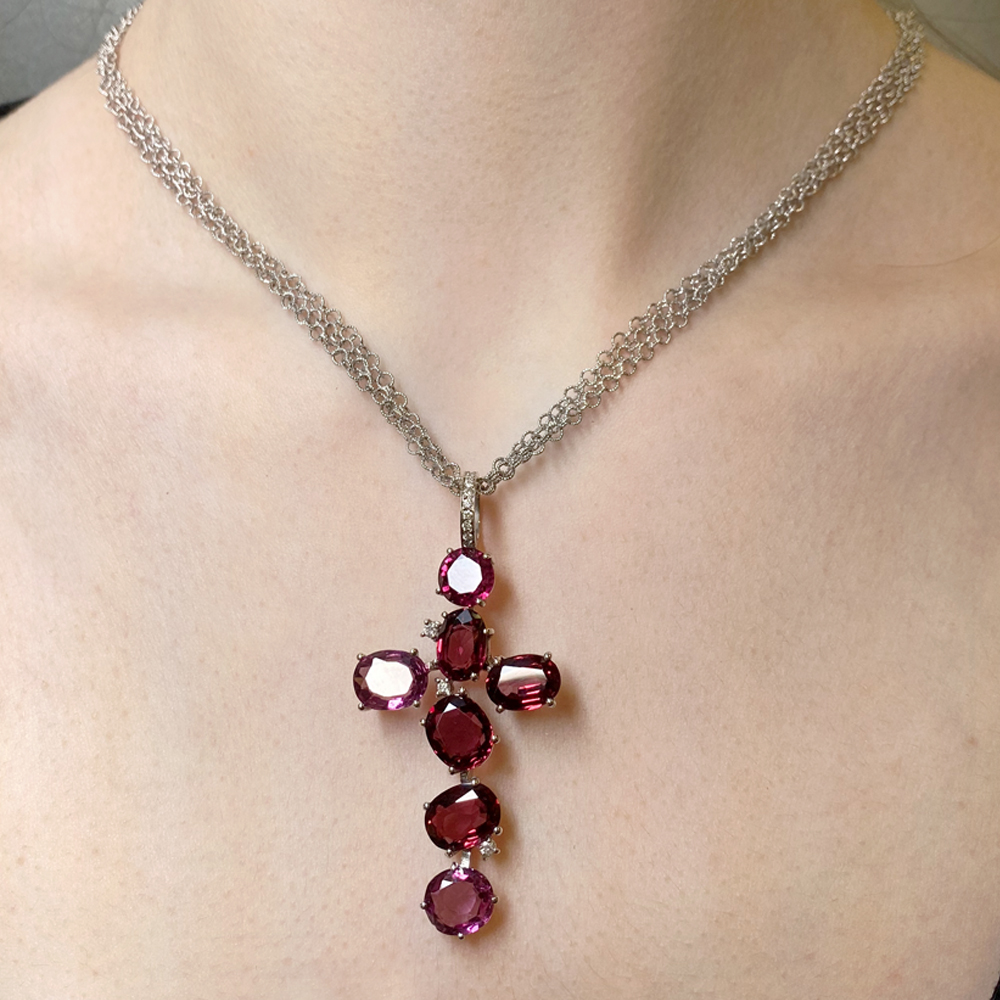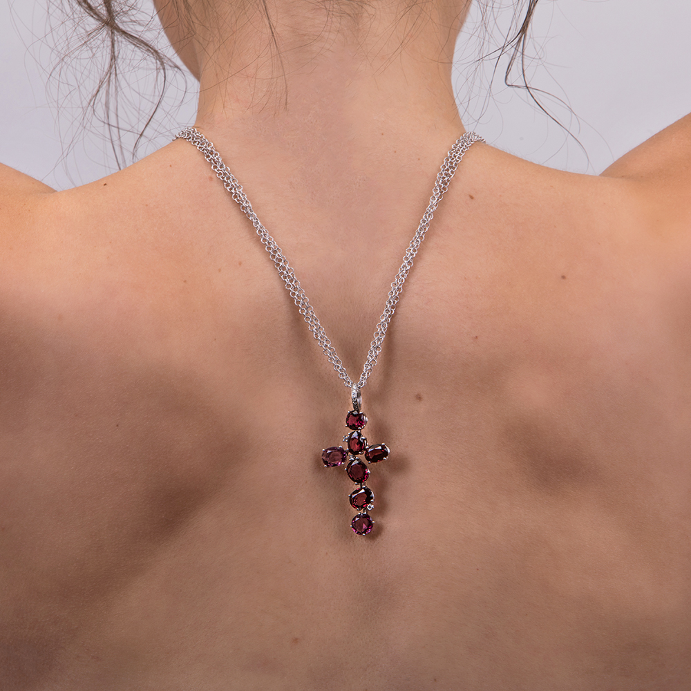 Pendente Croce oro bianco 18kt con granati totale ct 17.50 e diamanti taglio brillante totale ct 0.15 G VS