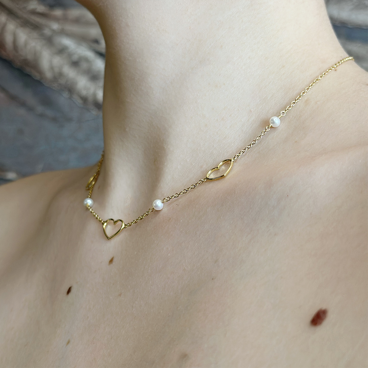 Collana in oro giallo 18kt con 4 perle di acqua dolce e 3 elementi a forma di cuore