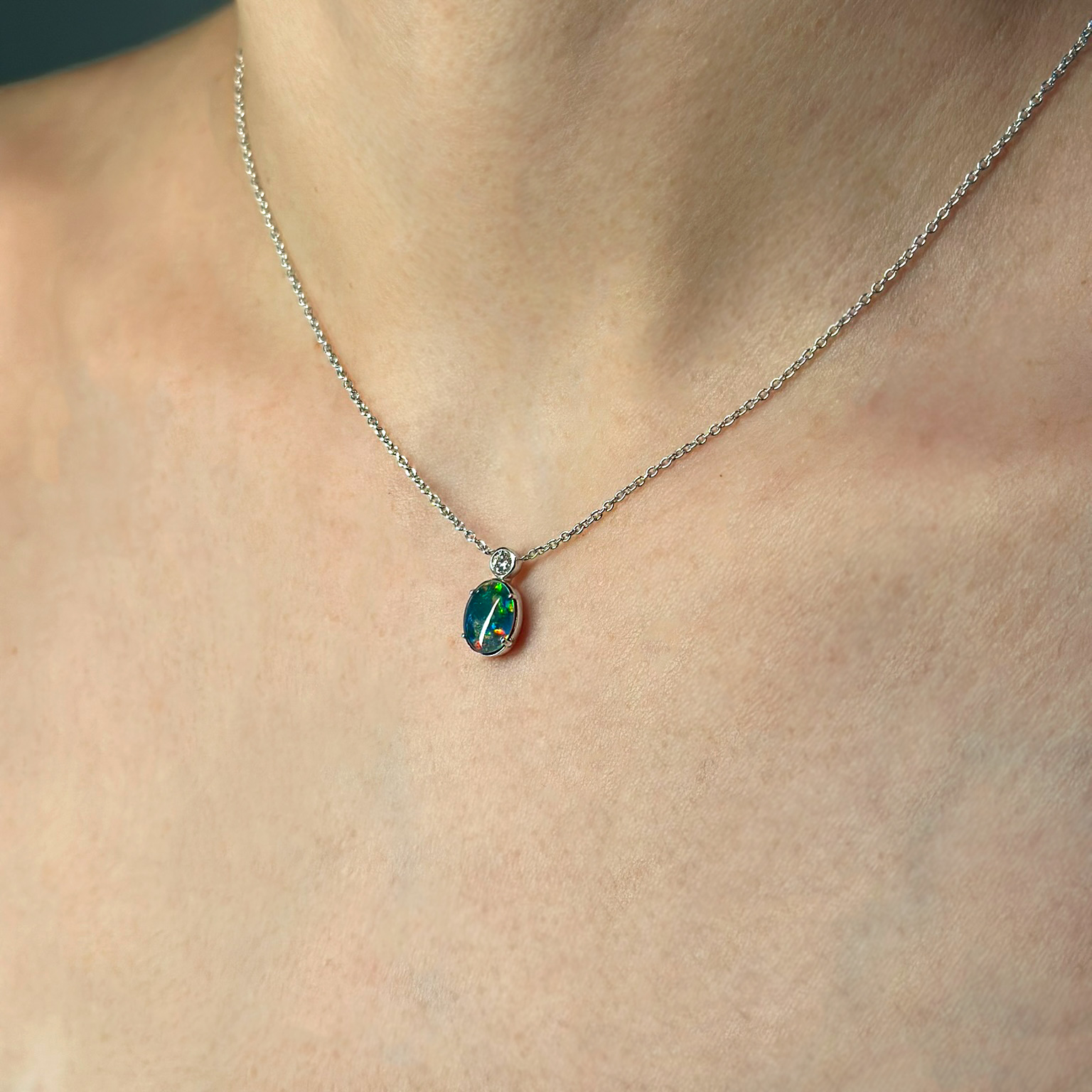 Collana in oro bianco 18kt con opale con diamante taglio brillante ct 0.06 Colore G Purezza VS