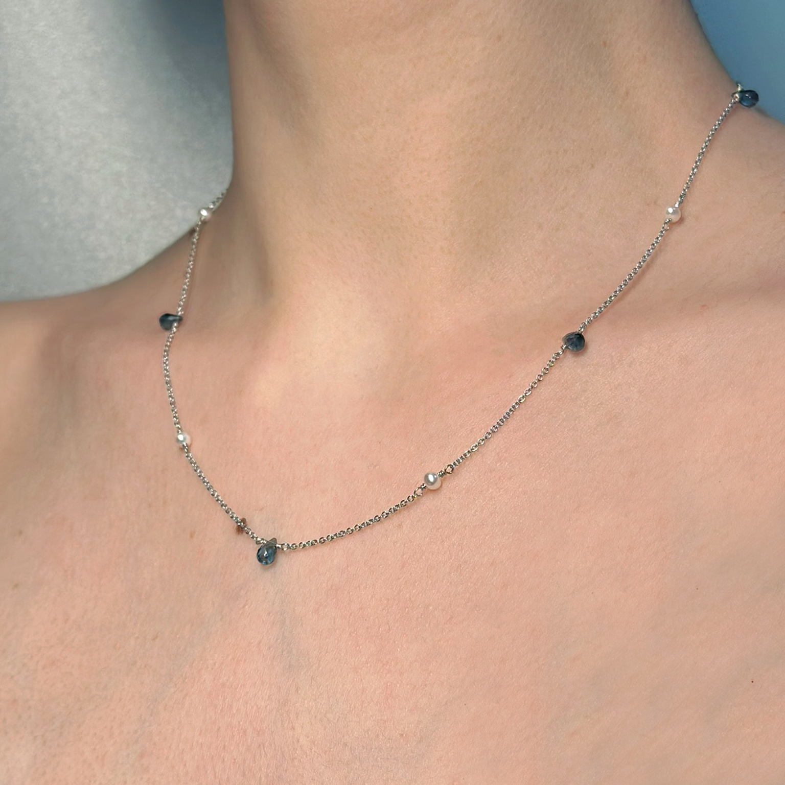 Collana in oro bianco 18kt con perle di acqua dolce e topazi blu london