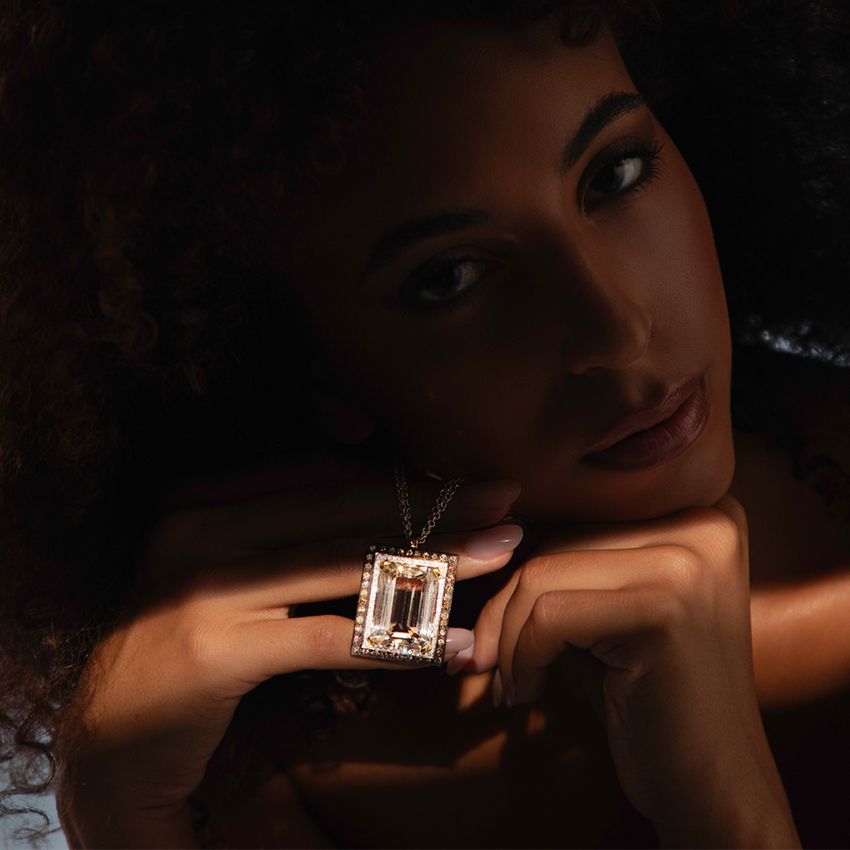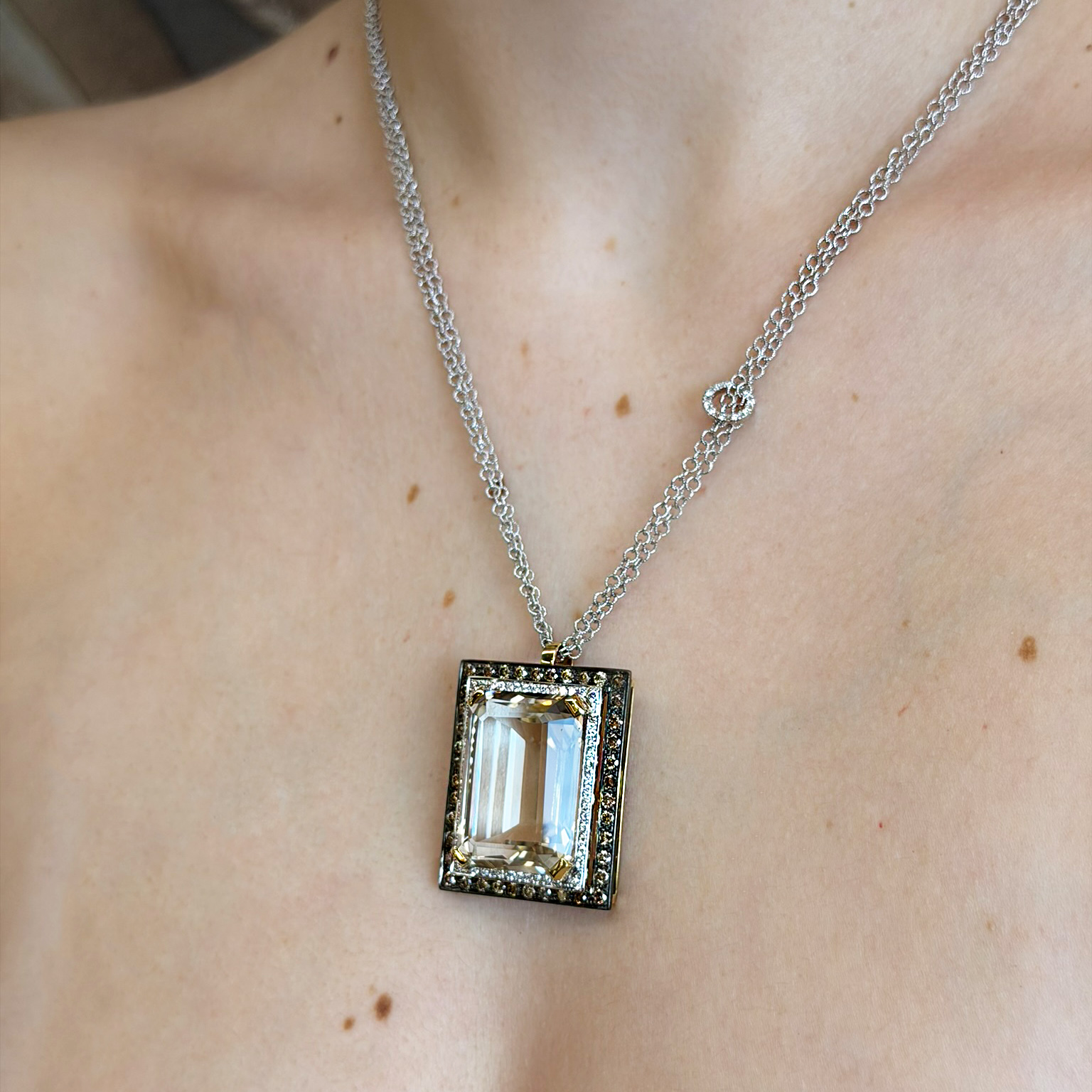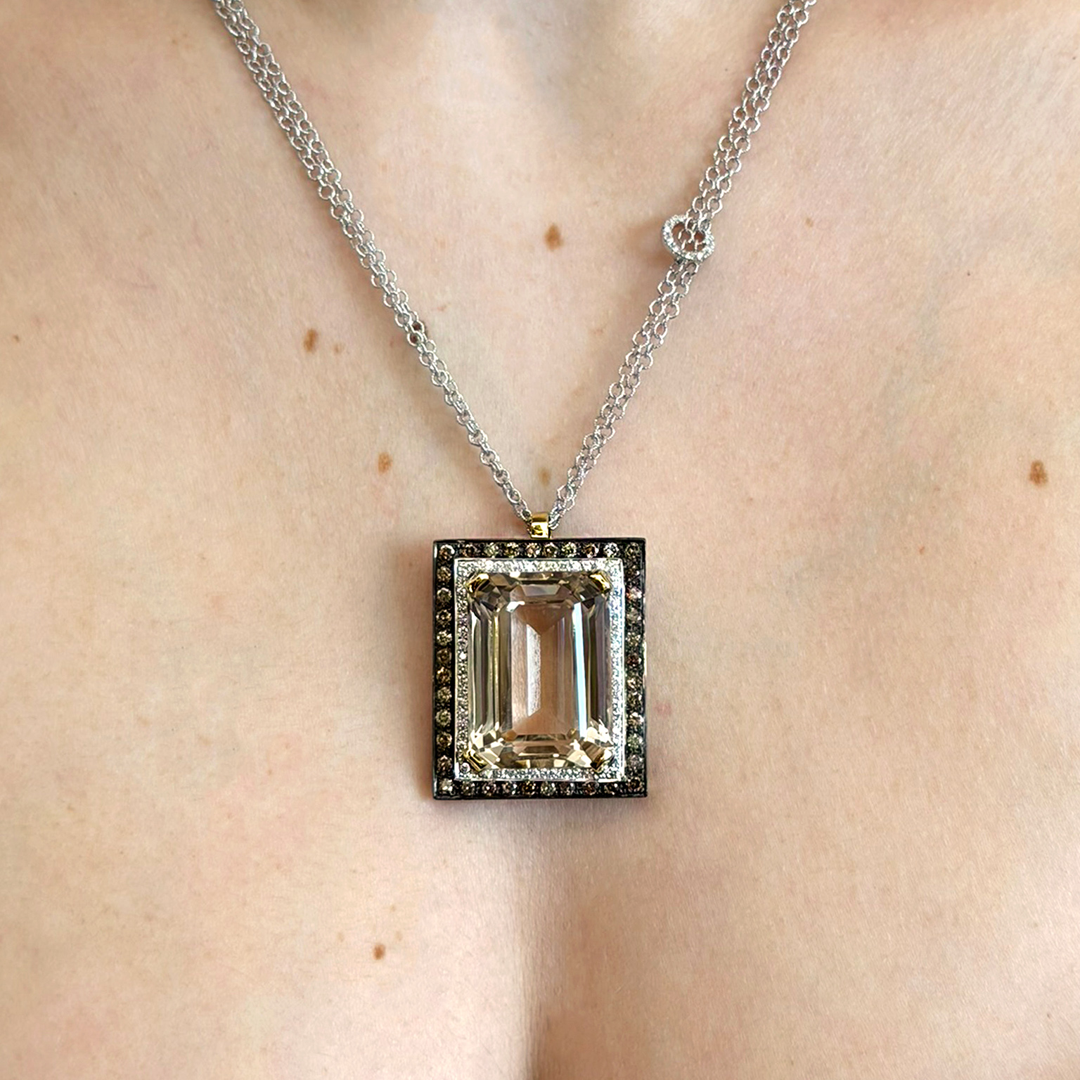 Collana in oro bianco 18kt con pendente quarzo citrino, diamanti bianchi taglio brillante ct 0.54 e diamanti brown taglio brillante ct 1.62