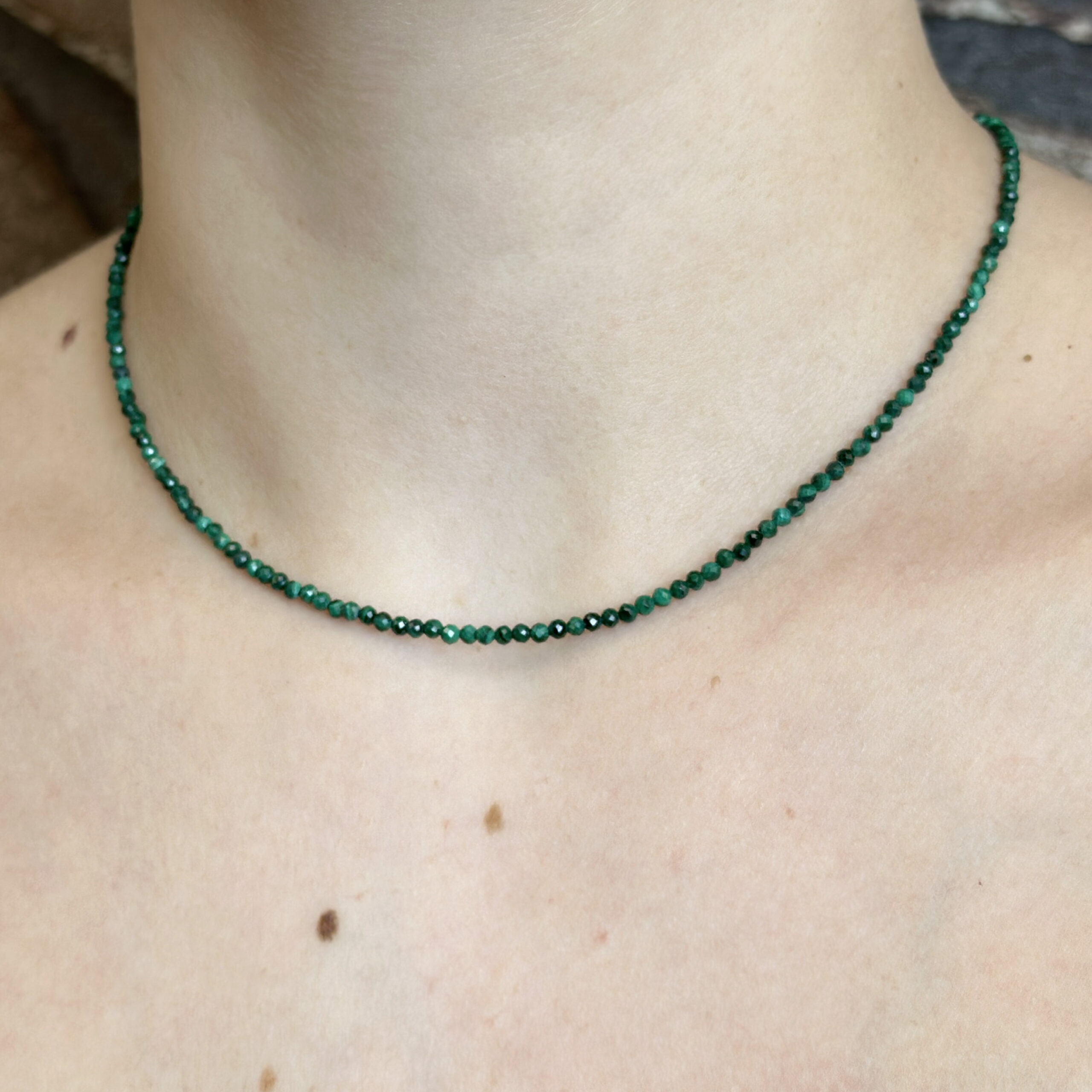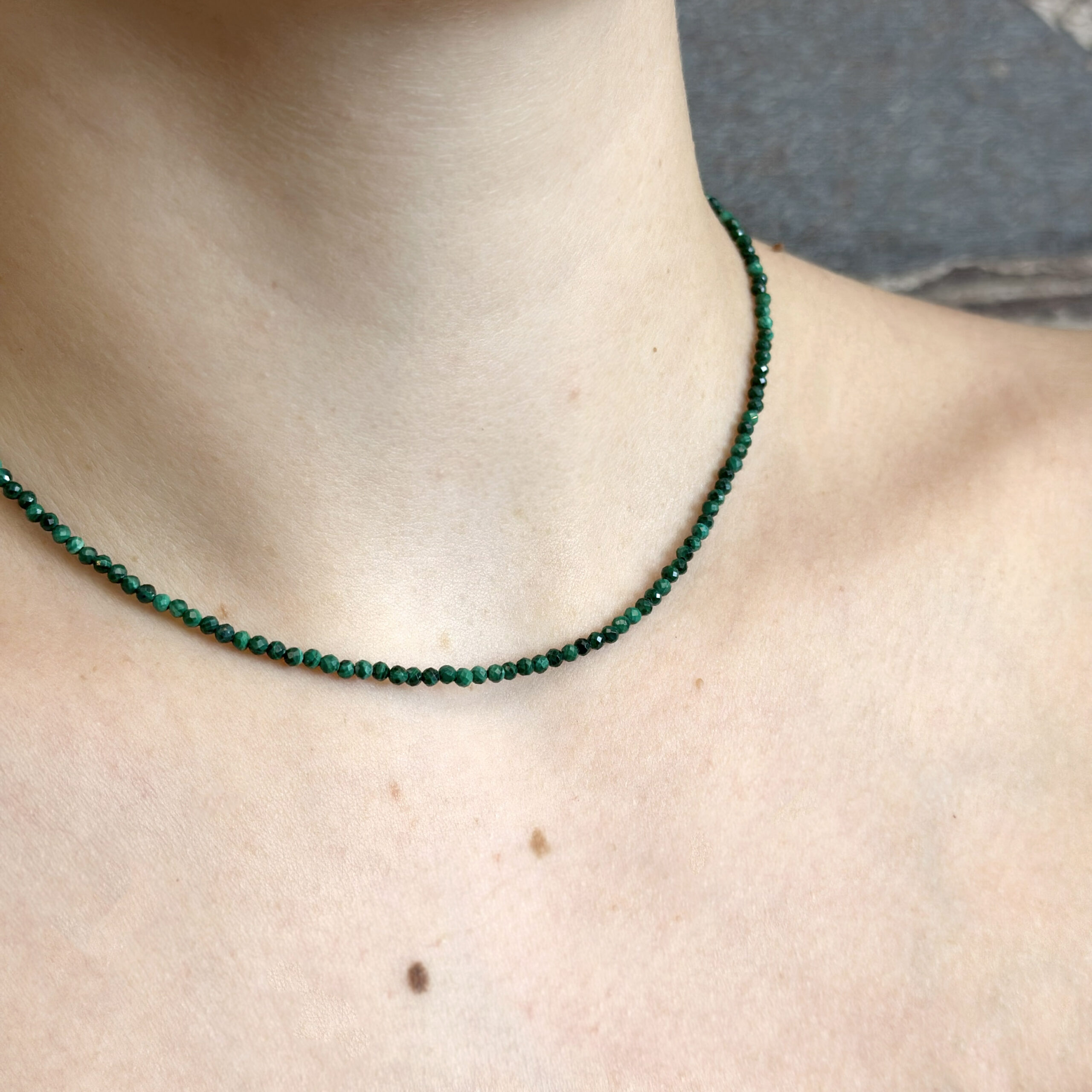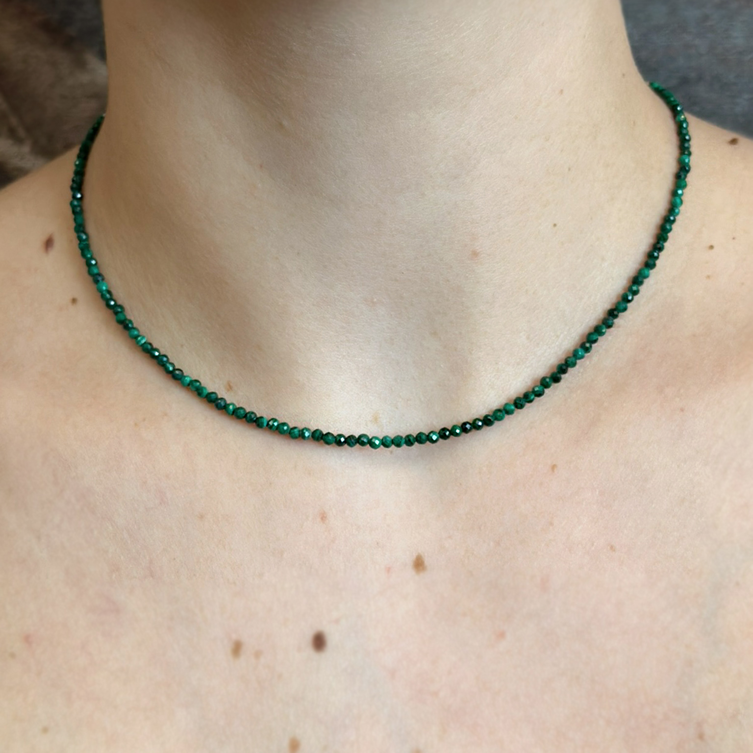Collana Flavioro con malachite infilata in un cavetto d’acciaio.