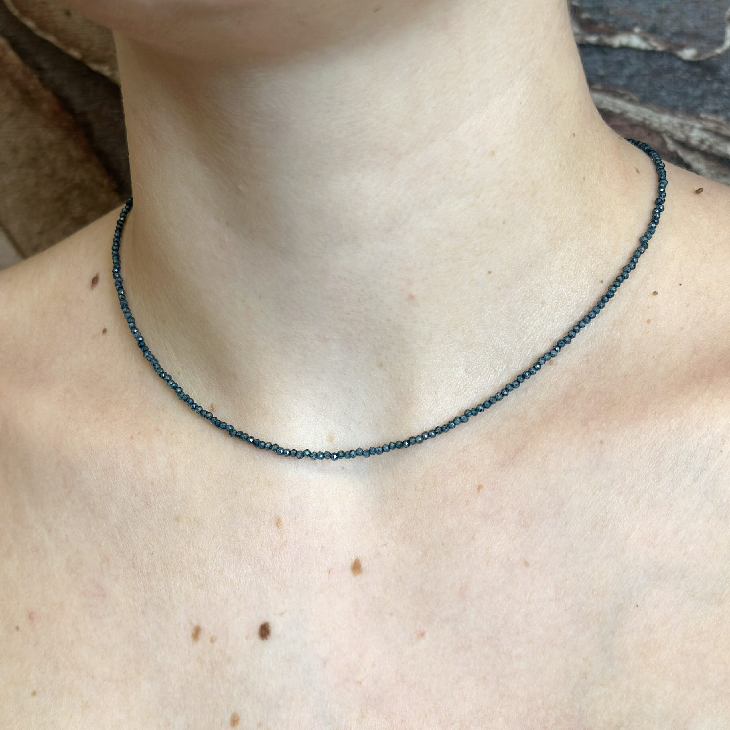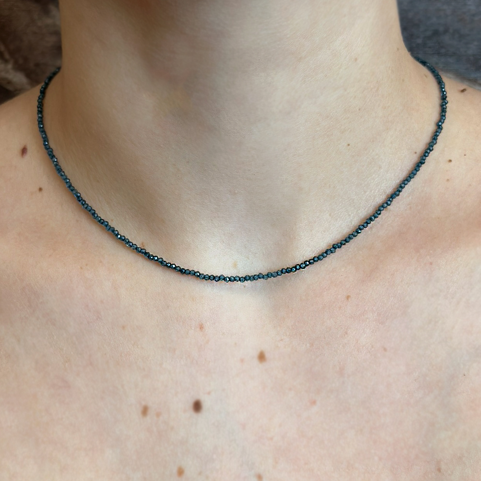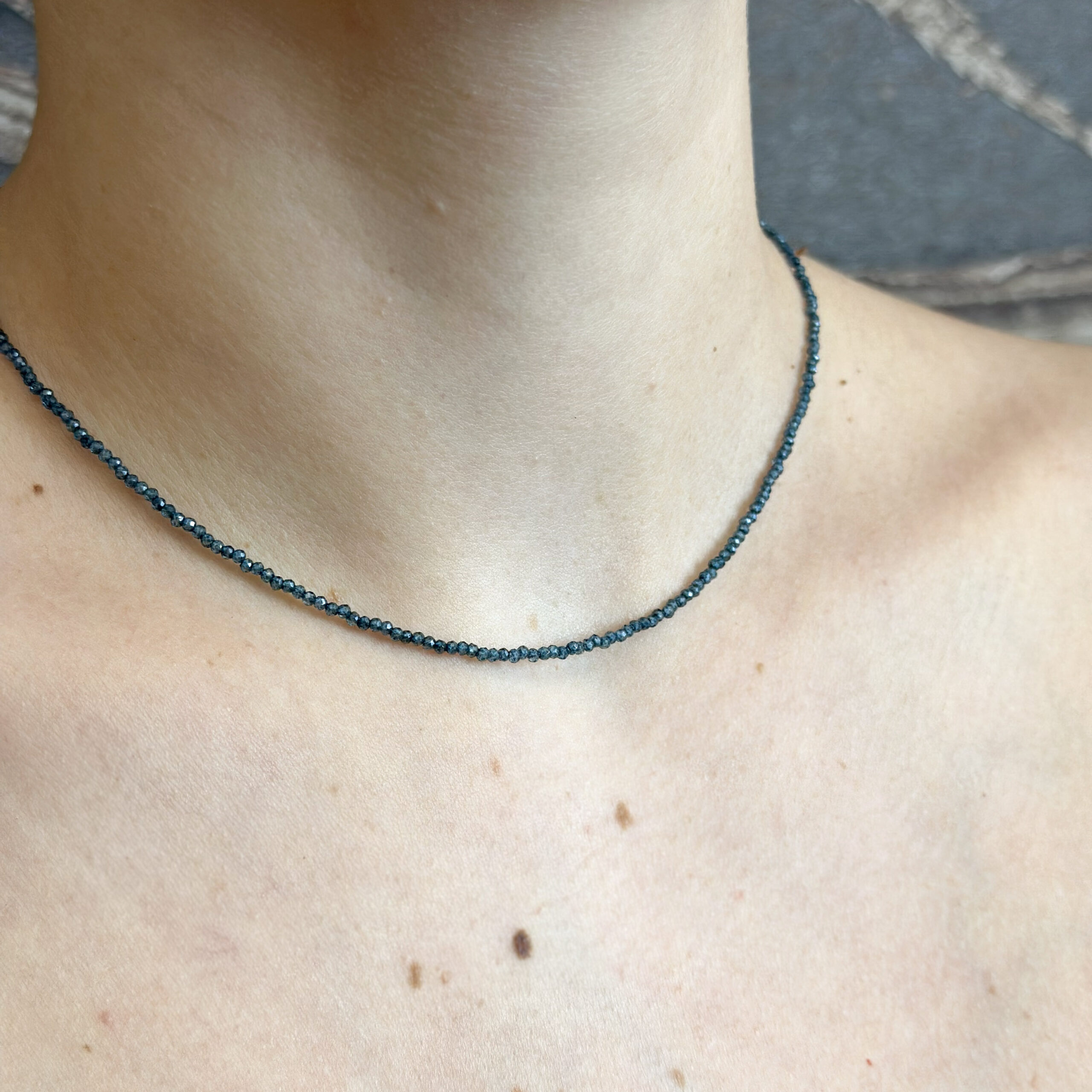 Collana Flavioro con topazi blu london infilate in un cavetto d’acciaio.