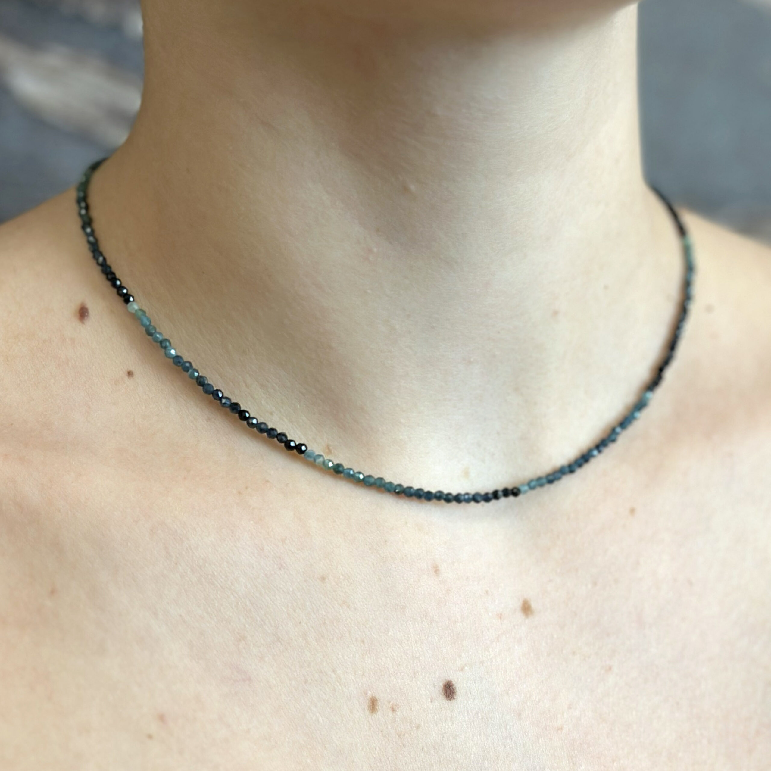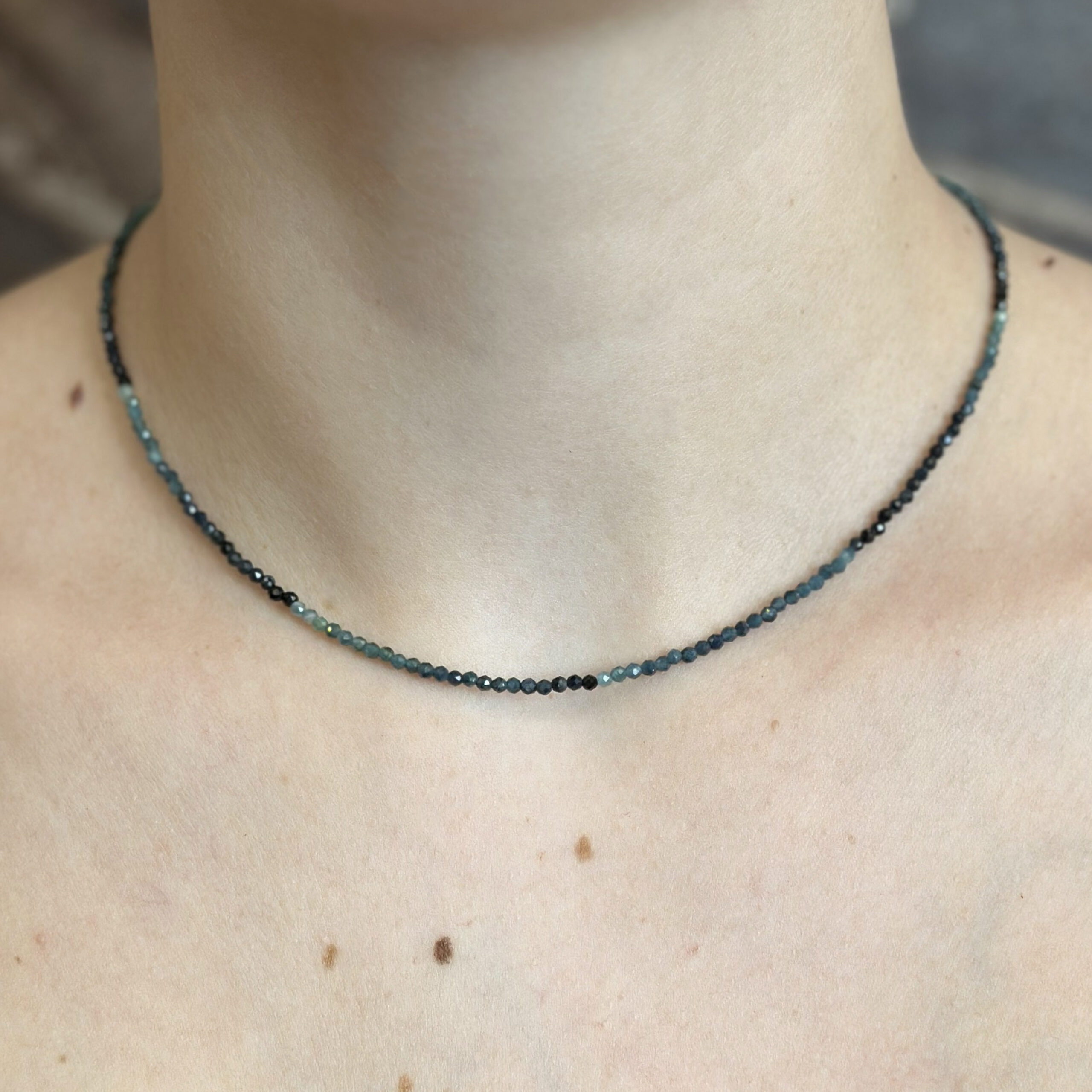 Collana Flavioro con tormaline infilate in un cavetto d’acciaio.