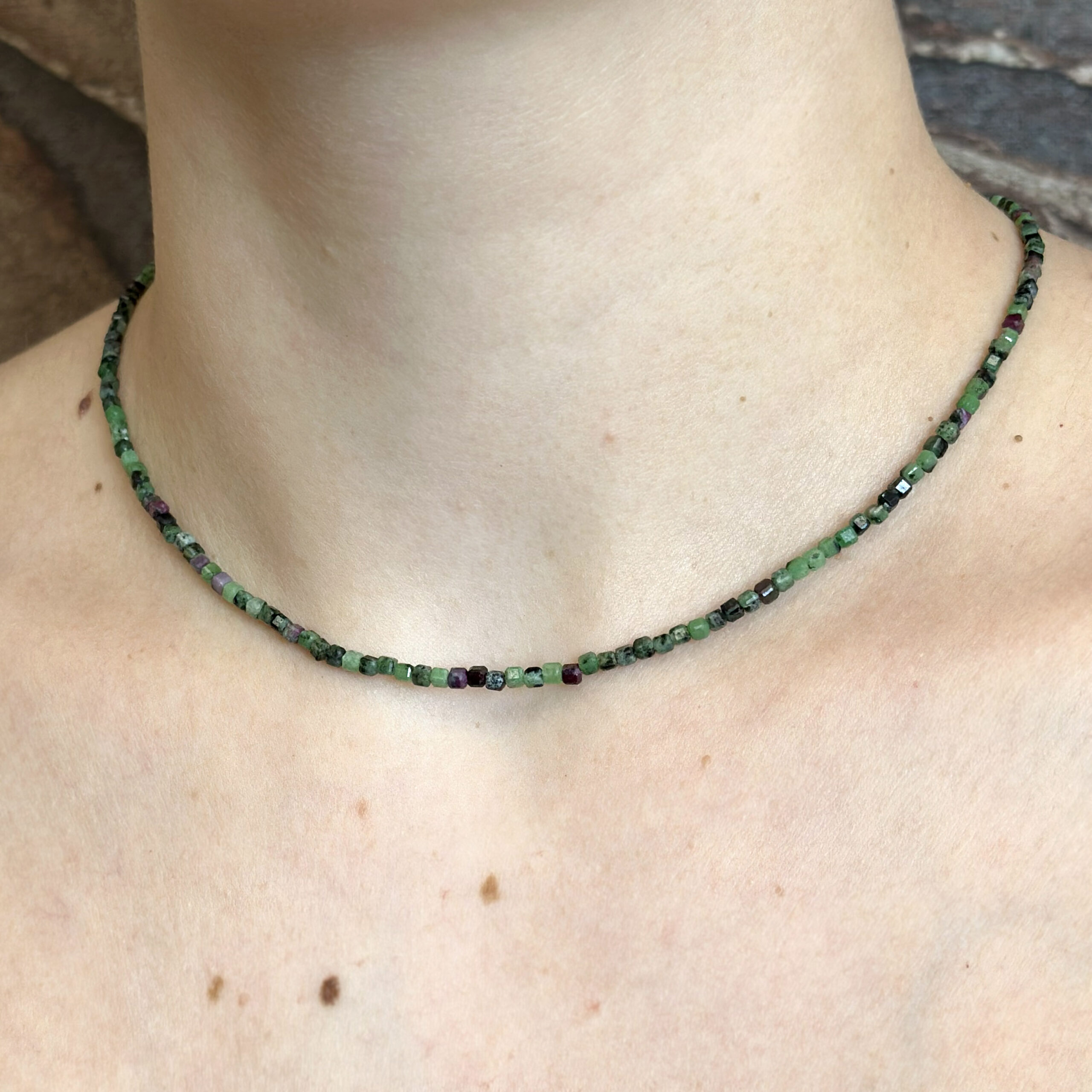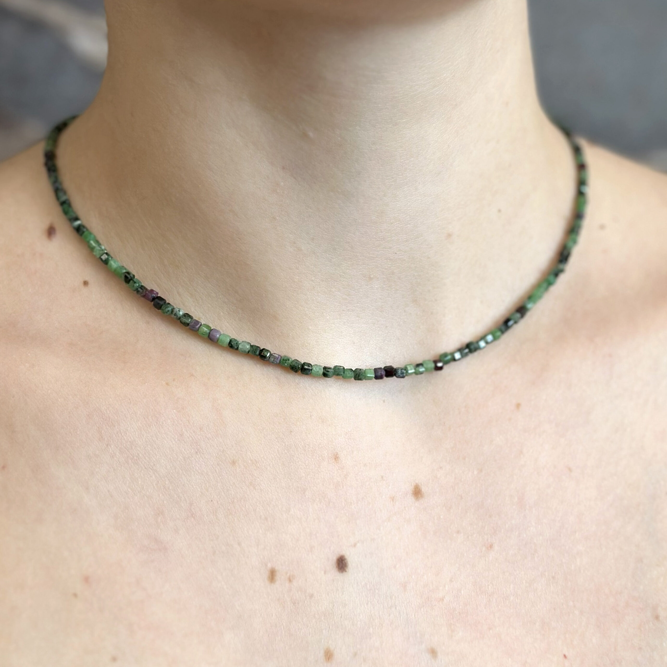 Collana Flavioro con zoisite infilata in un cavetto d’acciaio.