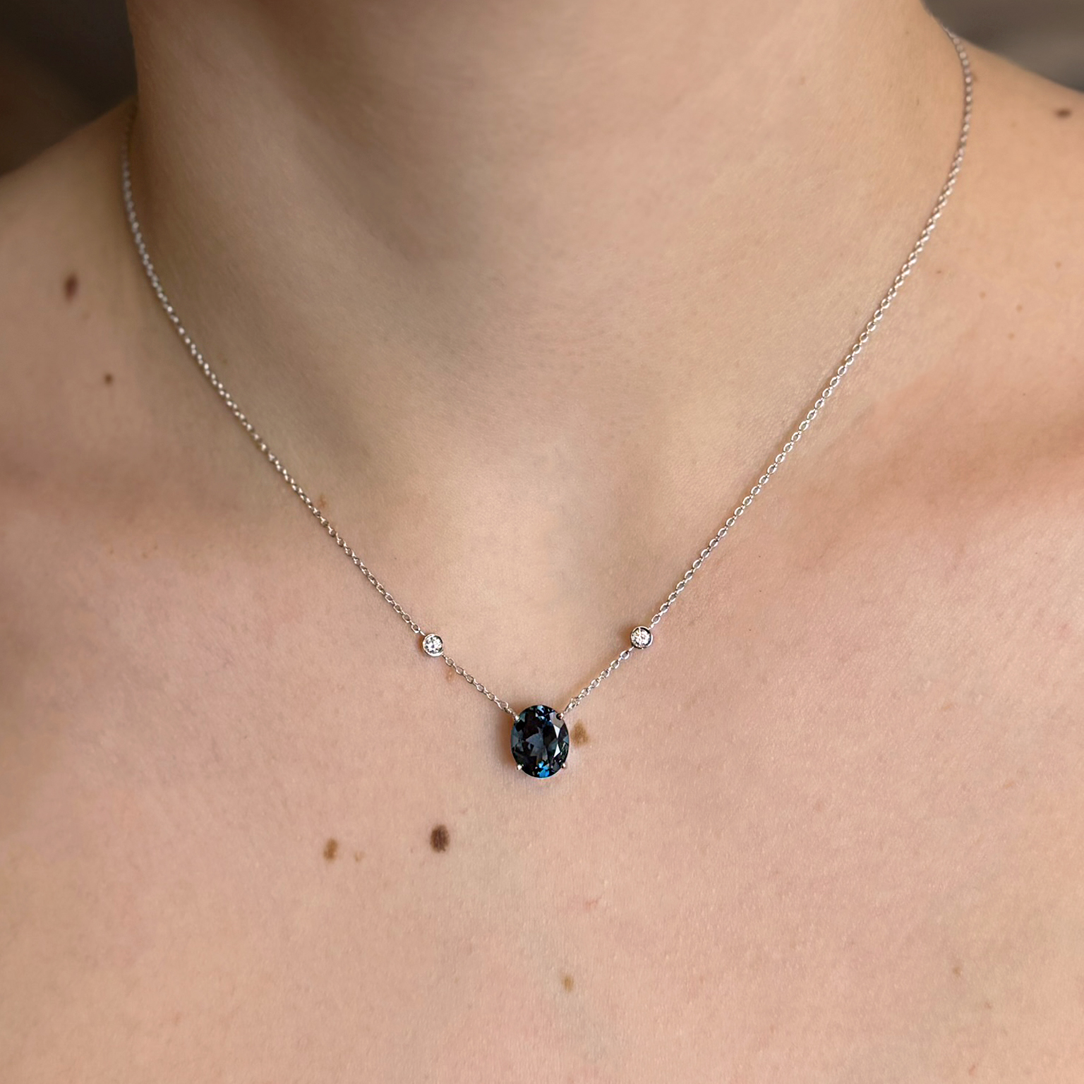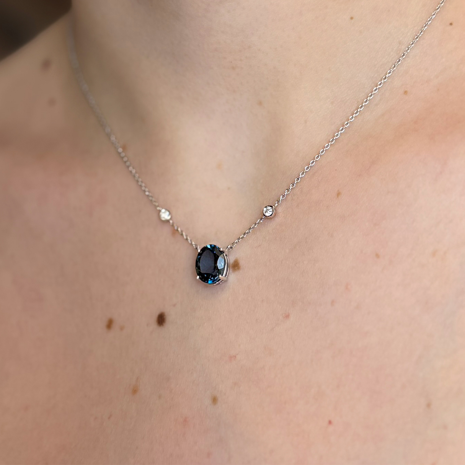 Collana in oro bianco 18kt con topazio blu london taglio ovale ct 3.32 e due diamanti taglio brillante totale ct 0.08 G VS