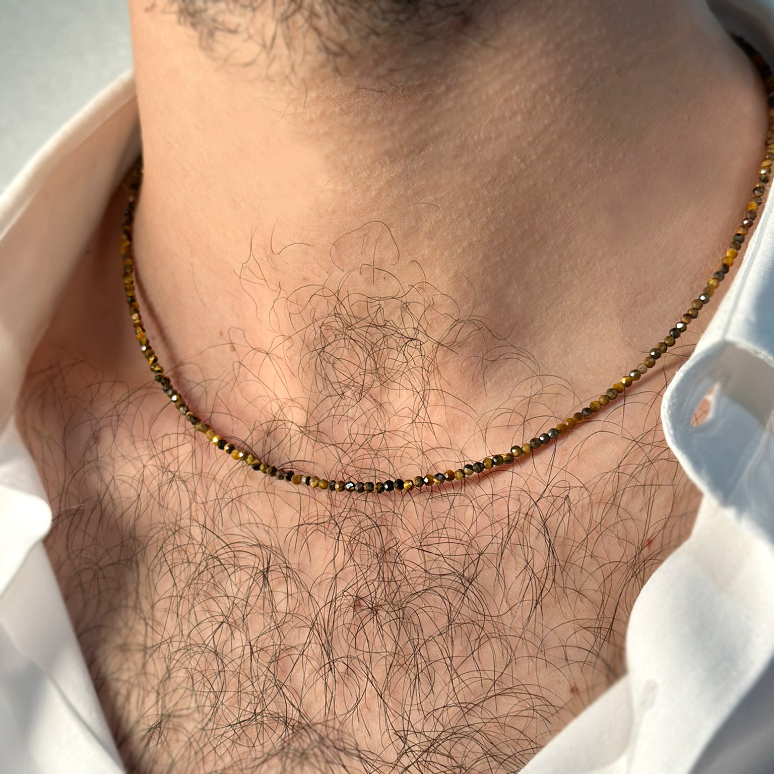 Collanaย Flavioro con occhio di tigre infilata in un cavetto dโ€™acciaio.