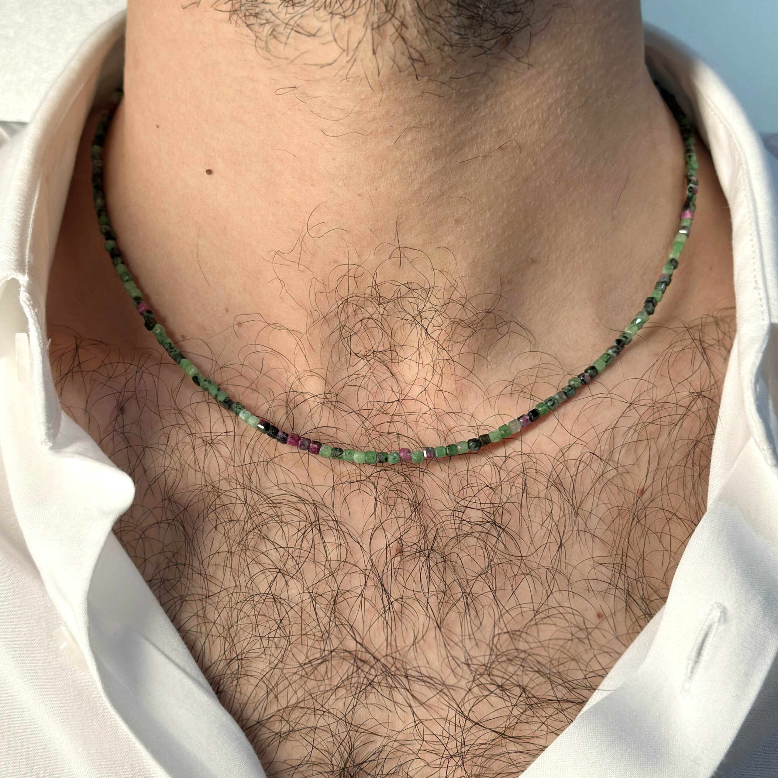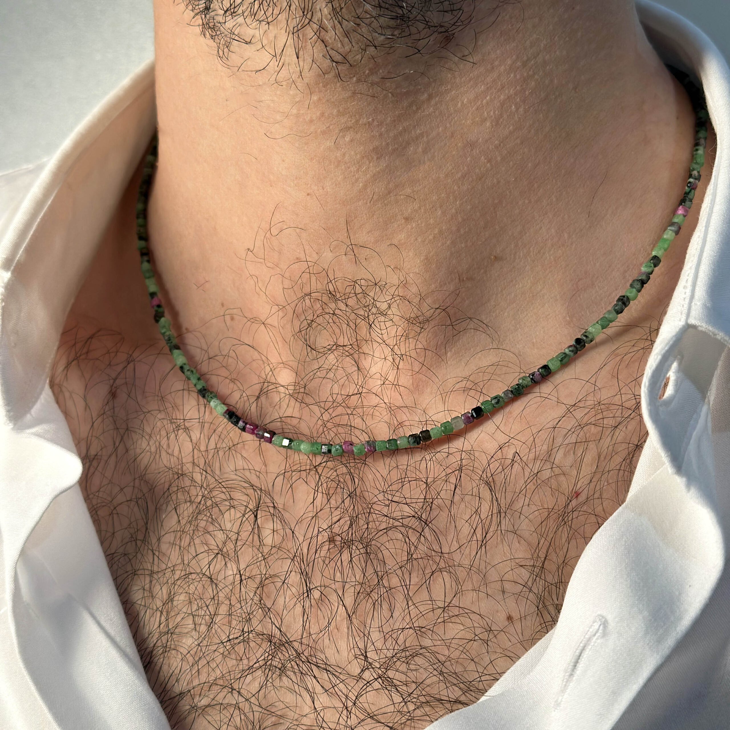 Collana Flavioro con zoisite infilata in un cavetto d’acciaio.
