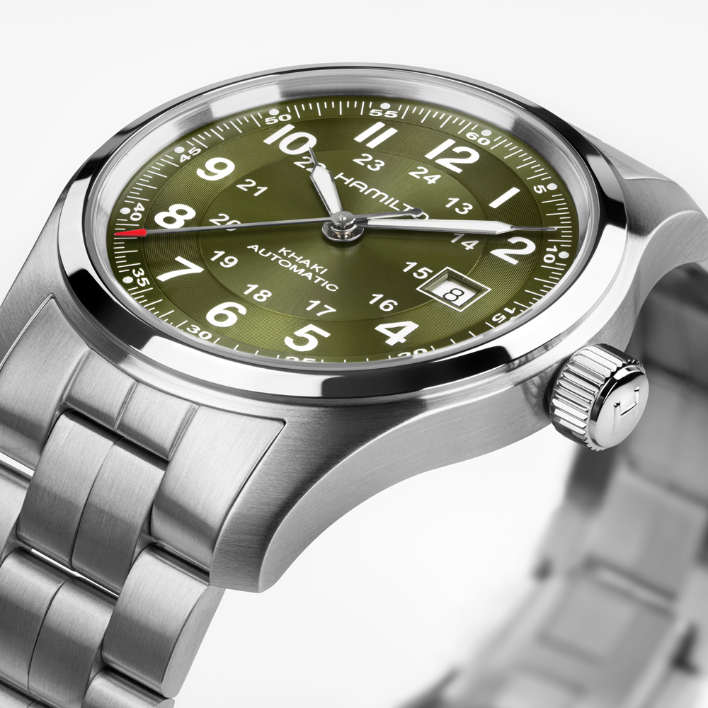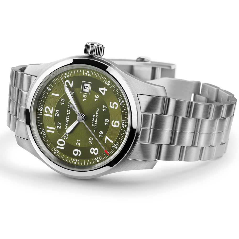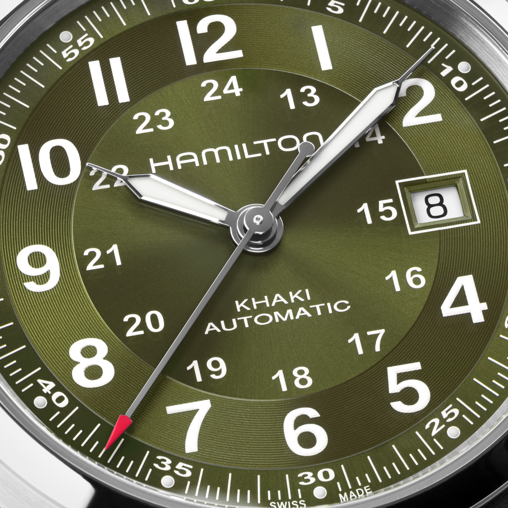 Ispirato all’originale orologio militare, il Khaki Field Automatic unisce tradizione militare e design contemporaneo in un modello versatile, pensato per i pionieri moderni. Combinando un quadrante verde kaki finitura soleil con un effetto a spirale sull’anello delle ore, il quadrante riflette la luce aggiungendo texture e profondità. Progettato per l’azione e l’avventura, l’esclusivo calibro automatico H-10 offre fino a 80 ore di riserva di carica, per un orologio che non ti deluderà mai. Scopri la nostra collezione Khaki Field.