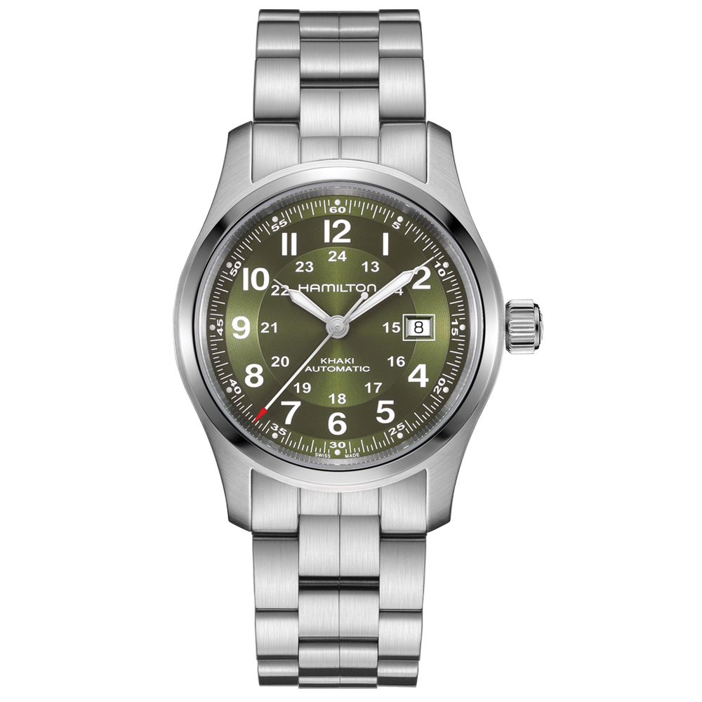 Ispirato all’originale orologio militare, il Khaki Field Automatic unisce tradizione militare e design contemporaneo in un modello versatile, pensato per i pionieri moderni. Combinando un quadrante verde kaki finitura soleil con un effetto a spirale sull’anello delle ore, il quadrante riflette la luce aggiungendo texture e profondità. Progettato per l’azione e l’avventura, l’esclusivo calibro automatico H-10 offre fino a 80 ore di riserva di carica, per un orologio che non ti deluderà mai. Scopri la nostra collezione Khaki Field.