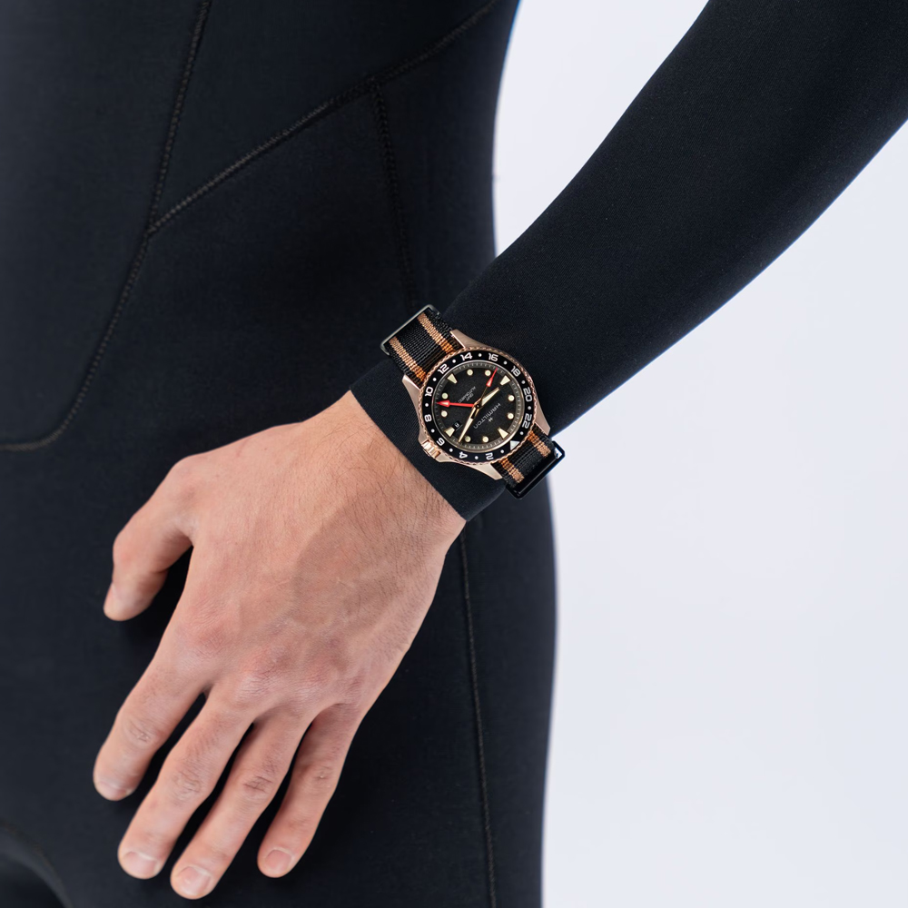 Progettato per i marinai moderni e gli inarrestabili lupi di mare, il Khaki Navy GMT Automatic è l’orologio da viaggio per eccellenza, grazie alla precisione del cronometraggio di più fusi orari. Dotato di una cassa in bronzo con cinturino NATO nero e oro, il quadrante nero è impreziosito da indici in Super-LumiNova® verde chiaro, mentre la lancetta rossa indica la funzione GMT e facilita la lettura del secondo fuso orario. Caratterizzato da un’impermeabilità fino a 30 bar, una corona a vite e una riserva di carica fino a 80 ore, il Khaki Navy GMT Automatic ti consentirà di esplorare nuovi orizzonti con sicurezza e stile. Scopri la nostra collezione Khaki Navy, creata per le avventure subacquee.