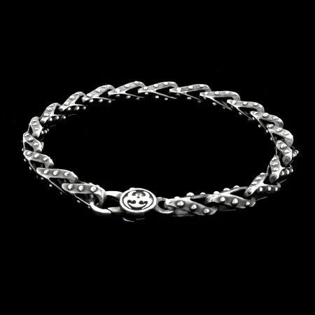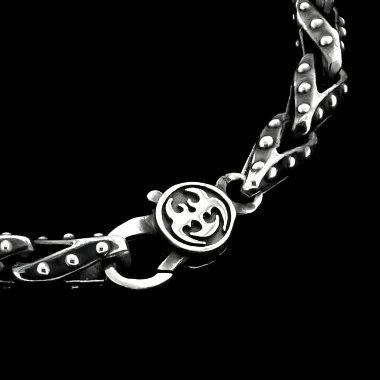 Questa spettacolare bracciale a maglie borchiate è realizzato maglia per maglia. Ogni singolo elemento è rifinito e saldato a mano al successivo in modo da formare un disegno unico ed originale. Realizzato in Argento 925 brunito e lucidato. Discreto e dettagliatissimo, un vero must.