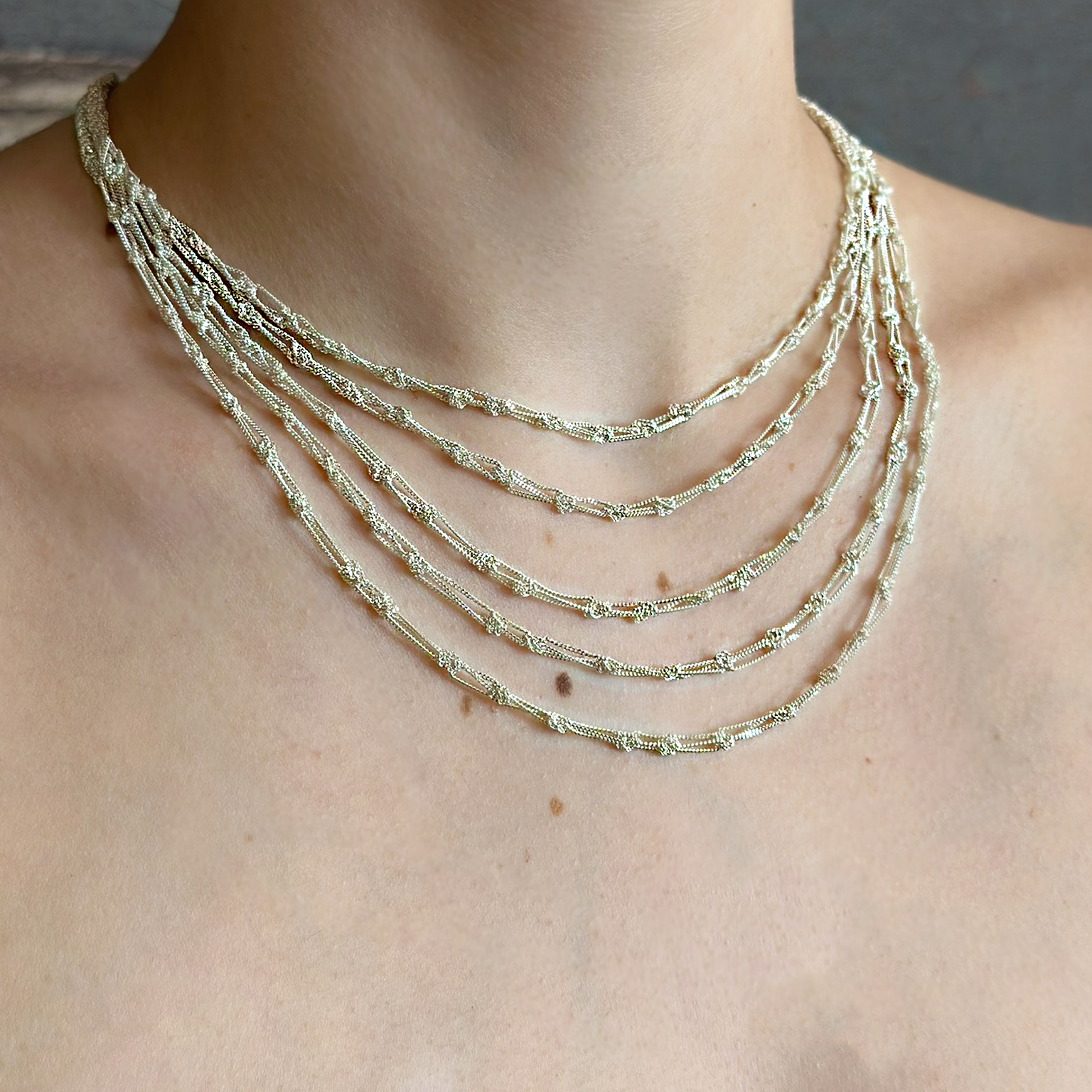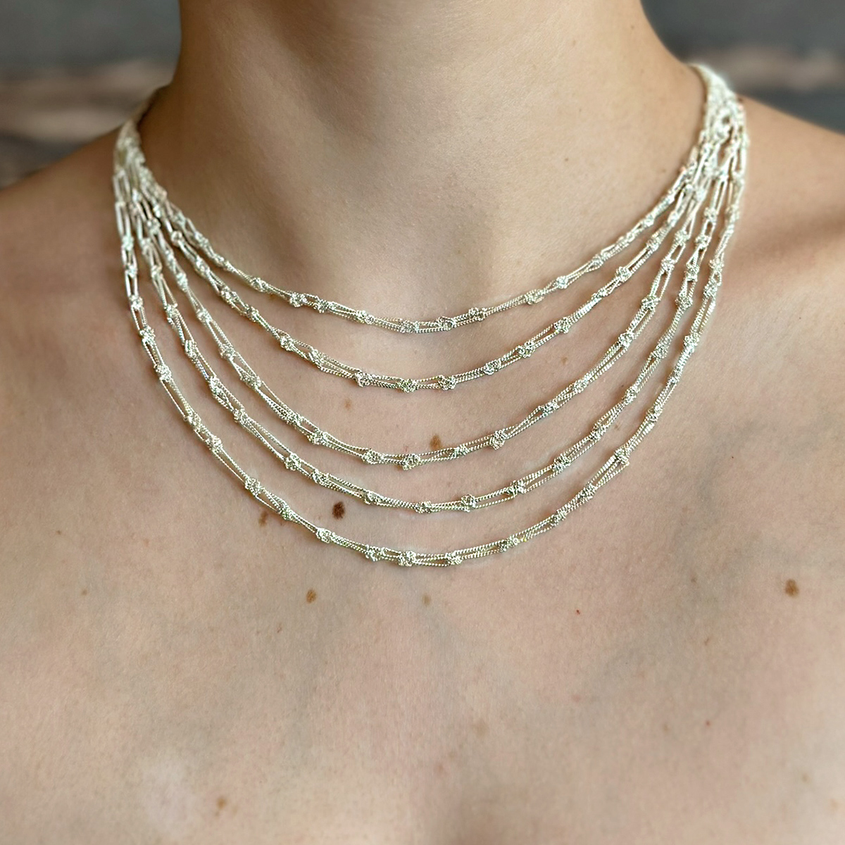 Dalla Terra del Fuoco alla Sicilia, le creazioni di Marcela Salvador seguono il fil rouge dei suoi spostamenti fisici e culturali e racchiudono tutto il knowhow del suo percorso. In virtù del suo ricco background di fashion designer specializzata nel settore della maglieria, Marcela Salvador trasferisce le sue competenze nel gioiello, ecco che realizza trame e ricami sostituendo al filato in tessuto l’argento 925.