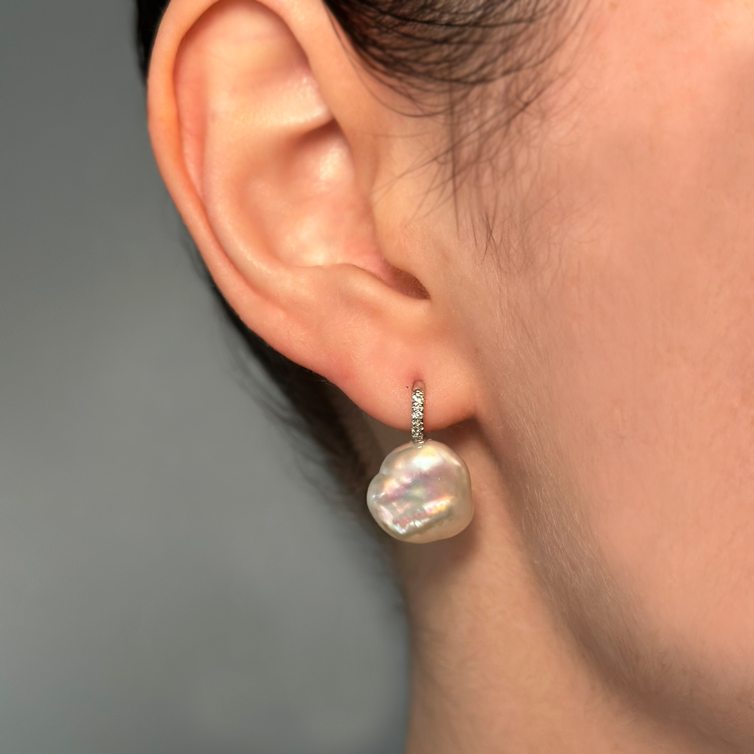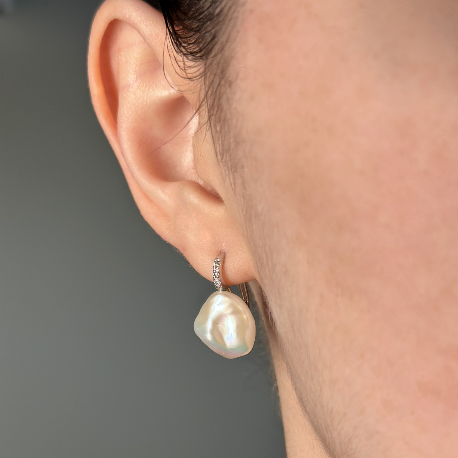 Orecchini in oro bianco 18kt a monachella con perle keshi e diamanti taglio brillante ct 0.06