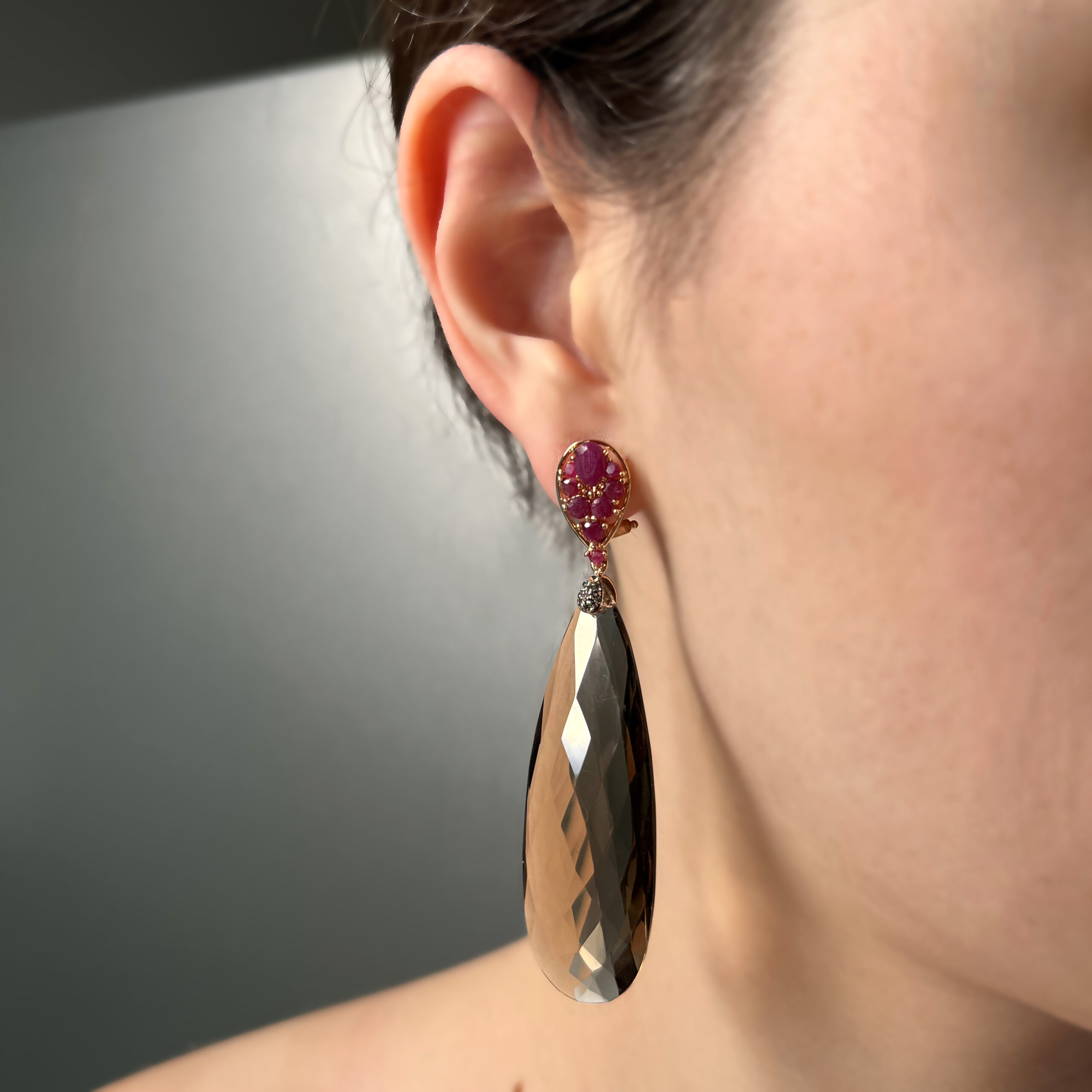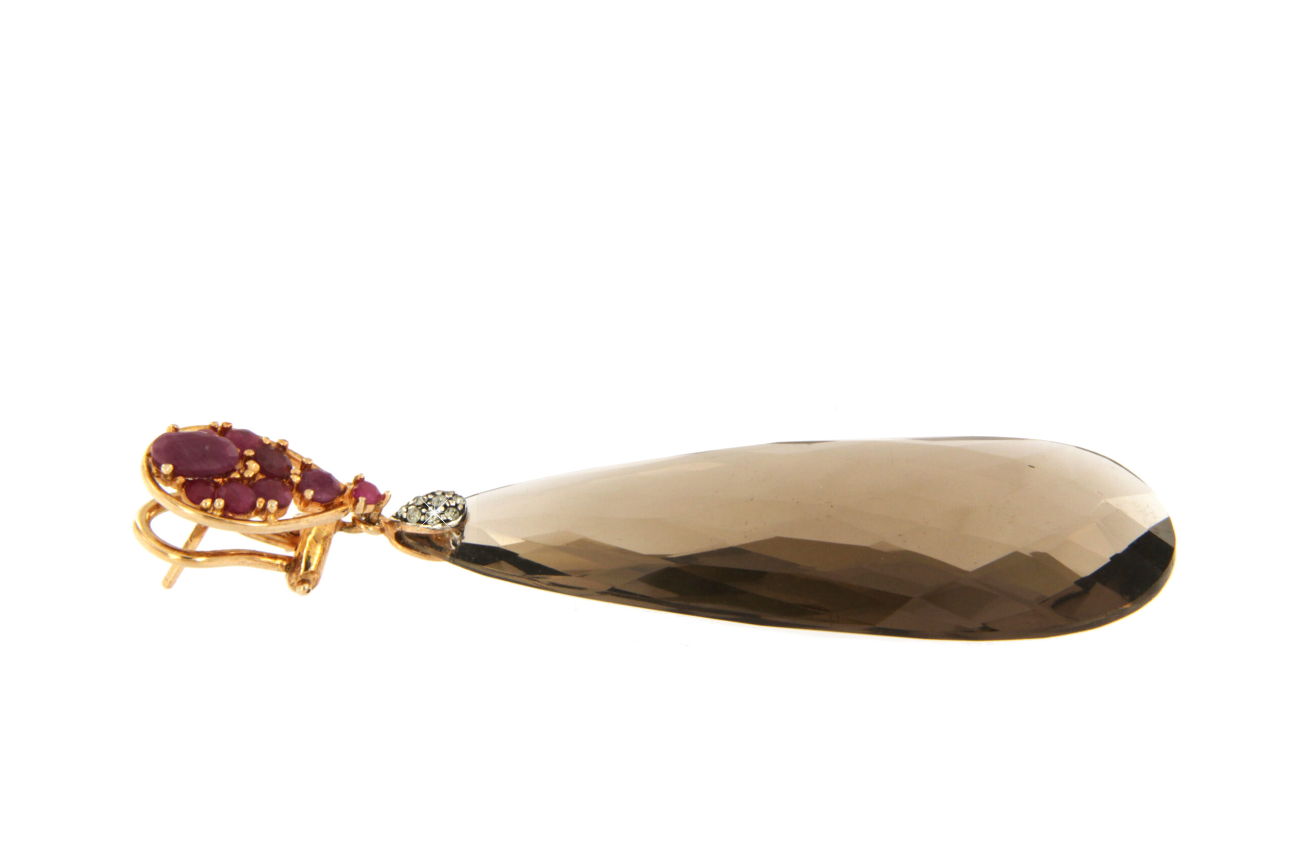 Orecchini pendenti in argento rosato 925° con quarzo, rubini e zirconi.