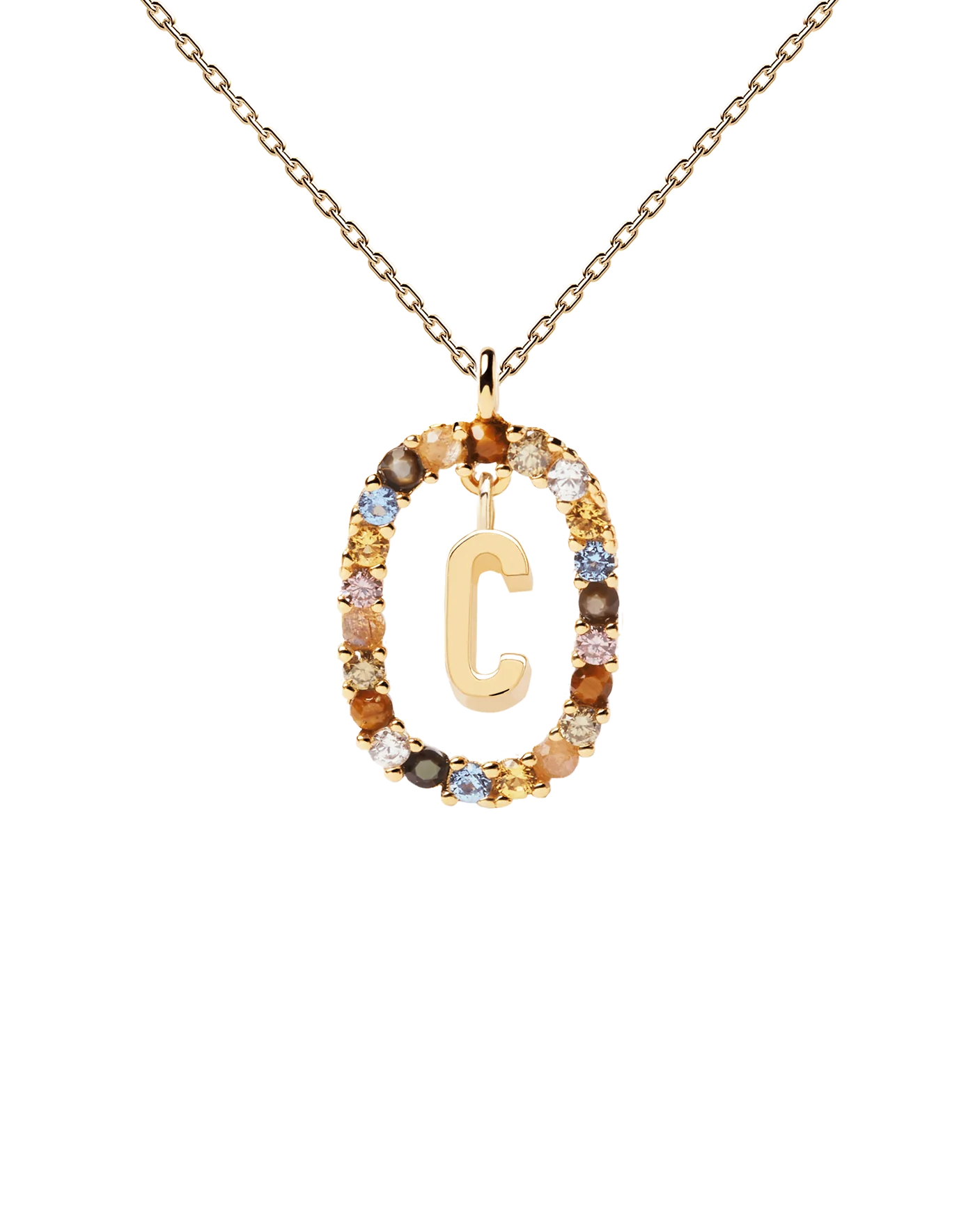 Collana con iniziale C in argento placcato oro, circondata da gemme colorate.