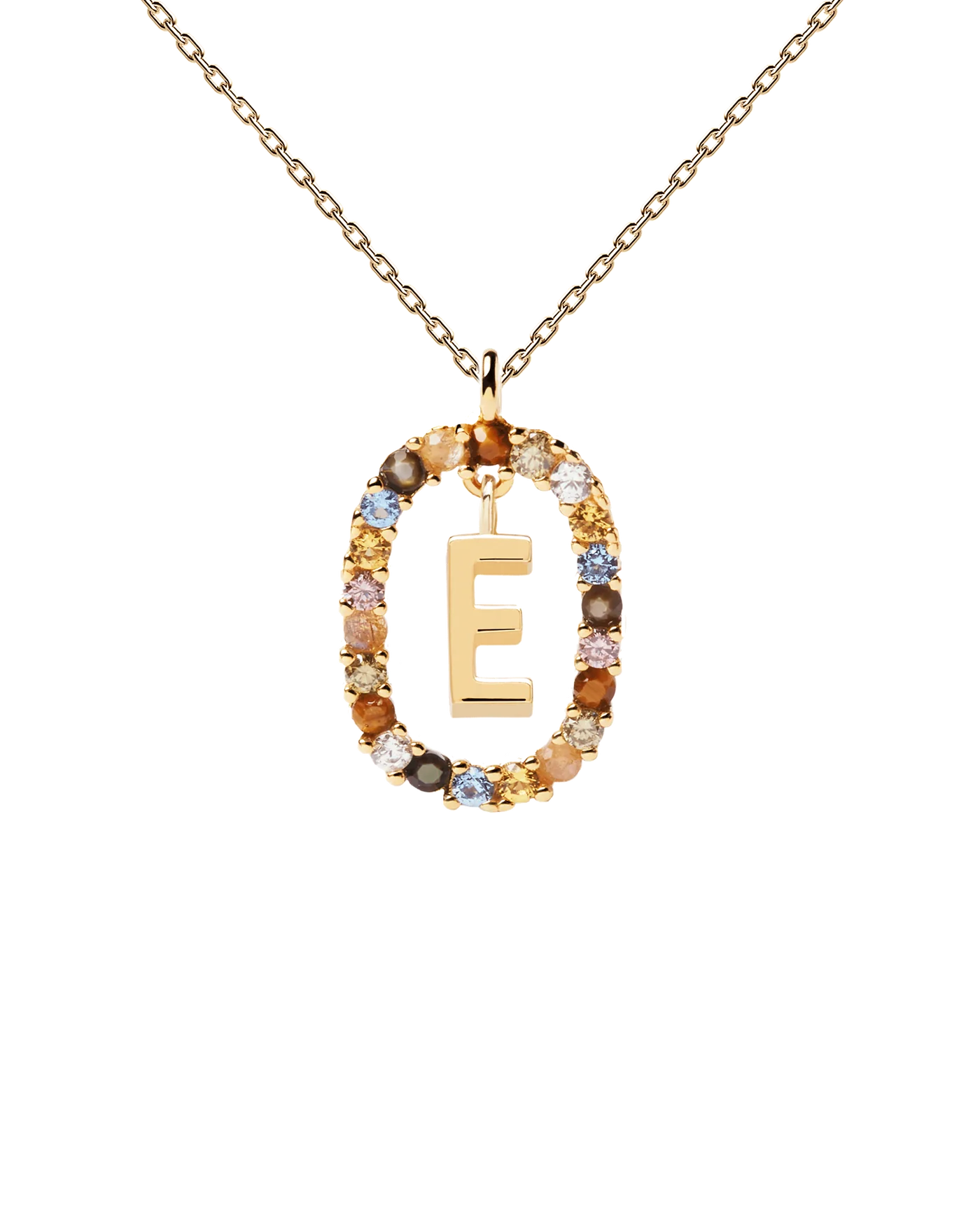 Collana con iniziale E in argento placcato oro, circondata da gemme colorate.