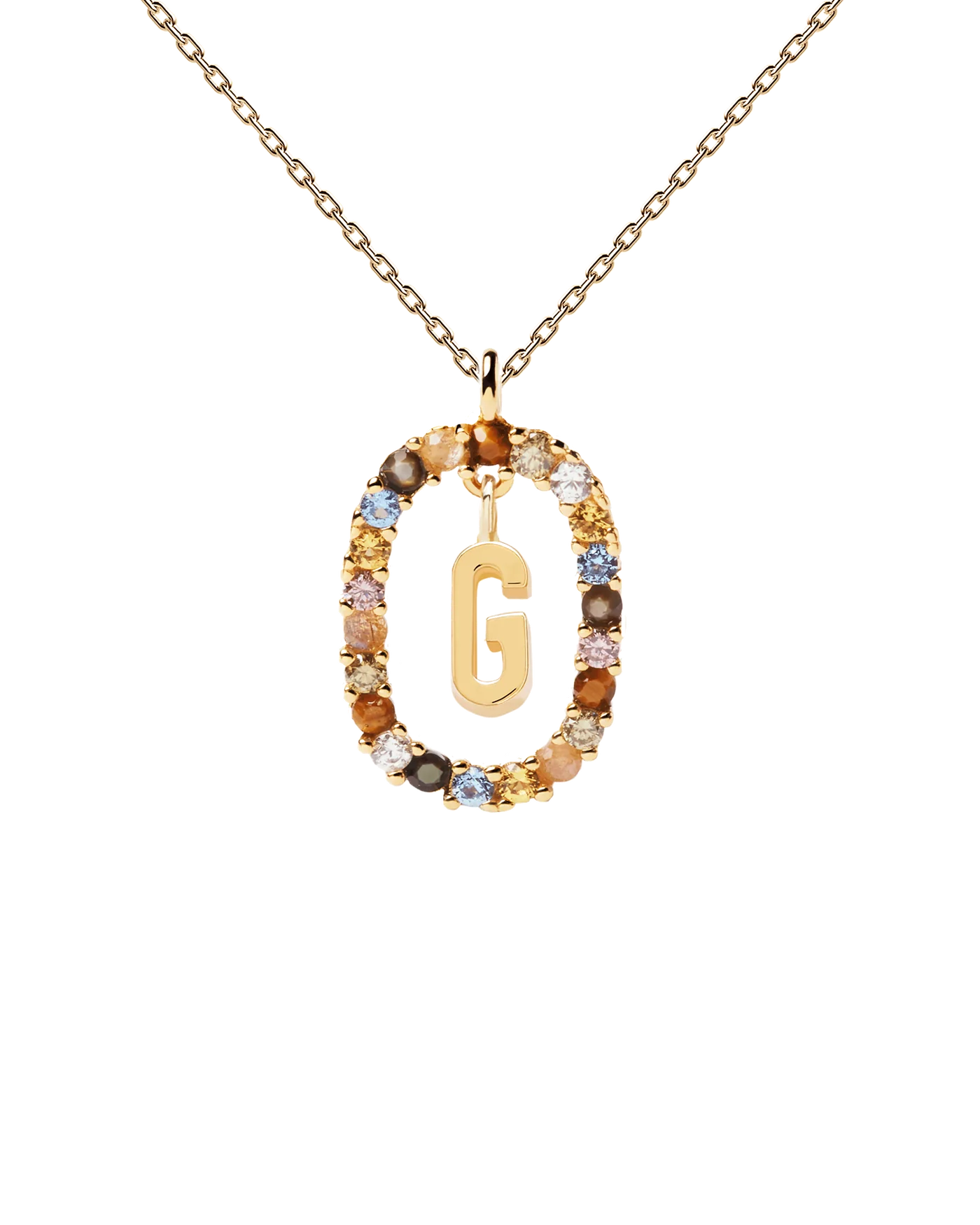 Collana con iniziale G in argento placcato oro, circondata da gemme colorate.