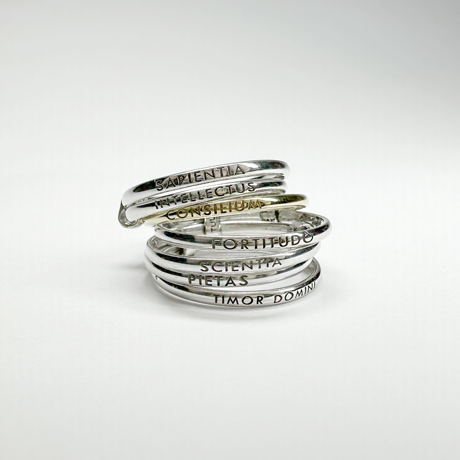 L’anello SETTEDONI è un’affascinante combinazione di armonie, di linee e di pensiero. Un anello morbido, ma anche una solida torre di valori, di doni: Sapientia, Intellectus, Consilium, Fortitudo, Scientia, Pietas e Timor Domini. Rappresenta il compiuto equilibrio tra libertà ed unione: sette fedine singole, incatenate tra loro, libere di muoversi ma forti del reciproco legame. Perfetto spettacolo dell’autodeterminazione degli individui, nella complessità e forza dell’impegno. Un gioiello ideato sia per l’uomo che per la donna.